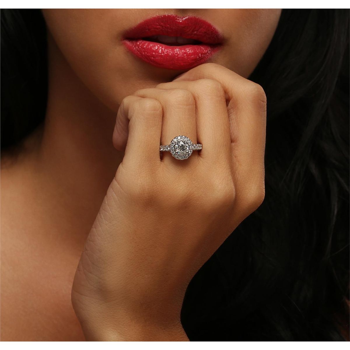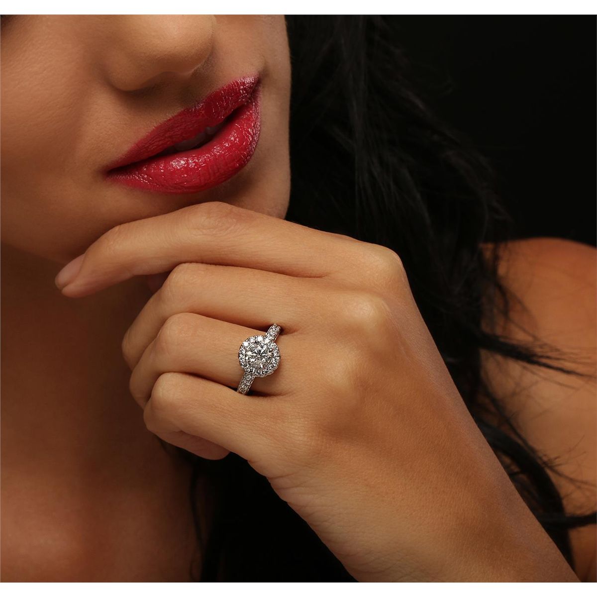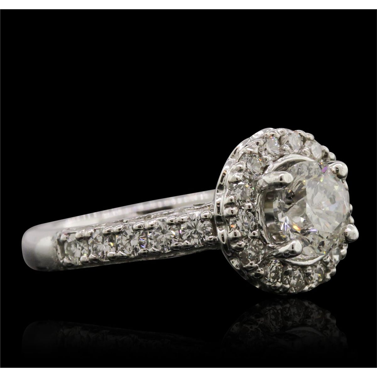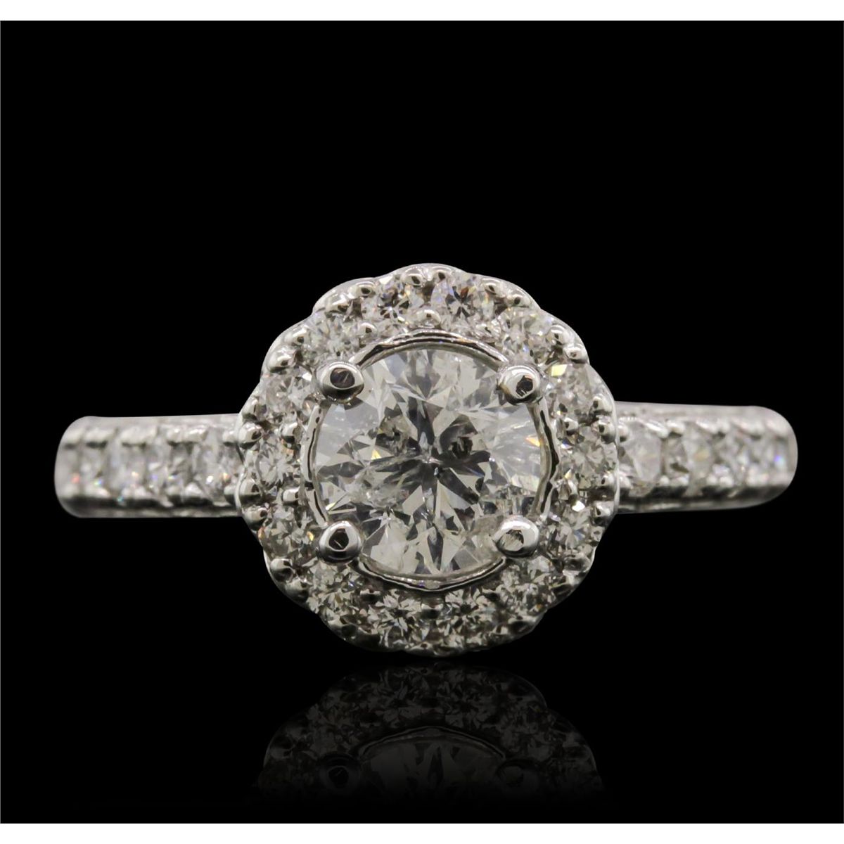 One electronically tested 14KT white gold Ladies combination cast & assembled engagement ring with a bright polish finish. Condition is new. Identified with markings of "14K". Containing: One prong set round brilliant cut diamond, measuring 6.06 - 6.02 x 3.95mm (depth est.) approximate weight of 0.98ct. Clarity: I-1. Color: G, Cut is Good. Thirty-Four prong set round brilliant cut diamonds, measuring 1.70 - 1.70 x 1.02mm (depth est.) approximate. Total Weight of 34 Stones = 0.67ct. Clarity: SI-1 to SI-3. Color: F - G, Cut is Good. EGL USA GEM ID# US 911348416D. All diamonds are graded in the mounting, unless otherwise stated. Total Weight of Diamonds 1.65ct. Total Weight of Engagement Ring 4.30 grams. GGLAppraised at $17,160.00.