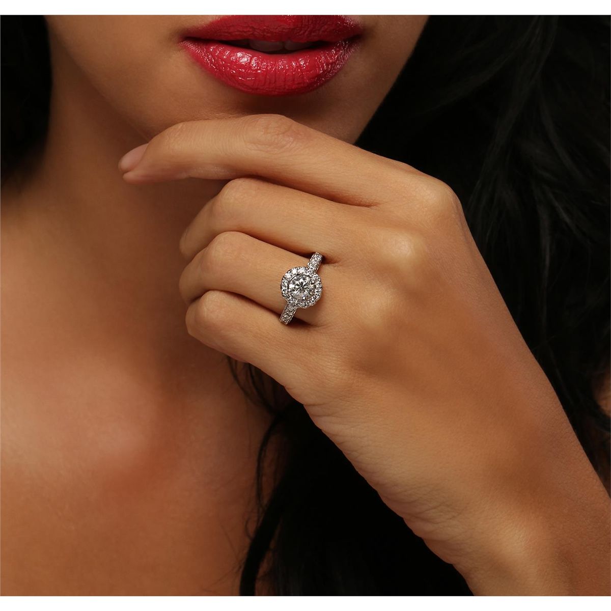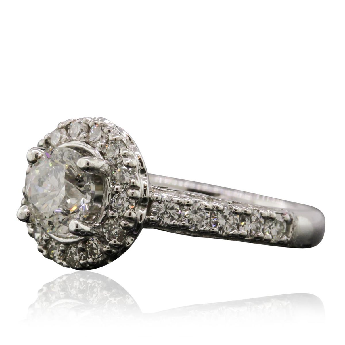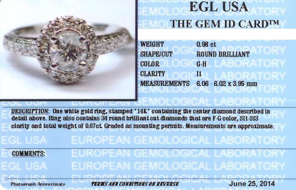 One electronically tested 14KT white gold Ladies combination cast & assembled engagement ring with a bright polish finish. Condition is new. Identified with markings of "14K". Containing: One prong set round brilliant cut diamond, measuring 6.06 - 6.02 x 3.95mm (depth est.) approximate weight of 0.98ct. Clarity: I-1. Color: G, Cut is Good. Thirty-Four prong set round brilliant cut diamonds, measuring 1.70 - 1.70 x 1.02mm (depth est.) approximate. Total Weight of 34 Stones = 0.67ct. Clarity: SI-1 to SI-3. Color: F - G, Cut is Good. EGL USA GEM ID# US 911348416D. All diamonds are graded in the mounting, unless otherwise stated. Total Weight of Diamonds 1.65ct. Total Weight of Engagement Ring 4.30 grams. GGL Appraised at $17,160.00.