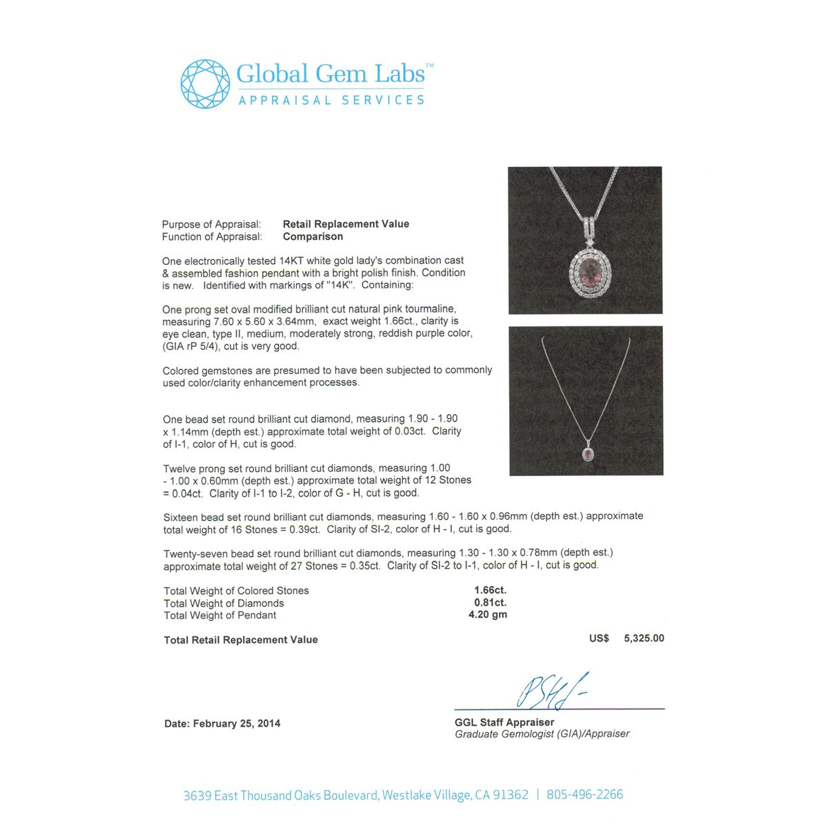 One electronically tested 14KT white gold Ladies combination cast & assembled fashion pendant with a bright polish finish. Condition is new. Identified with markings of "14K". Containing: One prong set oval modified brilliant cut natural pink tourmaline, measuring 7.60 x 5.60 x 3.64mm, exact weight 1.66ct., clarity is eye clean, type II, medium, moderately strong, reddish purple color, (GIA rP 5/4), cut is very good. Colored gemstones are presumed to have been subjected to commonly used color/clarity enhancement processes. One bead set round brilliant cut diamond, measuring 1.90 - 1.90 x 1.14mm (depth est.) approximate. Total Weight of 0.03ct. Clarity: I-1. Color: H, Cut is Good. Twelve prong set round brilliant cut diamonds, measuring 1.00 - 1.00 x 0.60mm (depth est.) approximate. Total Weight of 12 Stones = 0.04ct. Clarity: I-1 to I-2. Color: G - H, Cut is Good. Sixteen bead set round brilliant cut diamonds, measuring 1.60 - 1.60 x 0.96mm (depth est.) approximate. Total Weight of 16 Stones = 0.39ct. Clarity: SI-2. Color: H - I, Cut is Good. Twenty-Seven bead set round brilliant cut diamonds, measuring 1.30 - 1.30 x 0.78mm (depth est.) approximate. Total Weight of 27 Stones = 0.35ct. Clarity: SI-2 to I-1. Color: H - I, Cut is Good. Total Weight of Colored Stones 1.66ct. Total Weight of Diamonds 0.81ct. Total Weight of Pendant 4.20 grams. GGL Appraised at $5,325.00.