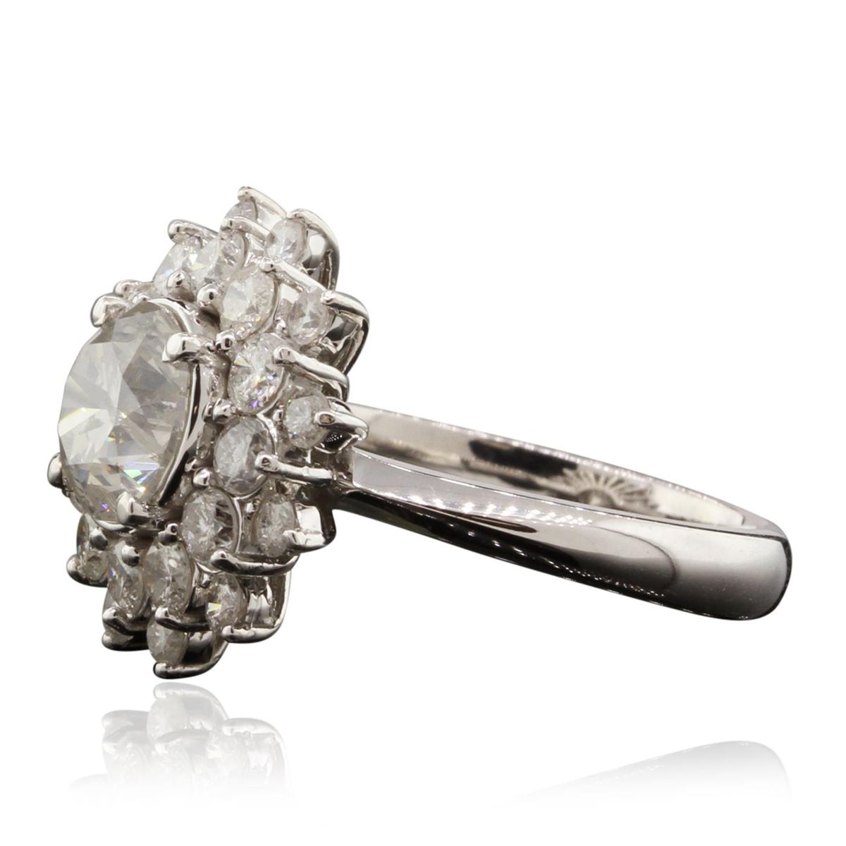 One electronically tested 14KT White Gold ladies cast diamond ring with a bright polish finish. Condition is new, good workmanship. The featured diamond is set within a diamond floret bezel supported by tapering shoulders, completed by a three millimeter wide band. Identified with markings of "585". Containing: One prong set round brilliant cut diamond, measuring 7.20 - 7.15 x 4.70mm (depth est.), 10.00%. GTCF approximate weight of 1.66ct with a faint yellow fluorescence. Graded in the setting. Clarity: I-1. Color: J Depth: 65.5%. Table 58.5%. Twenty-Four prong set round brilliant cut diamonds, measuring 2.60 - 2.10 x 1.41mm (depth est.) approximate. Total Weight of 24 Stones = 1.26ct. Graded in the setting. Clarity: I-1 to I-2. Color: G - I. Total Weight of Diamonds 2.92ct. Total Weight of Ring 6.07gm. AIG Appraised at $28,145.00.