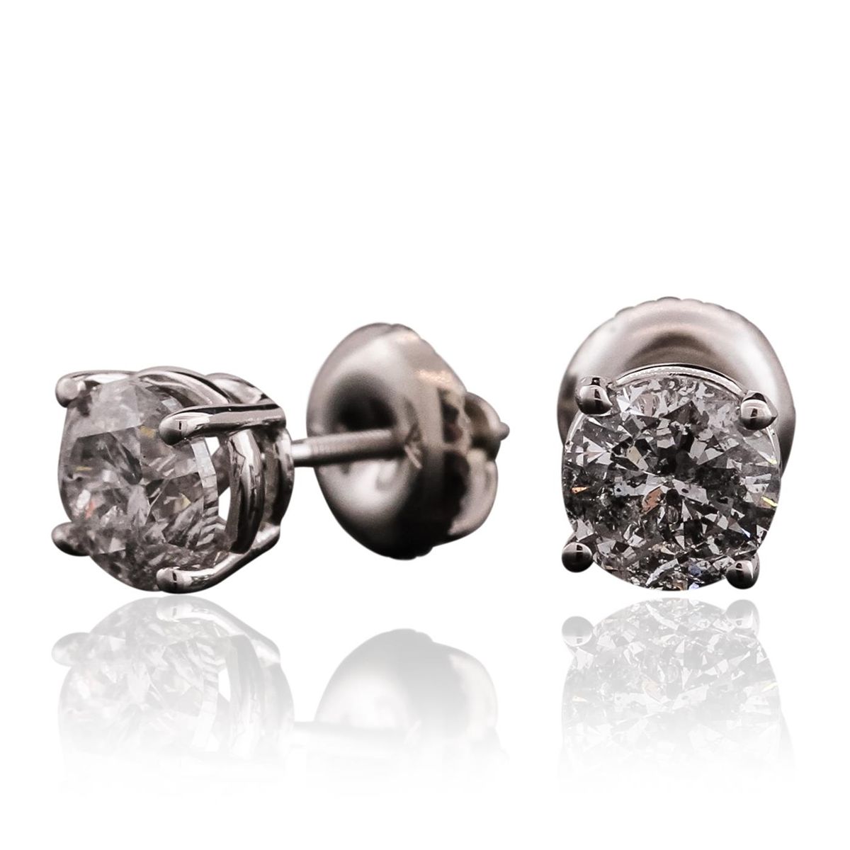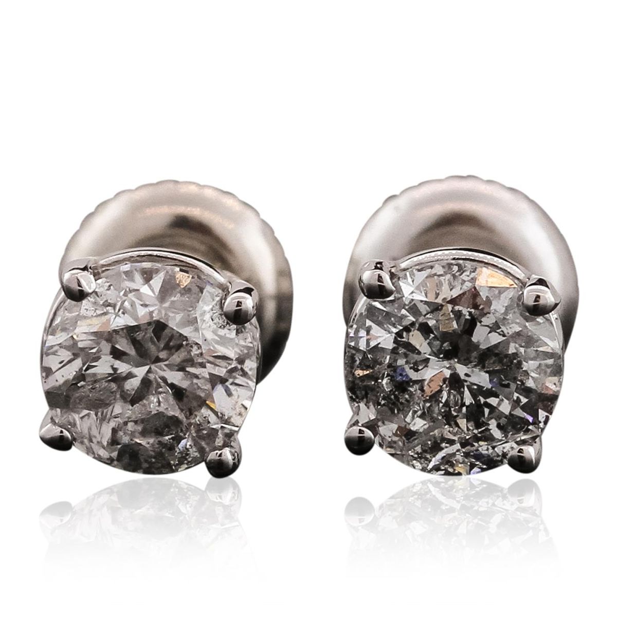 One pair electronically tested 14KT white gold cast & assembled diamond solitaire earrings with standard backs. Bright polish finish. Condition is new, good workmanship. Containing: One prong set round brilliant cut diamond, measuring 5.70 - 5.65 x 3.35mm (depth est.), 3.00% GTCF approximate weight of 0.77ct with a medium blue fluorescence. Graded in the setting. Clarity: I-1. Color: I. Depth 59.0%. Table 63.4%. One prong set round brilliant cut diamond, measuring 5.60 - 5.55 x 4.00mm (depth est.), 4.00% GTCF approximate weight of 0.89ct. Graded in the setting. Clarity: I-1. Color: I. Depth 71.8%. Table 62.8%. Total Weight of Diamonds 1.66ct. Total Weight of Earrings 1.27 grams. AIG Appraised at $11,135.00.