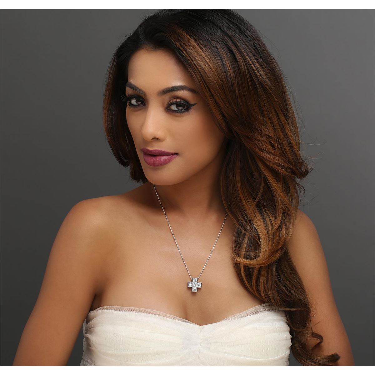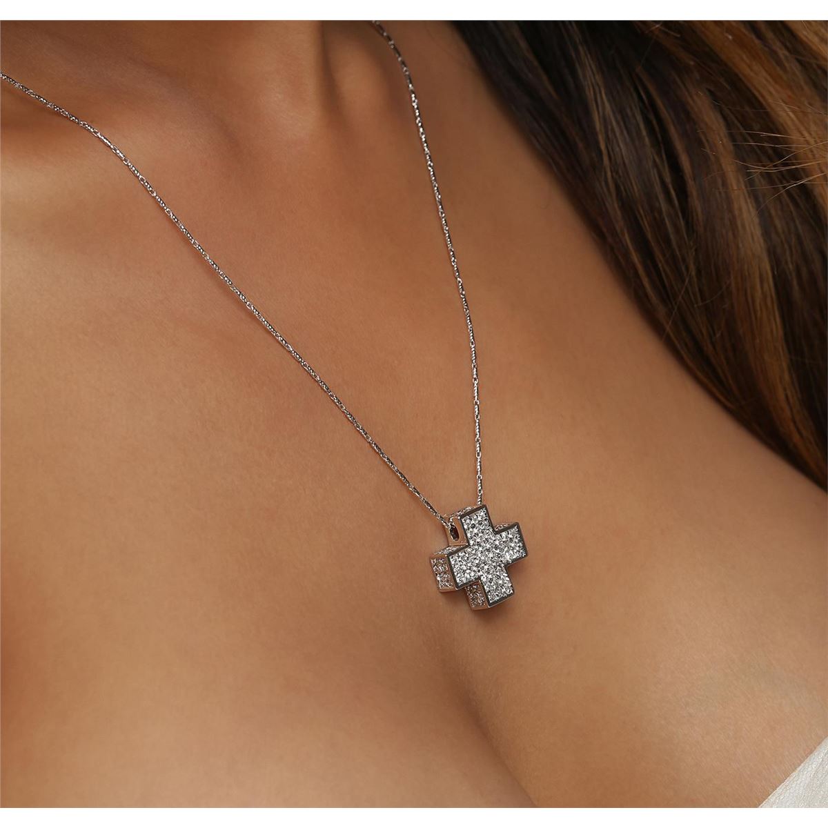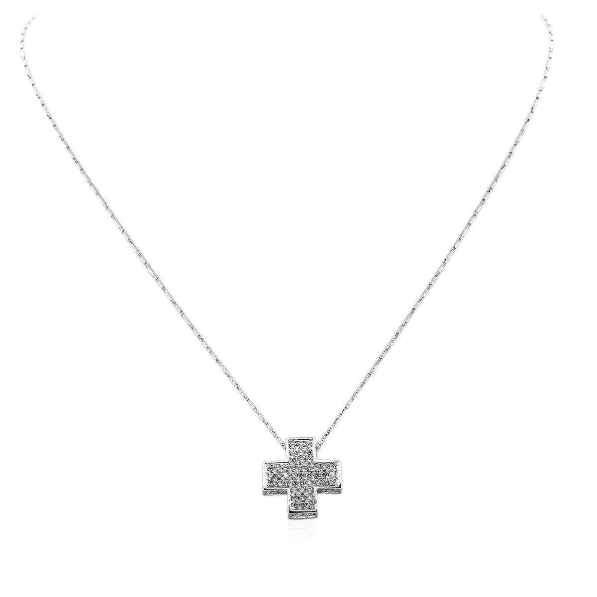 One electronically tested 14KT white gold ladies combination cast & assembled cross pendant & chain 18.0" long, medium fancy link with a lobster claw clasp with a bright polish finish. Identified with markings of "14K". Condition is new. Containing: Ninety-Three prong set round brilliant cut diamonds, measuring 1.80 - 1.60 x 1.02mm (depth est.) approximate total weight of 93 Stones = 1.67ct. Clarity: SI-1 to SI-2. Color: I - J, Cut is Good. All diamonds are graded in the mounting, unless otherwise stated. Total Weight of Diamonds 1.67ct. Total Weight of Pendant & Chain 8.30 grams. GGL Appraised at $6,120.00.