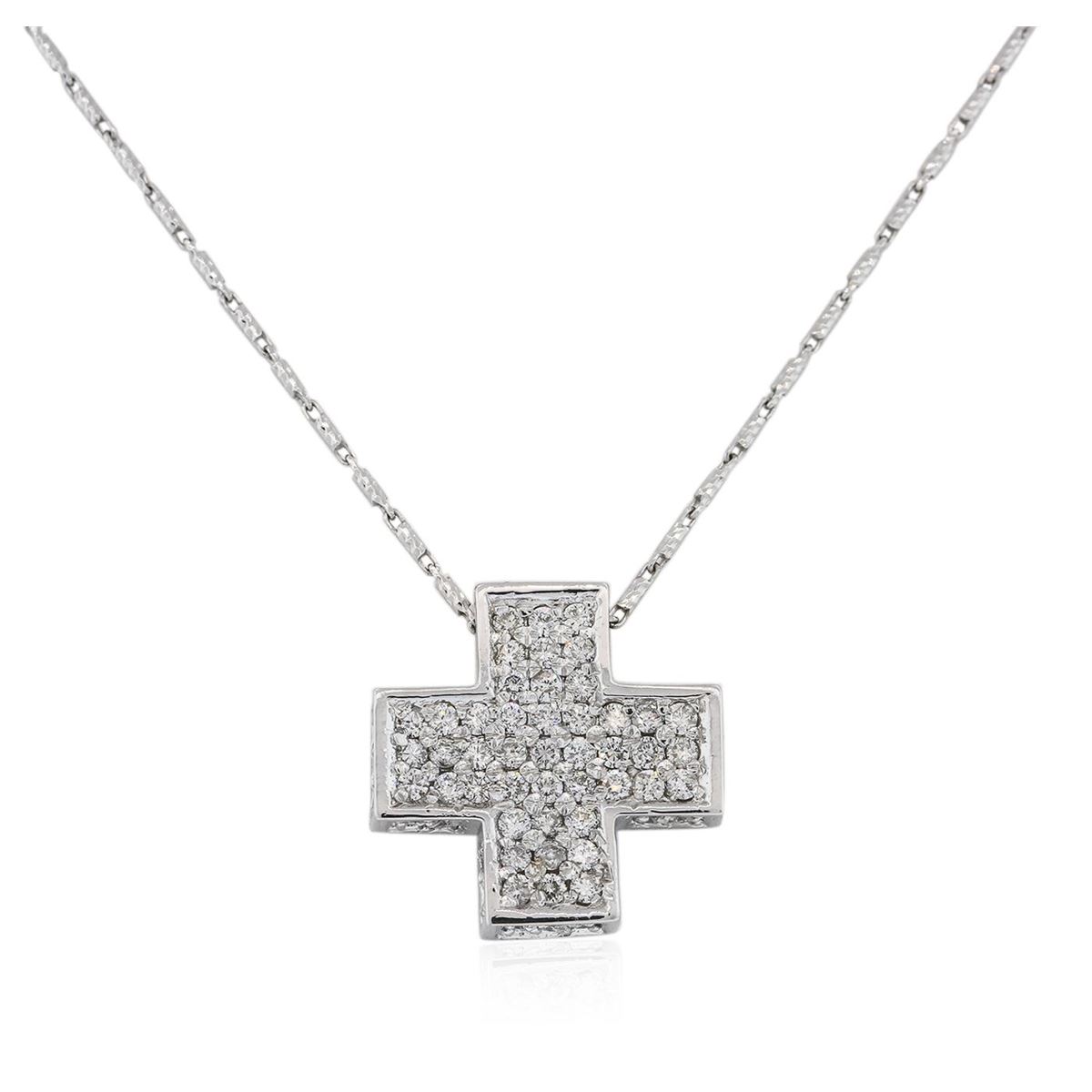 One electronically tested 14KT white gold ladies combination cast & assembled cross pendant & chain 18.0" long, medium fancy link with a lobster claw clasp with a bright polish finish. Identified with markings of "14K". Condition is new. Containing: Ninety-Three prong set round brilliant cut diamonds, measuring 1.80 - 1.60 x 1.02mm (depth est.) approximate total weight of 93 Stones = 1.67ct. Clarity: SI-1 to SI-2. Color: I - J, Cut is Good. All diamonds are graded in the mounting, unless otherwise stated. Total Weight of Diamonds 1.67ct. Total Weight of Pendant & Chain 8.30 grams. GGL Appraised at $6,120.00.