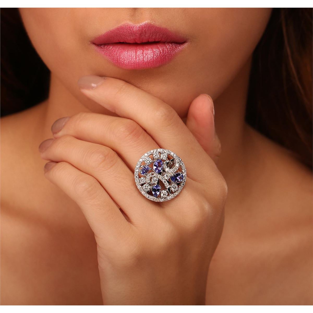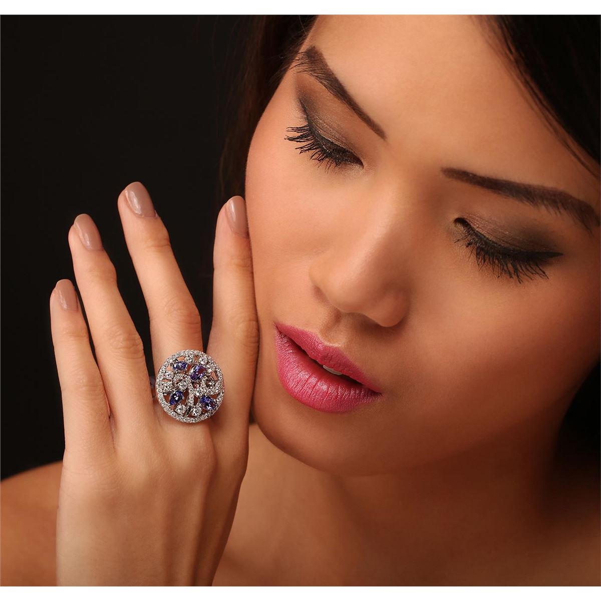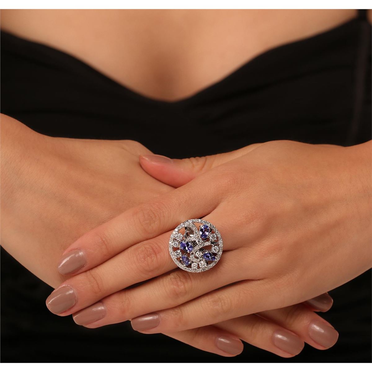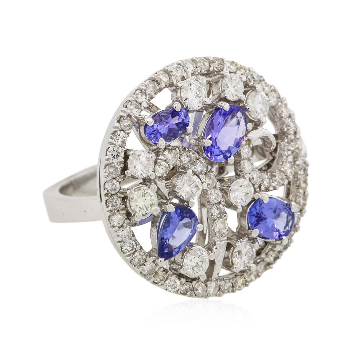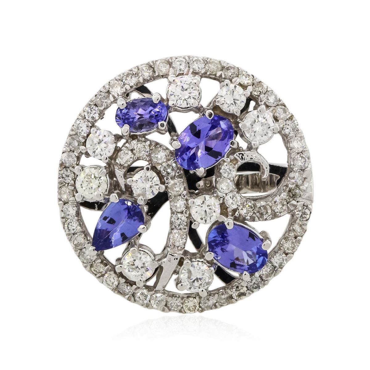 One electronically tested 14KT white gold ladies cast tanzanite and diamond ring with a bright polish finish. Condition is new, good workmanship. The ring features a bouquet of tanzanite and diamonds, completed by a three millimeter wide band. Identified with markings of "K14". Containing: Four prong set pear and oval mixed cut natural tanzanites approximate. Total Weight of 1.67ct., clarity is eye clean, type I, medium dark, very slightly grayish, bluish violet color, (GIA bV 6/3), cut is good. Transmitting light with no distortion, transparent. Color grade is an average for the group. Graded in the setting. Tanzanite is a very rare gemstone that is only found in the country of Tanzania. Originally discovered in 1967. Tiffany & Company, named the stone Tanzanite. It is found in the Usumburu Mountains that border the Umba Valley of northern Tanzania. Tanzanite occurs in gray, brown, violet, blue, reddish-purple, & green. The gem is interesting because of its exceptional pleochroism. Rotated in different directions a tanzanite will exhibit multiple changes of color. Tanzanite has a low tolerance to ultrasonic cleaning, and should not be cleaned using this method. Nine prong set round brilliant cut diamonds, measuring 2.90 - 2.70 x 1.68mm (depth est.) approximate. Total Weight of 9 Stones = 0.83ct. Graded in the setting. Clarity: SI-2 to I-1 . Color: F - H Fifty-Eight prong set round brilliant cut diamonds, measuring 1.60 - 1.50 x 0.93mm (depth est.) approximate. Total Weight of 58 Stones = 0.88ct. Graded in the setting. Clarity: SI-2 to I-2 . Color: F - H. Total Weight of Colored Stones 1.67ct.. Total Weight of Diamonds 1.71ct.. Total Weight of Ring 9.80gm. AIG Appraised at $8,440.00.