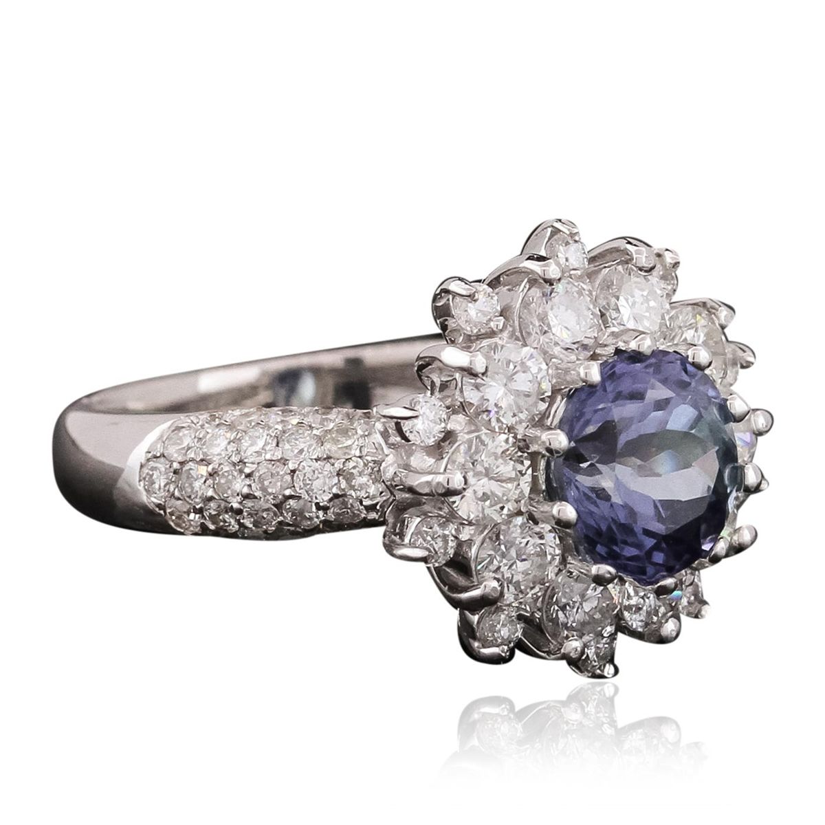 One electronically tested 14KT white gold ladies combination cast & assembled ring with a bright polish finish. Identified with markings of "585". Condition is new. Containing: One prong set round modified brilliant cut natural tanzanite, measuring 7.28 - 7.21 x 4.71 mm, approximate weight of 1.67ct., clarity is eye clean, type I, medium dark, very slightly grayish, violet color, (GIA V 6/3), cut is good. Sixty-Two prong set round brilliant cut diamonds, measuring 1.30 - 1.30 x 0.78mm (depth est.) approximate total weight of 62 Stones = 0.50ct. Clarity: SI-2 to I-1. Color: I - J, Cut is Good. Ten prong set round brilliant cut diamonds, measuring 2.80 - 2.80 x 1.68mm (depth est.) approximate total weight of 10 Stones = 0.80ct. Clarity: I-1. Color: J, Cut is Good. Colored gemstones are presumed to have been subjected to commonly used enhancement processes. All diamonds and colored gemstones are graded in the mounting, unless otherwise stated. Total Weight of Colored Stones 1.67ct. Total Weight of Diamonds 1.30ct. Total Weight of Ring 5.50 grams. GGL Appraised at $7,215.00.