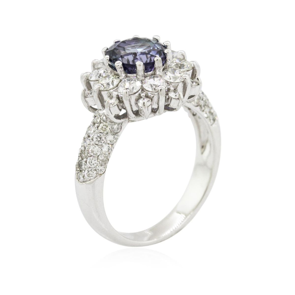 One electronically tested 14KT white gold ladies combination cast & assembled ring with a bright polish finish. Identified with markings of "585". Condition is new. Containing: One prong set round modified brilliant cut natural tanzanite, measuring 7.28 - 7.21 x 4.71 mm, approximate weight of 1.67ct., clarity is eye clean, type I, medium dark, very slightly grayish, violet color, (GIA V 6/3), cut is good. Sixty-Two prong set round brilliant cut diamonds, measuring 1.30 - 1.30 x 0.78mm (depth est.) approximate total weight of 62 Stones = 0.50ct. Clarity: SI-2 to I-1. Color: I - J, Cut is Good. Ten prong set round brilliant cut diamonds, measuring 2.80 - 2.80 x 1.68mm (depth est.) approximate total weight of 10 Stones = 0.80ct. Clarity: I-1. Color: J, Cut is Good. Colored gemstones are presumed to have been subjected to commonly used enhancement processes. All diamonds and colored gemstones are graded in the mounting, unless otherwise stated. Total Weight of Colored Stones 1.67ct. Total Weight of Diamonds 1.30ct. Total Weight of Ring 5.50 grams. GGL Appraised at $7,215.00.