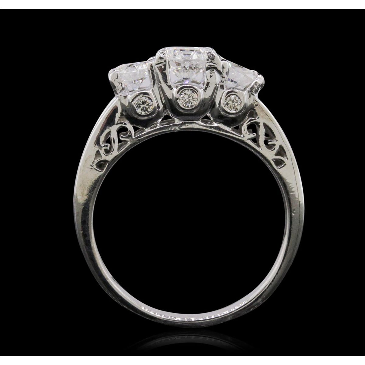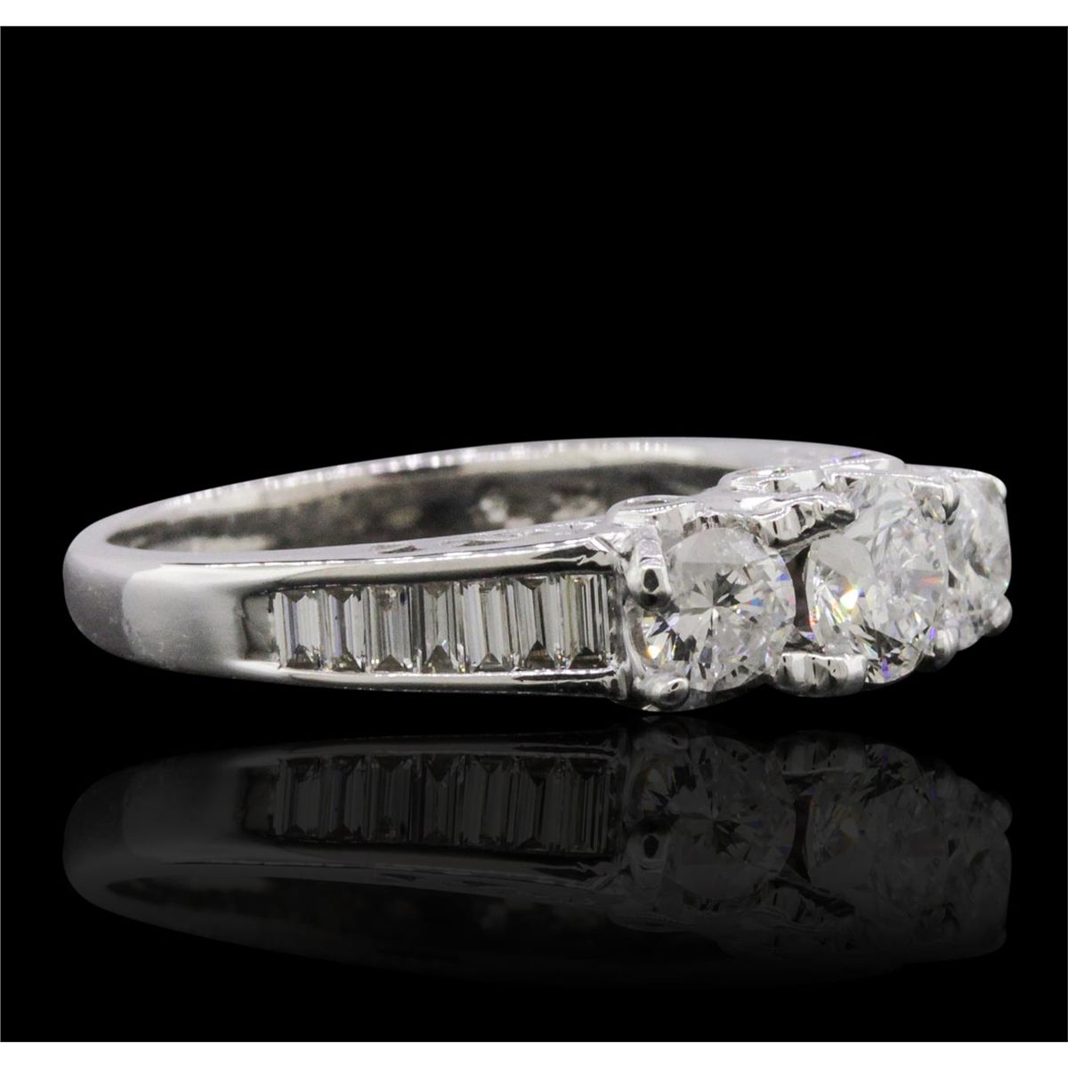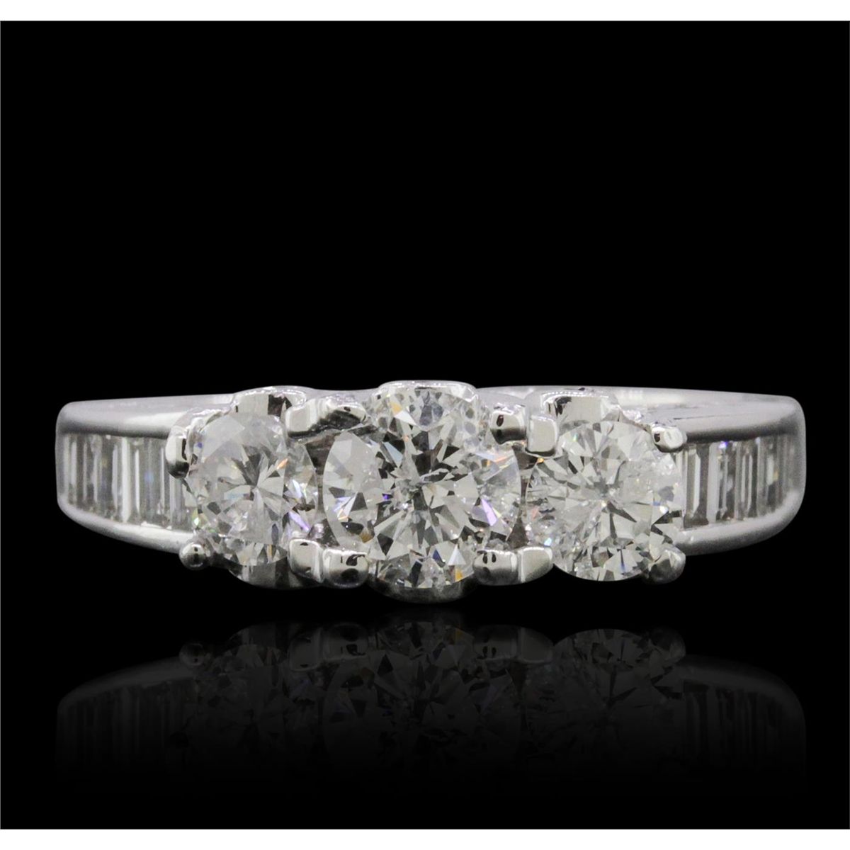 One electronically tested 14KT white gold ladies combination cast & assembled engagement ring with a flat shank with a bright polish finish. Identified with markings of "14K". Condition is new. Containing: One prong set round brilliant cut diamond, measuring 5.35 - 5.34 x 3.04mm (depth est.) approximate weight of 0.53ct. Clarity: I-1. Color: J, Cut is Good. Two prong set round brilliant cut diamonds, measuring 4.38 - 4.37 x 2.62mm (depth est.) approximate total weight of 2 Stones = 0.61ct. Clarity: I-1. Color: I, Cut is Good. Six bezel set round brilliant cut diamonds, measuring 1.70 - 1.70 x 1.02mm (depth est.) approximate total weight of 6 Stones = 0.11ct. Clarity: SI-1. Color: I - J, Cut is Good. Fourteen channel set baguette cut diamonds, measuring from 2.00 x 1.10 x 0.94mm (depth est.) to 2.50 x 1.50 x 1.28mm (depth est.) approximate total weight of 14 Stones = 0.42ct. Clarity: VS-2. Color: I - J, Cut is Good. All diamonds are graded in the mounting, unless otherwise stated. Total Weight of Diamonds 1.67ct. Total Weight of Ring 5.20 grams. GGL Appraised at $9,340.00. AIG Appraised at $27,465.00.