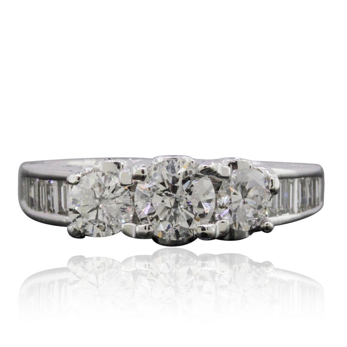 One electronically tested 14KT white gold ladies combination cast & assembled engagement ring with a flat shank with a bright polish finish. Identified with markings of "14K". Condition is new. Containing: One prong set round brilliant cut diamond, measuring 5.35 - 5.34 x 3.04mm (depth est.) approximate weight of 0.53ct. Clarity: I-1. Color: J, Cut is Good. Two prong set round brilliant cut diamonds, measuring 4.38 - 4.37 x 2.62mm (depth est.) approximate total weight of 2 Stones = 0.61ct. Clarity: I-1. Color: I, Cut is Good. Six bezel set round brilliant cut diamonds, measuring 1.70 - 1.70 x 1.02mm (depth est.) approximate total weight of 6 Stones = 0.11ct. Clarity: SI-1. Color: I - J, Cut is Good. Fourteen channel set baguette cut diamonds, measuring from 2.00 x 1.10 x 0.94mm (depth est.) to 2.50 x 1.50 x 1.28mm (depth est.) approximate total weight of 14 Stones = 0.42ct. Clarity: VS-2. Color: I - J, Cut is Good. All diamonds are graded in the mounting, unless otherwise stated. Total Weight of Diamonds 1.67ct. Total Weight of Ring 5.20 grams. GGL Appraised at $9,340.00.