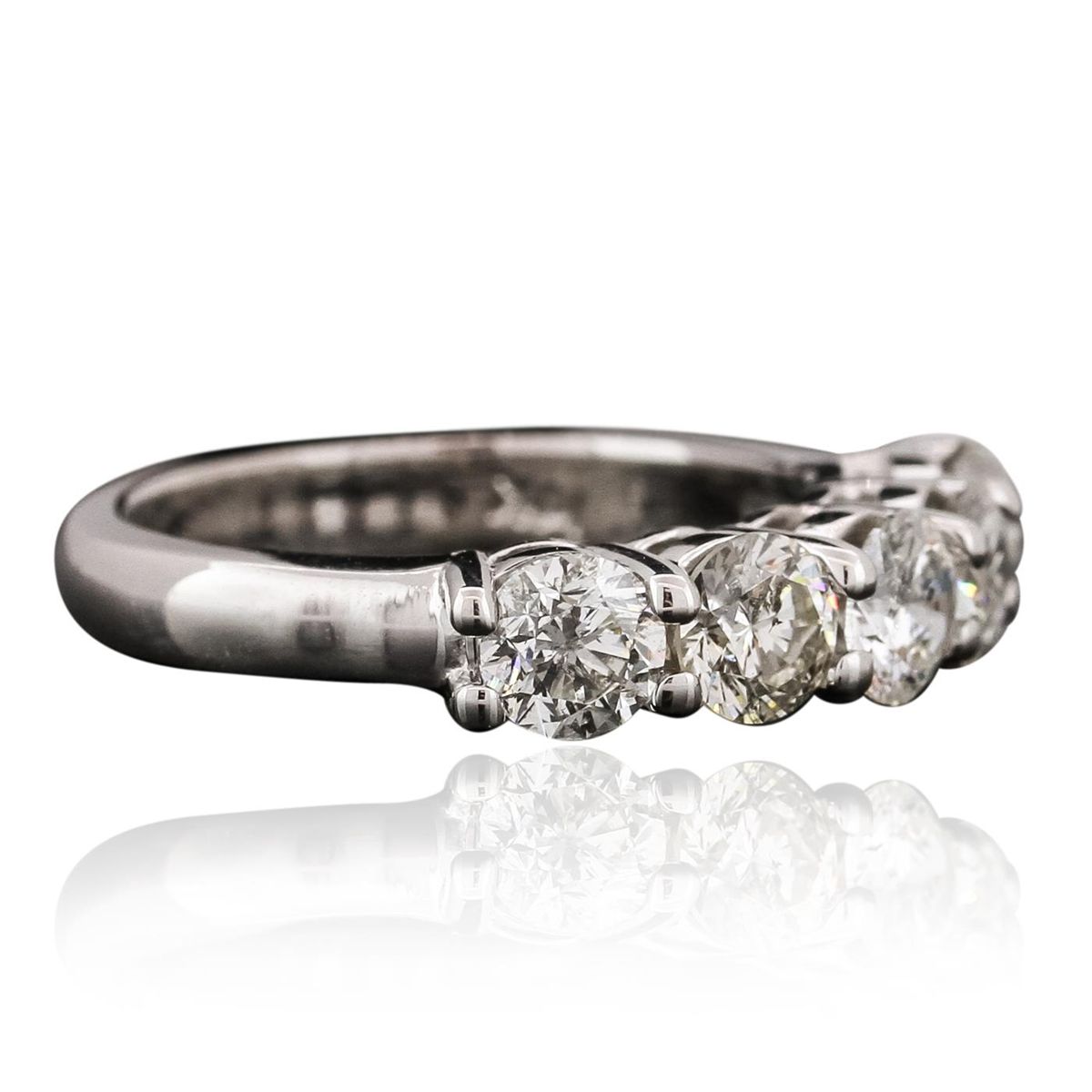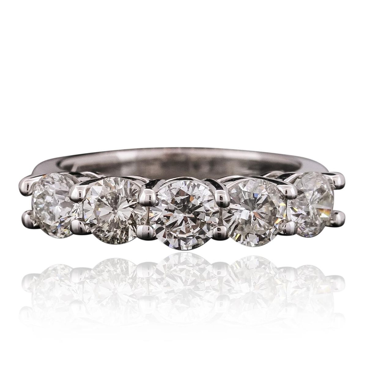 One electronically tested 14KT white gold ladies cast anniversary ring with a bright polish finish. Identified with markings of "14K". Condition is new. Containing: Five prong set round brilliant cut diamonds, measuring 4.50 - 4.50 x 2.70mm (depth est.) approximate total weight of 5 Stones = 1.67ct. Clarity: I-1 to I-2. Color: H - J, Cut is Good. All diamonds are graded in the mounting, unless otherwise stated. Total Weight of Diamonds 1.67ct. Total Weight of Ring 5.10 grams. GGL Appraised at $7,515.00.