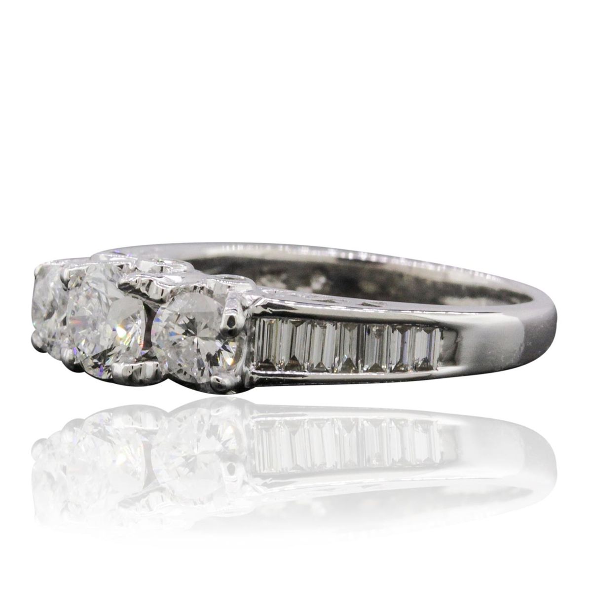 One electronically tested 14KT white gold ladies combination cast & assembled engagement ring with a flat shank with a bright polish finish. Identified with markings of "14K". Condition is new. Containing: One prong set round brilliant cut diamond, measuring 5.35 - 5.34 x 3.04mm (depth est.) approximate weight of 0.53ct. Clarity: I-1. Color: J, Cut is Good. Two prong set round brilliant cut diamonds, measuring 4.38 - 4.37 x 2.62mm (depth est.) approximate total weight of 2 Stones = 0.61ct. Clarity: I-1. Color: I, Cut is Good. Six bezel set round brilliant cut diamonds, measuring 1.70 - 1.70 x 1.02mm (depth est.) approximate total weight of 6 Stones = 0.11ct. Clarity: SI-1. Color: I - J, Cut is Good. Fourteen channel set baguette cut diamonds, measuring from 2.00 x 1.10 x 0.94mm (depth est.) to 2.50 x 1.50 x 1.28mm (depth est.) approximate total weight of 14 Stones = 0.42ct. Clarity: VS-2. Color: I - J, Cut is Good. All diamonds are graded in the mounting, unless otherwise stated. Total Weight of Diamonds 1.67ct. Total Weight of Ring 5.20 grams. GGL Appraised at $9,340.00.