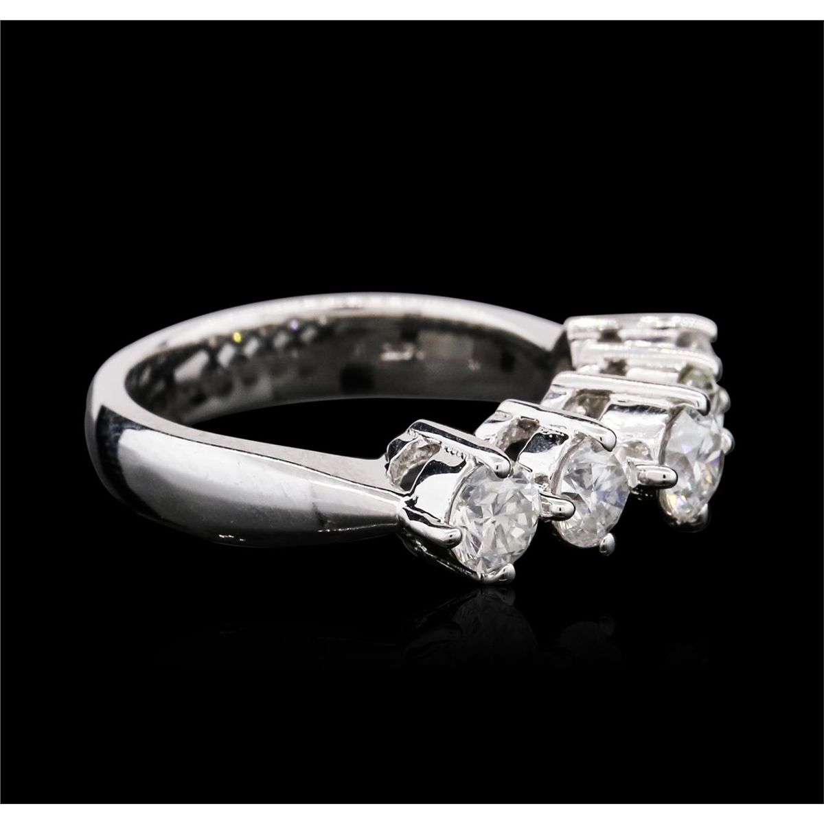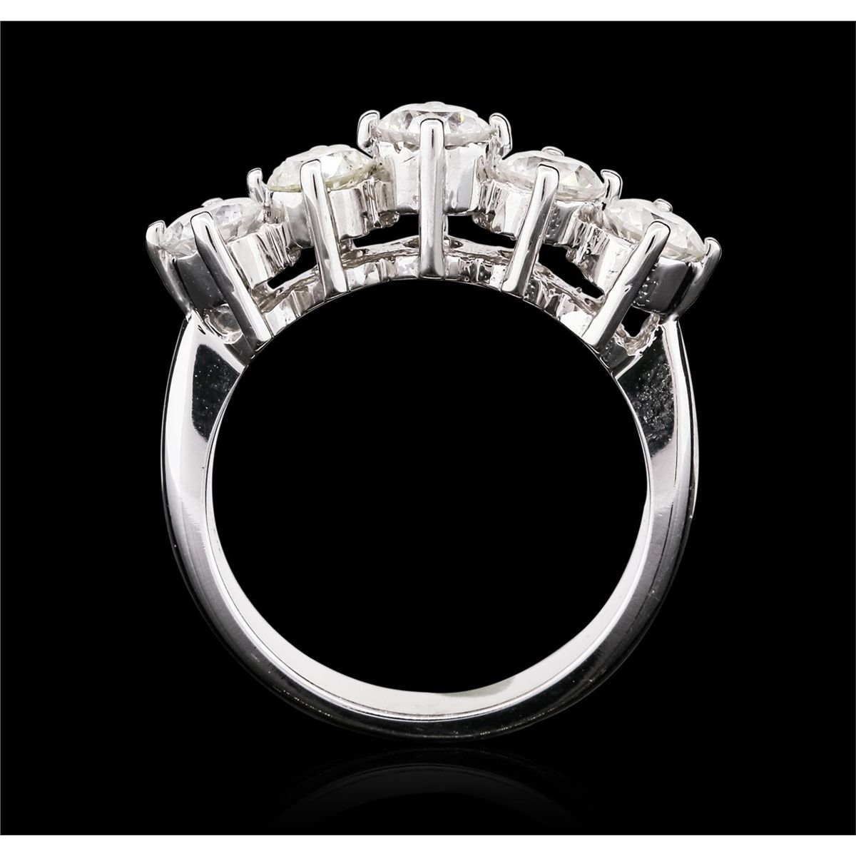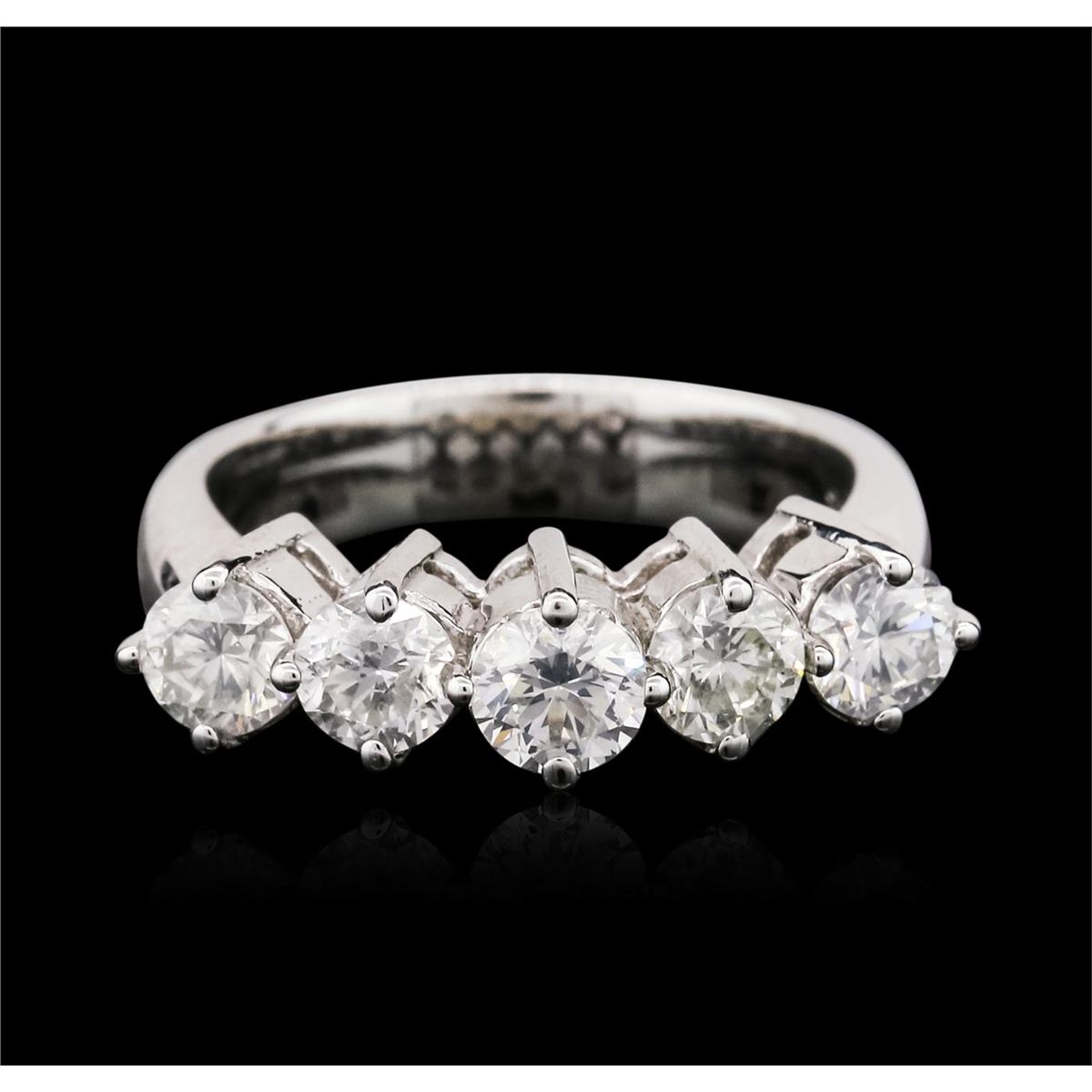 One electronically tested 14KT white gold ladies combination cast & assembled diamond ring with a bright polish finish. Identified with markings of "14K". Condition is new. Containing: Five prong set round brilliant cut diamonds, measuring 4.50 - 4.50 x 2.70mm (depth est.) approximate total  weight of 5 Stones = 1.67ct. Clarity: SI-2 to I-1. Color: I - J, Cut is Good. All diamonds are graded in the mounting, unless otherwise stated. Total Weight of Diamonds 1.67ct. Total Weight of Ring 5.70 grams. GGL Appraised at $7,310.00.