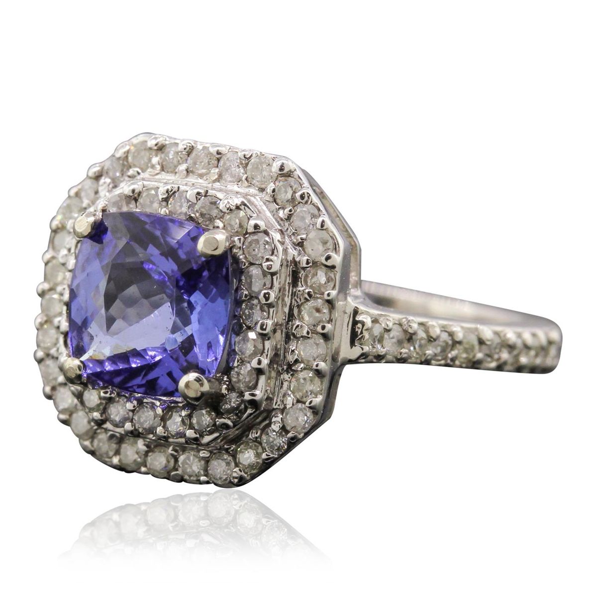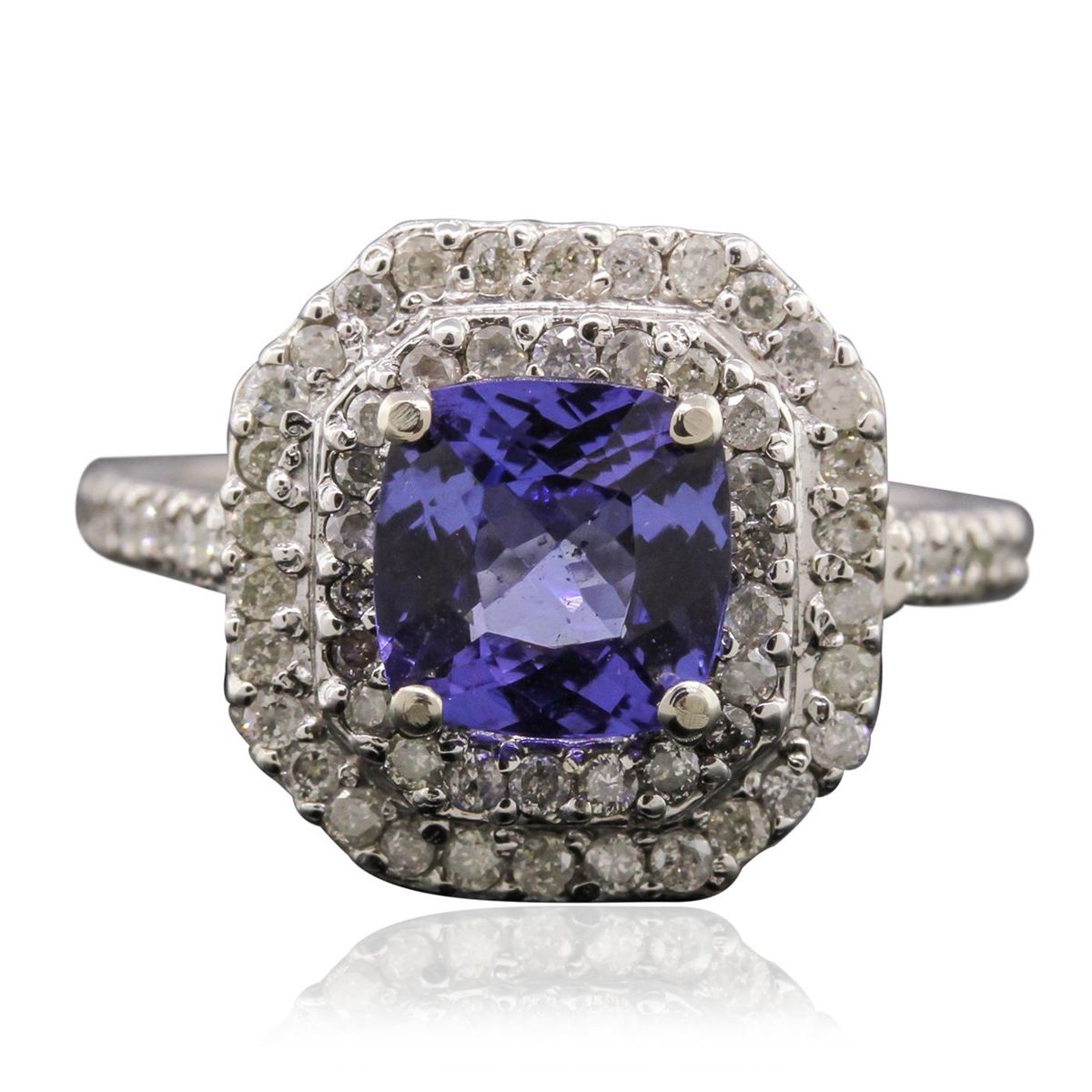 One electronically tested 14KT white gold Ladies cast ring with a bright polish finish. Condition is new. Identified with markings of "K14". Containing: One prong set square cushion modified brilliant cut natural tanzanite, measuring 7.30 x 7.30 x 4.00mm, approximate weight of 1.68ct., clarity is eye clean, type I, medium light, moderately strong, bluish violet color, (GIA bV 4/4), cut is very good. Colored gemstones are presumed to have been subjected to commonly used color/clarity enhancement processes. Eighty prong set round brilliant cut diamonds, measuring 1.50 - 1.30 x 0.84mm (depth est.) approximate. Total Weight of 80 Stones = 0.80ct. Clarity: I-1 to I-2. Color: I - J, Cut is Good. Total Weight of Colored Stones 1.68ct. Total Weight of Diamonds 0.80ct. Total Weight of Ring 5.20 Grams. GGL Appraised at $5,450.00.