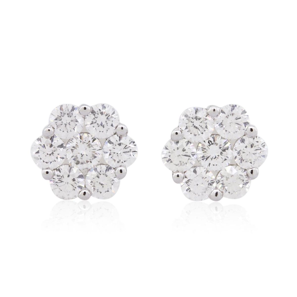 One pair electronically tested 14KT white gold ladies cast diamond earrings with friction posts with a bright polish finish. Identified with markings of "14K". Condition is new. Containing: Fourteen prong set round brilliant cut diamonds, measuring 3.20 - 3.20 x 1.92mm (depth est.) approximate total weight of 14 Stones = 1.68ct. Clarity: SI-1 to SI-2. Color: I - J, Cut is Good. All diamonds are graded in the mounting, unless otherwise stated. Total Weight of Diamonds 1.68ct. Total Weight of Earrings 3.30 grams. GGL Appraised at $5,455.00.