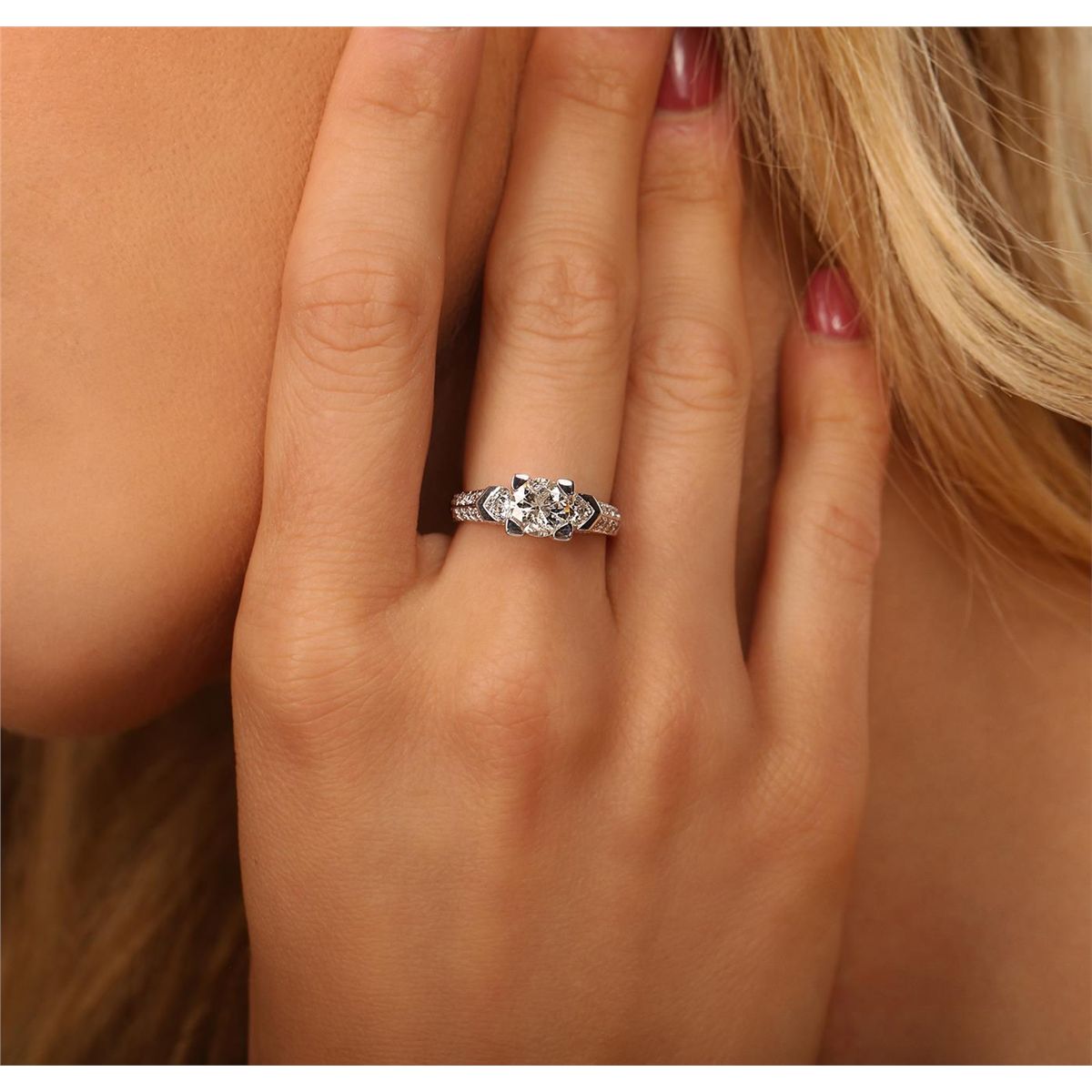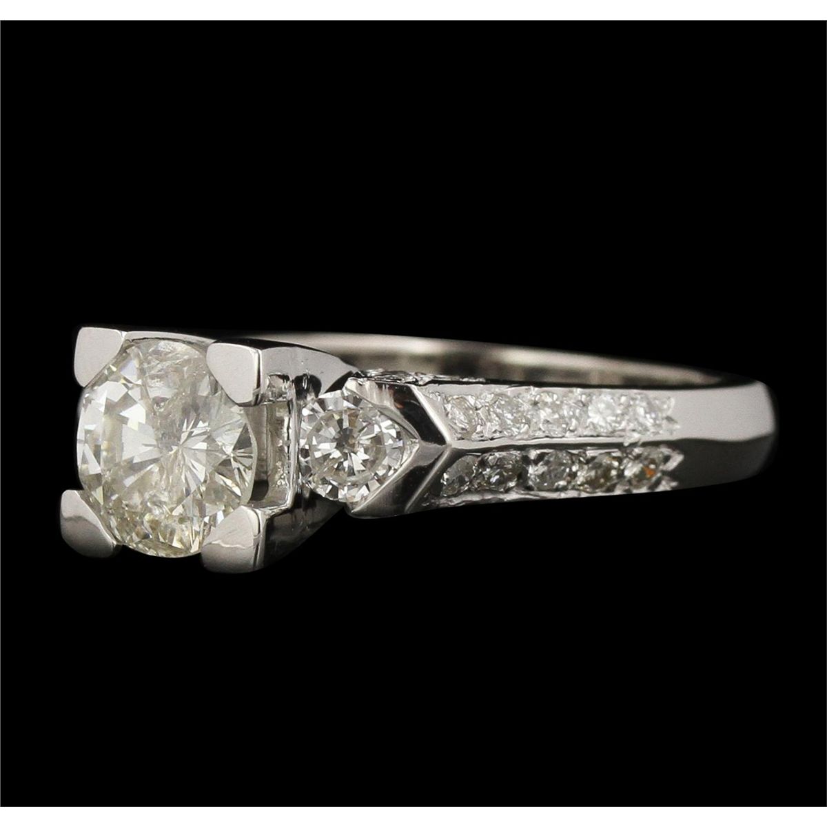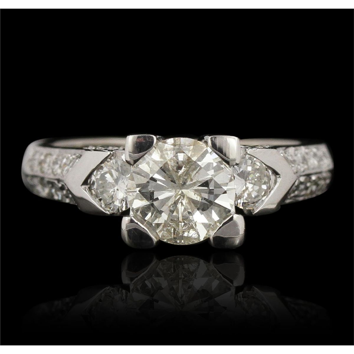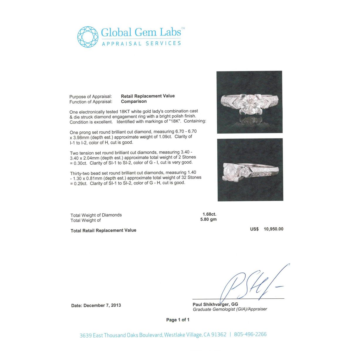 One electronically tested 18KT white gold Ladies combination cast & die struck diamond engagement ring with a bright polish finish. Condition is excellent. Identified with markings of "18K". Containing: One prong set round brilliant cut diamond, measuring 6.70 - 6.70 x 3.98mm (depth est.) approximate weight of 1.09ct. Clarity of I-1 to I-2, color of H, cut is good. Two tension set round brilliant cut diamonds, measuring 3.40 - 3.40 x 2.04mm (depth est.) approximate total weight of 2 Stones = 0.30ct. Clarity of SI-1 to SI-2, color of G - I, cut is very good. Thirty-two bead set round brilliant cut diamonds, measuring 1.40 - 1.30 x 0.81mm (depth est.) approximate total weight of 32 Stones = 0.29ct. Clarity of SI-1 to SI-2, color of G - H, cut is good. Total Weight of Diamonds 1.68ct.Total Weight of 5.80 gm. GGL Appraised at $10,950.00.