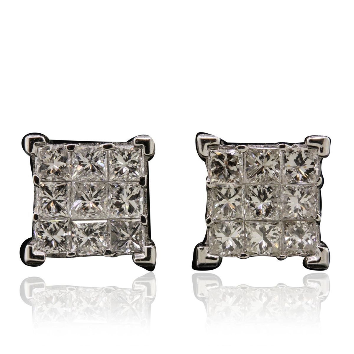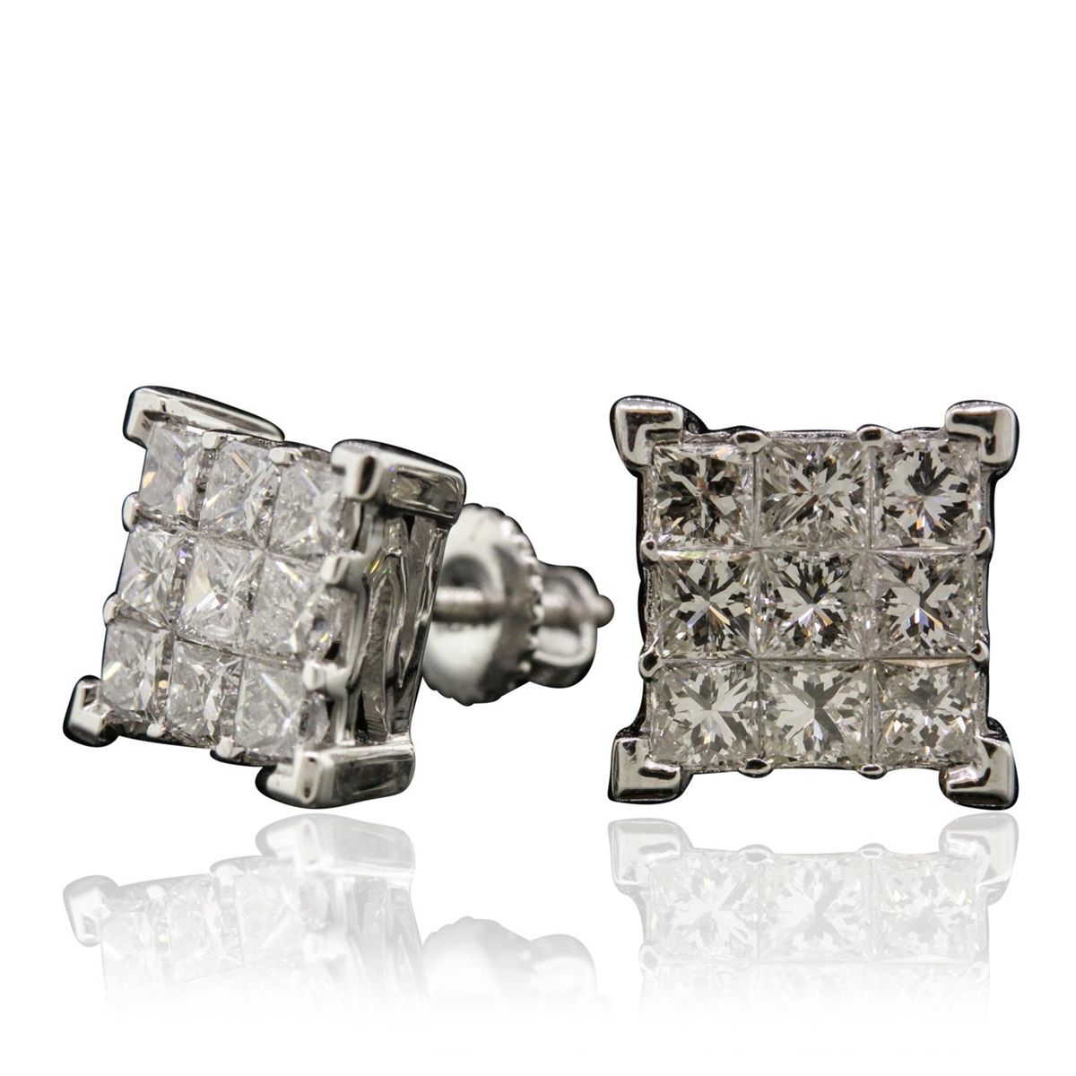 One pair electronically tested 14KT white gold cast & assembled diamond earrings with screw backs. Bright polish finish. Identified with markings of "14K". Condition is new, good workmanship. Containing: Eighteen invisible set princess cut diamonds, measuring 2.50 x 2.40 x 1.80mm (depth est.) approximate total weight of 18 Stones = 1.69ct. Graded in the setting. Clarity: SI-1 to I-1. Color: G - H. Total Weight of Diamonds 1.69ct. Total Weight of Earrings 2.56 grams. AIG Appraised at $4,845.00.