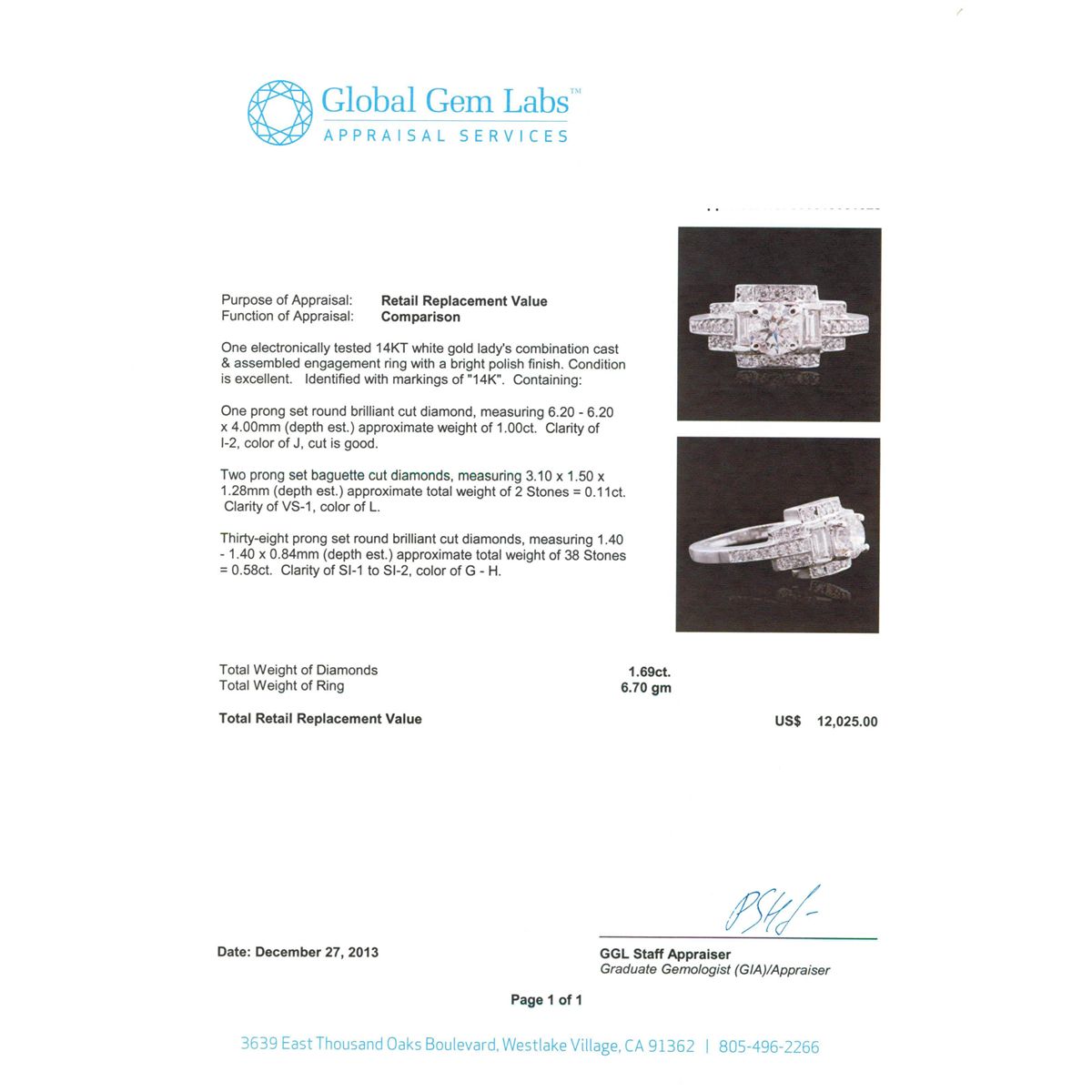 One electronically tested 14KT white gold Ladies combination cast & assembled engagement ring with a bright polish finish. Identified with markings of "14K". Condition is excellent. Containing: One prong set round brilliant cut diamond, measuring 6.20 - 6.20 x 4.00mm (depth est.) approximate weight of 1.00ct. Clarity of I-2, Color of J, Cut is Good. Two prong set baguette cut diamonds, measuring 3.10 x 1.50 x 1.28mm (depth est.) approximate total weight of 2 Stones = 0.11ct. Clarity of VS-1, Color of L. Thirty-Eight prong set round brilliant cut diamonds, measuring 1.40 - 1.40 x 0.84mm (depth est.) approximate total weight of 38 Stones = 0.58ct. Clarity of SI-1 to SI-2, Color of G - H. Total Weight of Diamonds 1.69ct. Total Weight of Ring 6.70gm. GGL Appraised at $12,025.00.