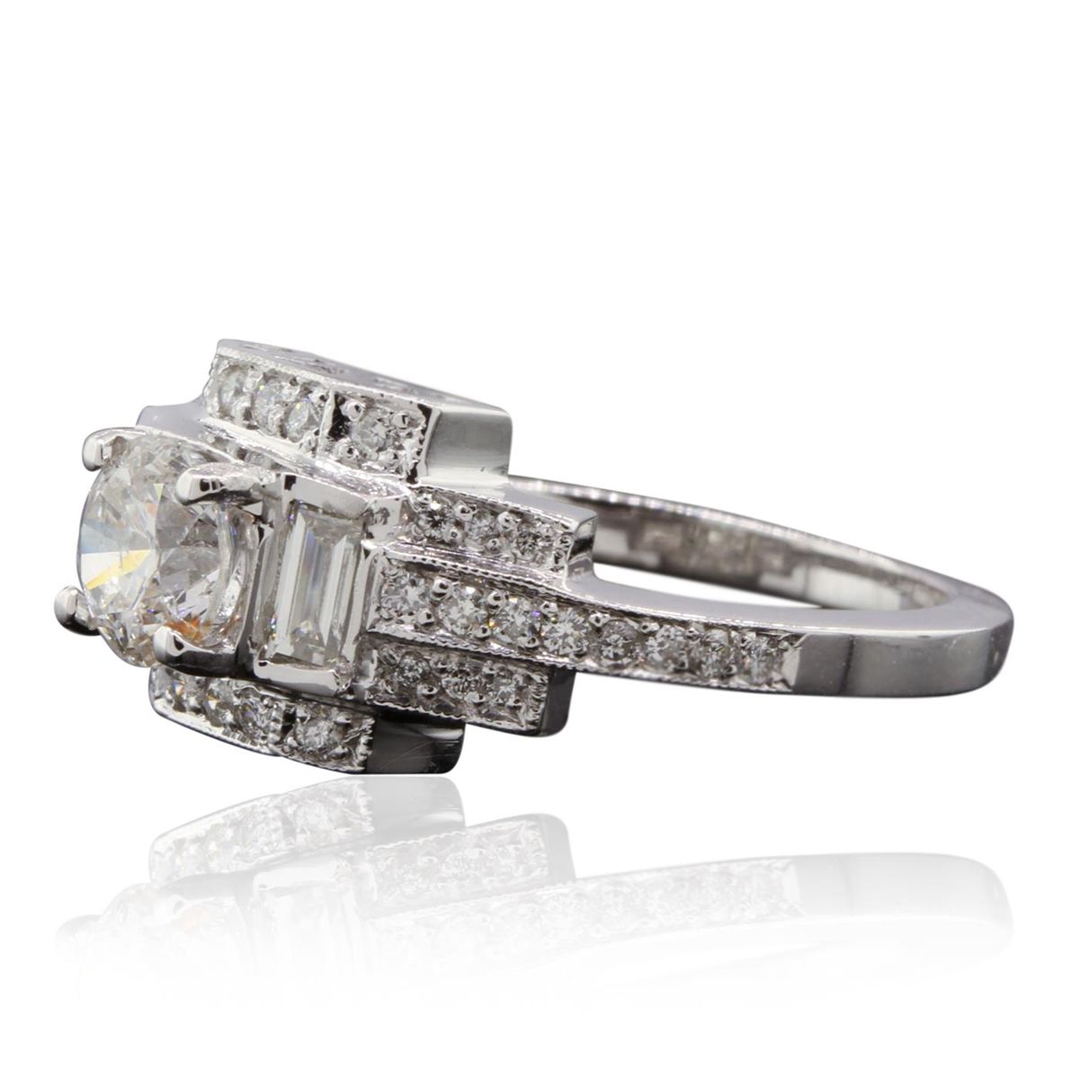 One electronically tested 14KT white gold Ladies combination cast & assembled engagement ring with a bright polish finish. Identified with markings of "14K". Condition is excellent. Containing: One prong set round brilliant cut diamond, measuring 6.20 - 6.20 x 4.00mm (depth est.) approximate weight of 1.00ct. Clarity of I-2, Color of J, Cut is Good. Two prong set baguette cut diamonds, measuring 3.10 x 1.50 x 1.28mm (depth est.) approximate total weight of 2 Stones = 0.11ct. Clarity of VS-1, Color of L. Thirty-Eight prong set round brilliant cut diamonds, measuring 1.40 - 1.40 x 0.84mm (depth est.) approximate total weight of 38 Stones = 0.58ct. Clarity of SI-1 to SI-2, Color of G - H. Total Weight of Diamonds 1.69ct. Total Weight of Ring 6.70gm. GGL Appraised at $12,025.00.