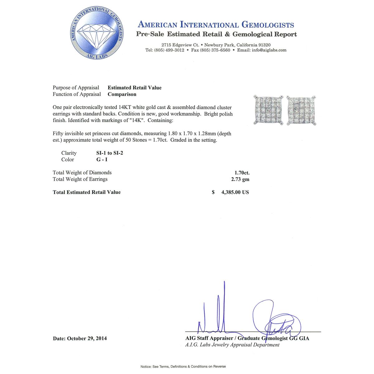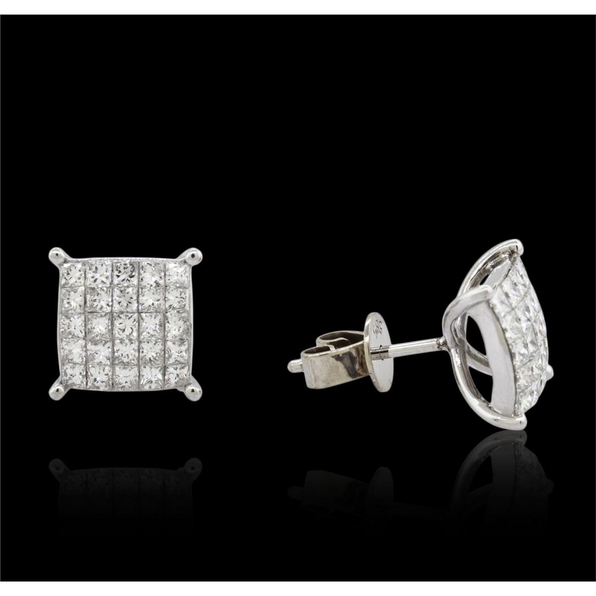One pair electronically tested 14KT white gold cast & assembled diamond cluster earrings with standard backs. Bright polish finish. Identified with markings of "14K". Condition is new, good workmanship. Containing: Fifty invisible set princess cut diamonds, measuring 1.80 x 1.70 x 1.28mm (depth est.) approximate total weight of 50 Stones = 1.70ct. Graded in the setting. Clarity: SI-1 to SI-2. Color: G - I. Total Weight of Diamonds 1.70ct. Total Weight of Earrings 2.73 grams. AIG Appraised at $4,385.00.