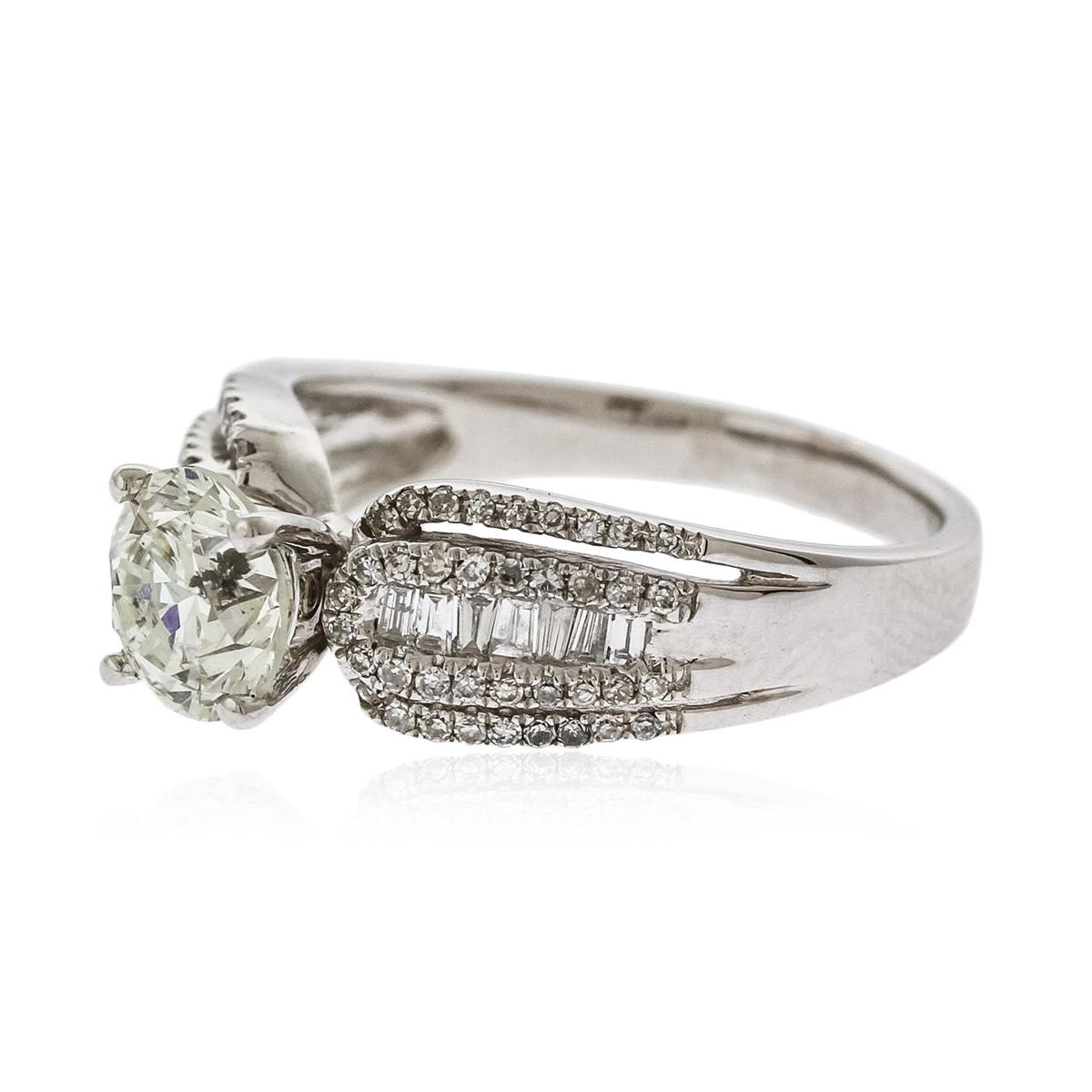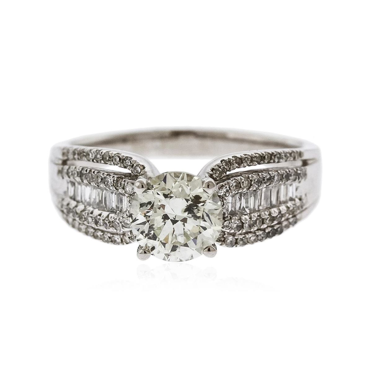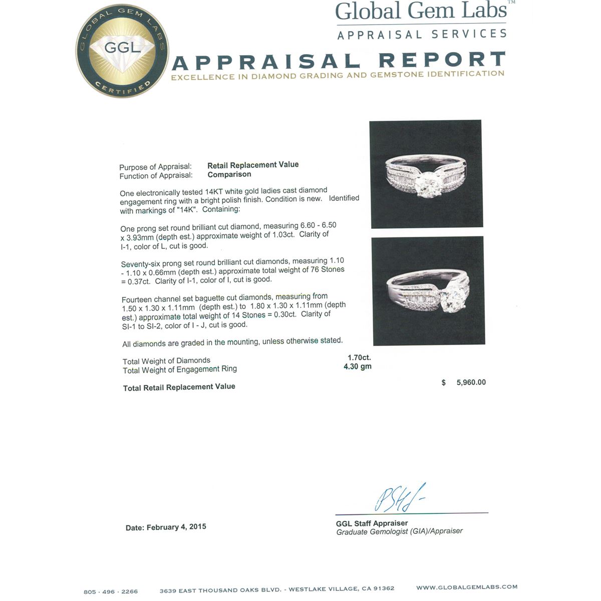 One electronically tested 14KT white gold ladies cast diamond engagement ring with a bright polish finish. Identified with markings of "14K". Condition is new. Containing: One prong set round brilliant cut diamond, measuring 6.60 - 6.50 x 3.93mm (depth est.) approximate weight of 1.03ct. Clarity: I-1. Color: L, Cut is Good. Seventy-Six prong set round brilliant cut diamonds, measuring 1.10 - 1.10 x 0.66mm (depth est.) approximate total weight of 76 Stones = 0.37ct. Clarity: I-1. Color: I, Cut is Good. Fourteen channel set baguette cut diamonds, measuring from 1.50 x 1.30 x 1.11mm (depth est.) to 1.80 x 1.30 x 1.11mm (depth est.) approximate total weight of 14 Stones = 0.30ct. Clarity: SI-1 to SI-2. Color: I - J, Cut is Good. All diamonds are graded in the mounting, unless otherwise stated. Total Weight of Diamonds 1.70ct. Total Weight of Engagement Ring 4.30 grams. GGL Appraised at $5,960.00.