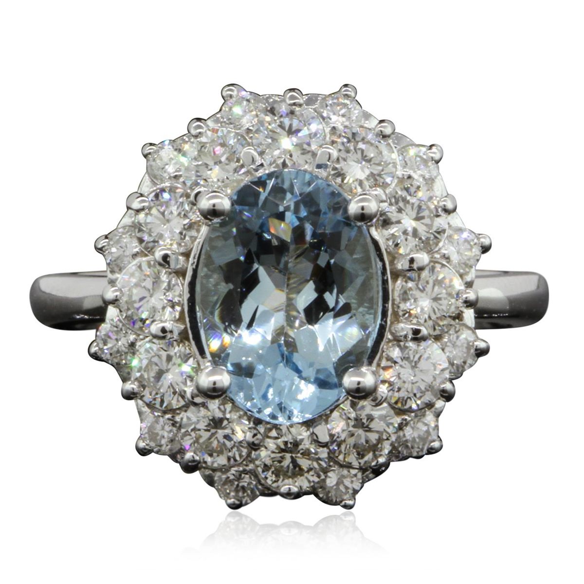 One electronically tested 14KT white gold ladies cast aquamarine and diamond ring with a bright polish finish. Condition is new, good workmanship. The featured aquamarine is set within a two tier diamond bezel supported by a partially open heart design gallery completed by a tapering three millimeter wide band. Identified with markings of "14K". Containing: One prong set oval mixed cut natural aquamarine, measuring 10.00 x 7.10 x 4.50mm, exact weight 1.70ct, clarity is eye clean, type I, medium light, very slightly grayish, blue color, (GIA B 4/3), cut is good. Transmitting light with no distortion, transparent. Graded in the setting. Twelve prong set round brilliant cut diamonds, measuring 2.90 - 2.80 x 1.74mm (depth est.) approximate. Total Weight of 12 Stones = 1.13ct. Graded in the setting. Clarity: SI-1 to SI-2. Color: H - I Twelve prong set round brilliant cut diamonds, measuring 1.80 - 1.70 x 1.07mm (depth est.) approximate. Total Weight of 12 Stones = 0.33ct. Graded in the setting. Clarity: SI-2 to I-1. Color: H - I. Total Weight of Colored Stones 1.70ct. Total Weight of Diamonds 1.46ct. Total Weight of Ring 5.63 grams. AIG Appraised at $6,415.00.