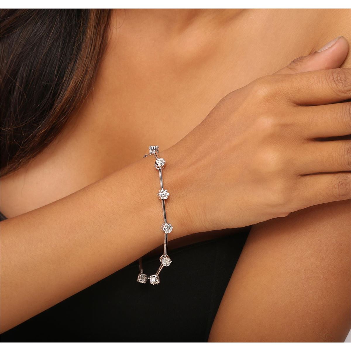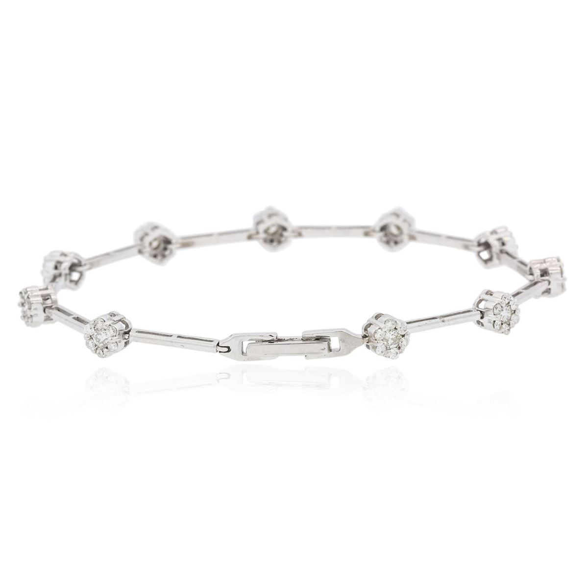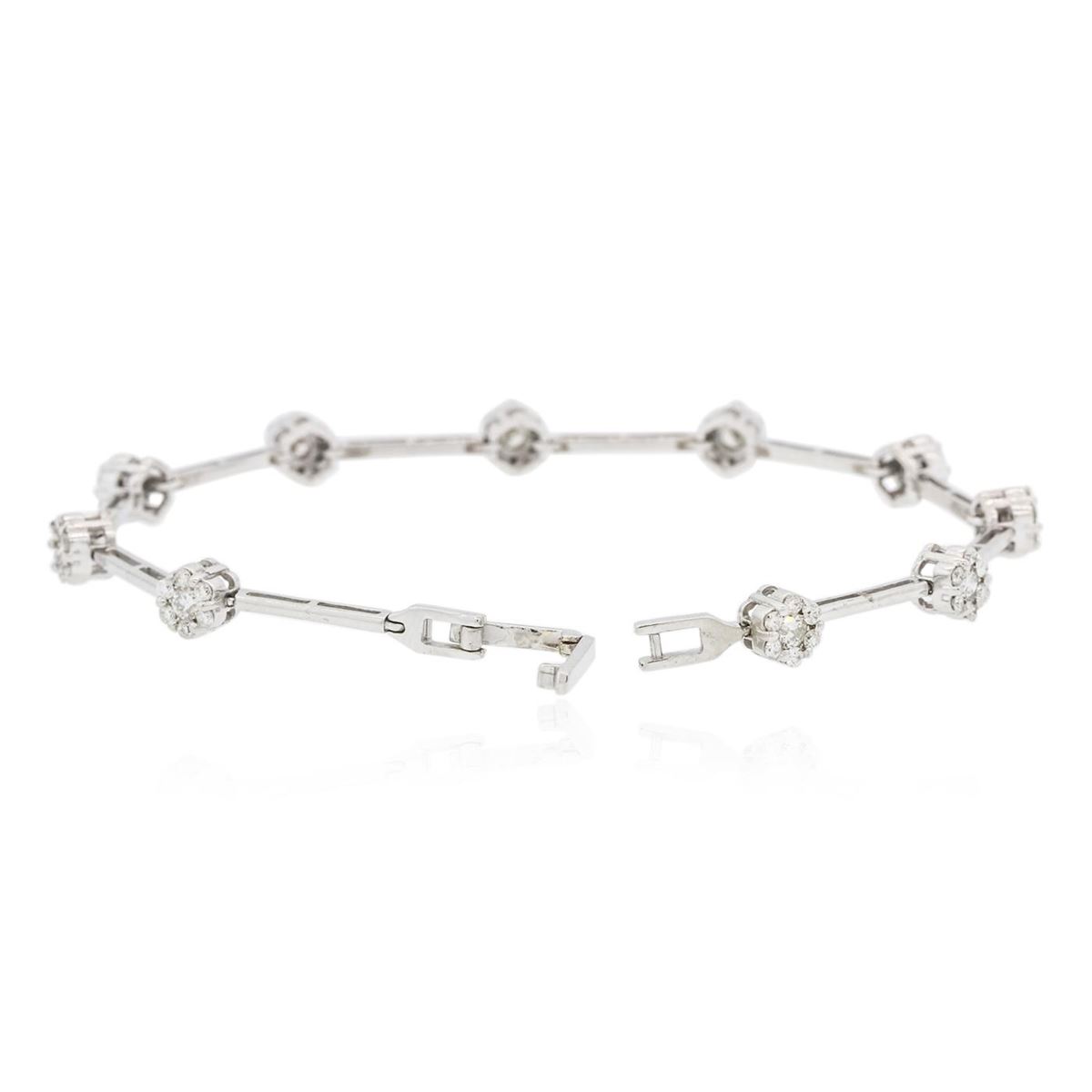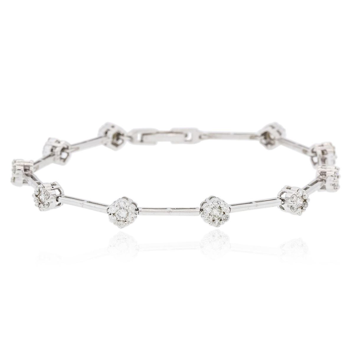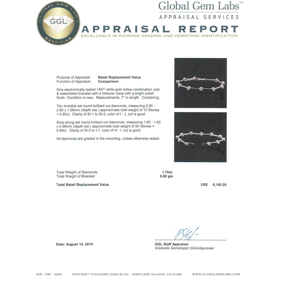 One electronically tested 14KT white gold ladies combination cast & assembled bracelet with a foldover clasp with a bright polish finish. Condition is new. Measurements: 7" in length. Containing: Ten invisible set round brilliant cut diamonds, measuring 2.80 - 2.80 x 1.68mm (depth est.) approximate total weight of 10 Stones = 0.80ct. Clarity: SI-1 to SI-2. Color: I - J, Cut is Good. Sixty prong set round brilliant cut diamonds, measuring 1.60 - 1.60 x 0.96mm (depth est.) approximate total weight of 60 Stones = 0.89ct. Clarity: SI-2 to I-1. Color: H - I, Cut is Good. All diamonds are graded in the mounting, unless otherwise stated. Total Weight of Diamonds 1.70ct. Total Weight of Bracelet 9.80 grams. GGL Appraised at $8,180.00.