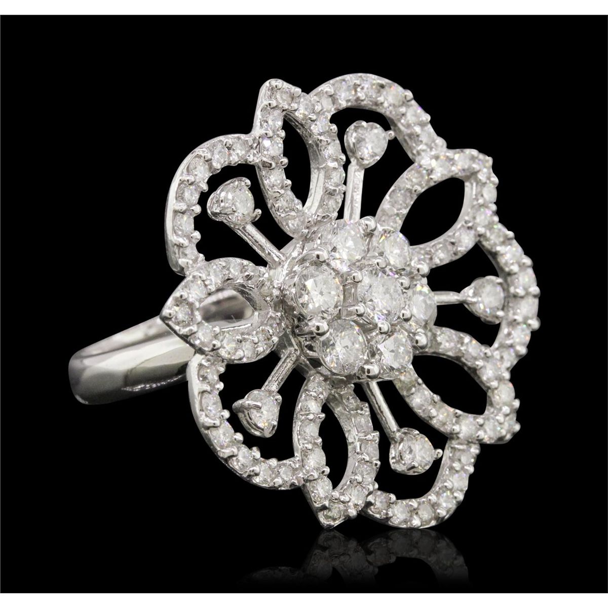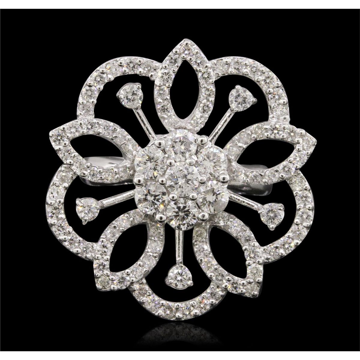One electronically tested 14KT white gold ladies combination cast & assembled ring with a bright polish finish. Condition is new. Identified with markings of "K14". Containing: Twelve prong set round brilliant cut diamonds, measuring 3.60 - 2.10 x 1.71mm (depth est.) approximate. Total Weight of 12 Stones = 1.02ct. Clarity: SI-2 to I-1. Color: I - J, Cut is Good. Eighty-Five prong set round brilliant cut diamonds, measuring 1.30 - 1.30 x 0.78mm (depth est.) approximate. Total Weight of 85 Stones = 0.68ct. Clarity: I-1 to I-2. Color: I - J, Cut is Good. All diamonds are graded in the mounting, unless otherwise stated. Total Weight of Diamonds 1.70ct. Total Weight of Ring 9.80 grams. GGL Appraised at $7,395.00.