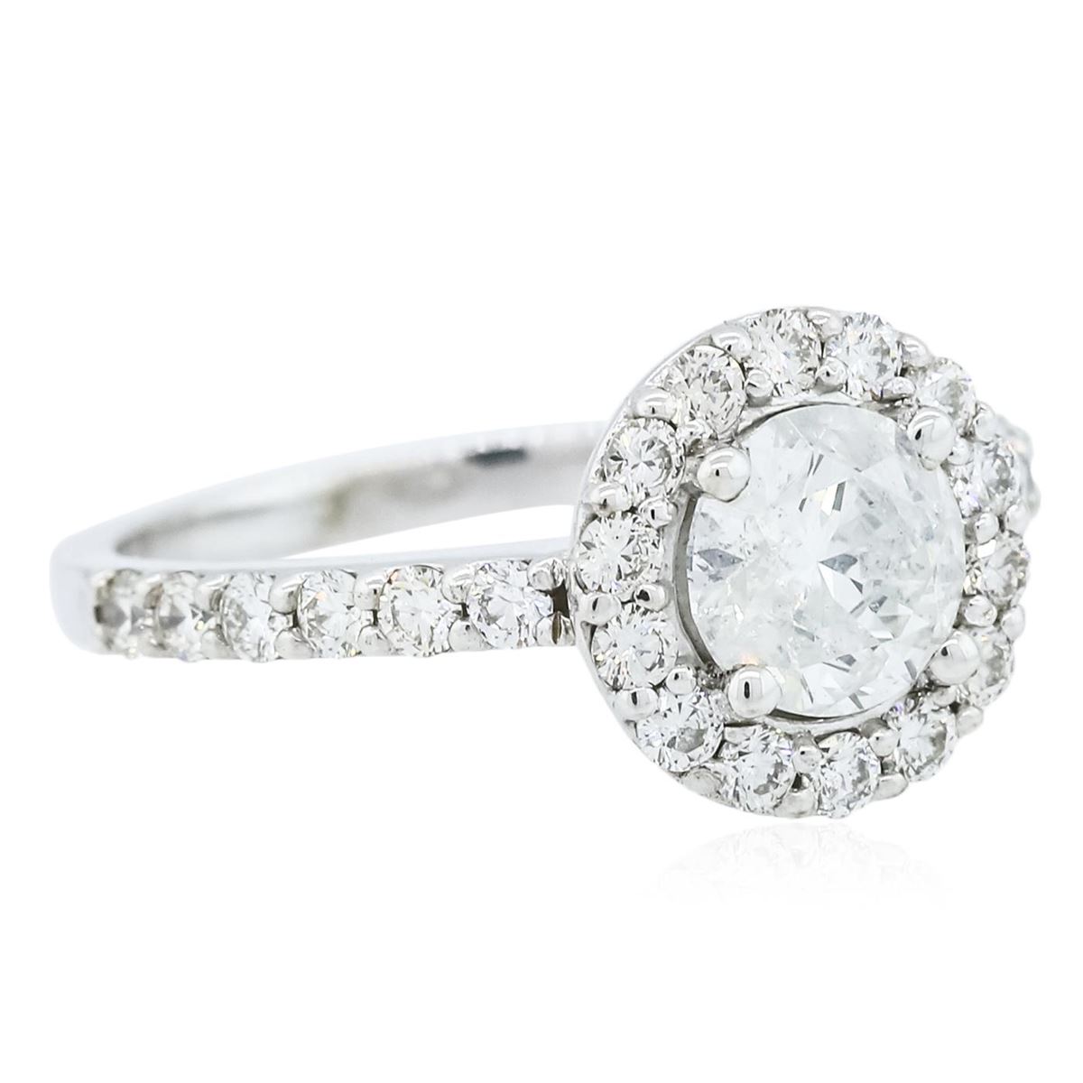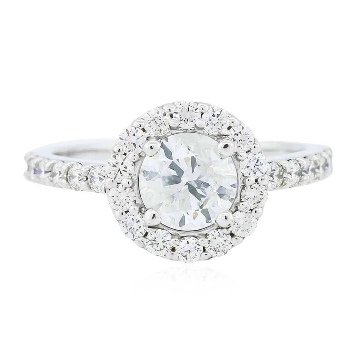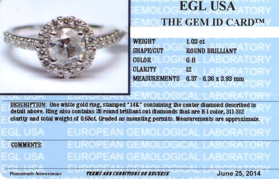 One electronically tested 14KT white gold Ladies combination cast & assembled engagement ring with a bright polish finish. Condition is new. Identified with markings of "14K". Containing: One prong set round brilliant cut diamond, measuring 6.37 - 6.36 x 3.93mm (depth est.) approximate weight of 1.03ct. Clarity: I-2. Color: G, Cut is Good. Twenty-Six prong set round brilliant cut diamonds, measuring 1.90 - 1.90 x 1.14mm (depth est.) approximate. Total Weight of 26 Stones = 0.68ct. Clarity: SI-1 to SI-2. Color: H - I, Cut is Good. EGL USA GEM ID# US 911348425D. All diamonds are graded in the mounting, unless otherwise stated. Total Weight of Diamonds 1.71ct. Total Weight of Engagement Ring 3.50 grams. GGL Appraised at $12,240.00.