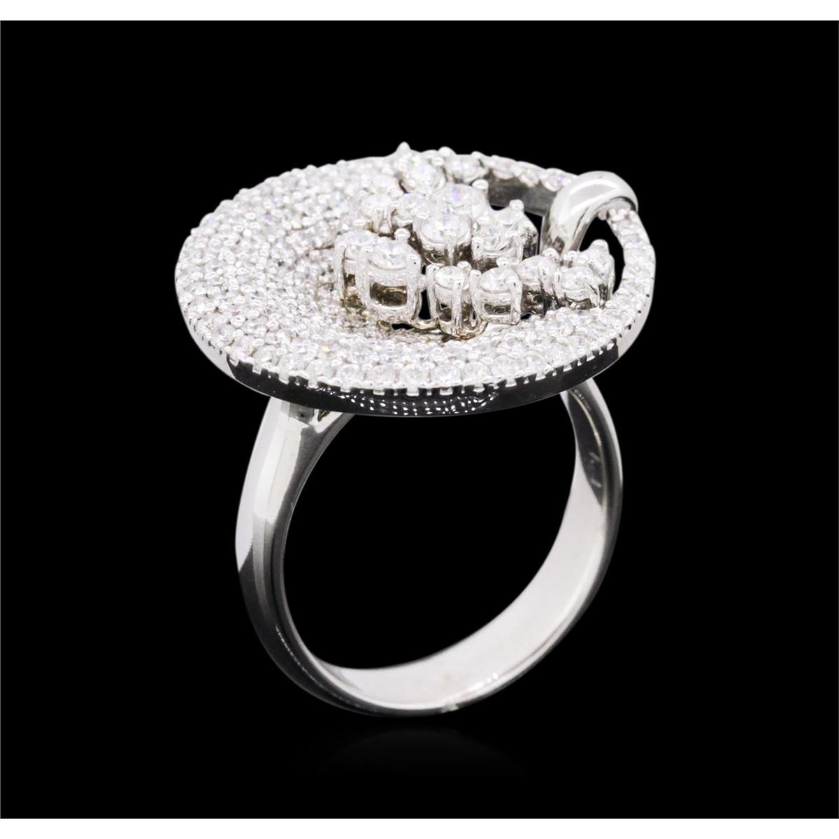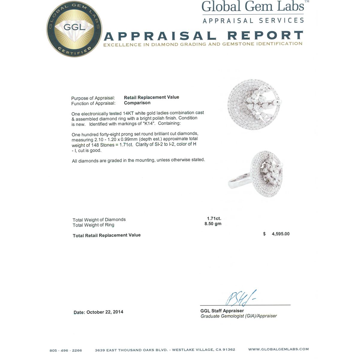 One electronically tested 14KT white gold ladies combination cast & assembled diamond ring with a bright polish finish. Identified with markings of "K14". Condition is new. Containing: One Hundred Forty-Eight prong set round brilliant cut diamonds, measuring 2.10 - 1.20 x 0.99mm (depth est.) approximate total weight of 148 Stones = 1.71ct. Clarity: SI-2 to I-2. Color: H - I, Cut is Good. All diamonds are graded in the mounting, unless otherwise stated. Total Weight of Diamonds 1.71ct. Total Weight of Ring 8.50 grams. GGL Appraised at $4,595.00.