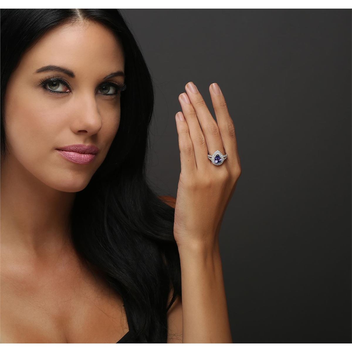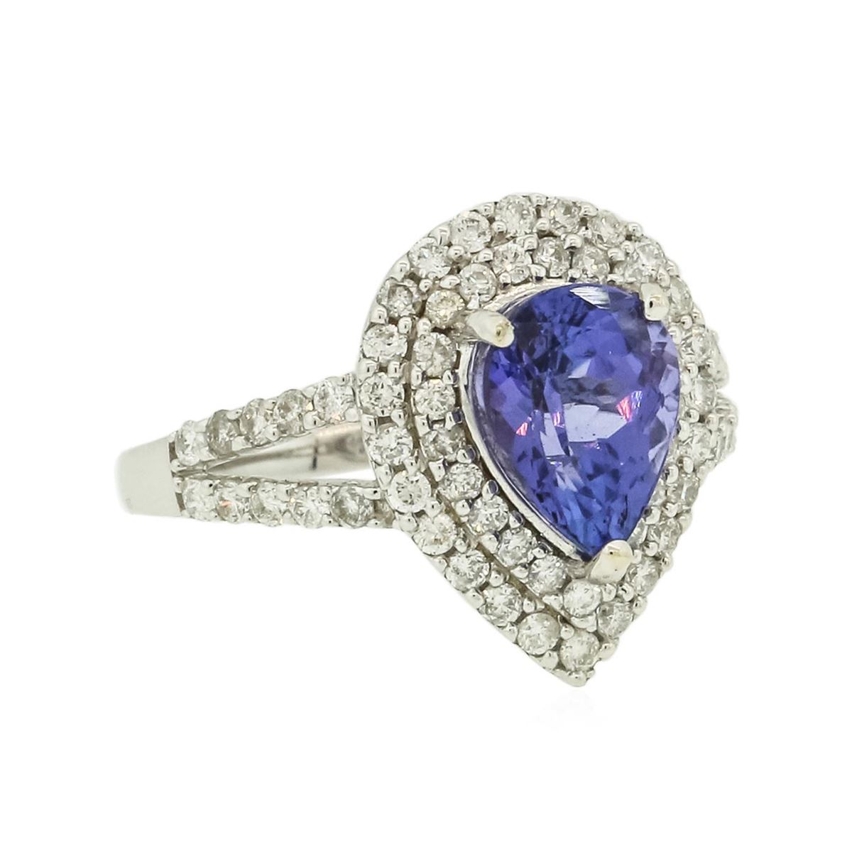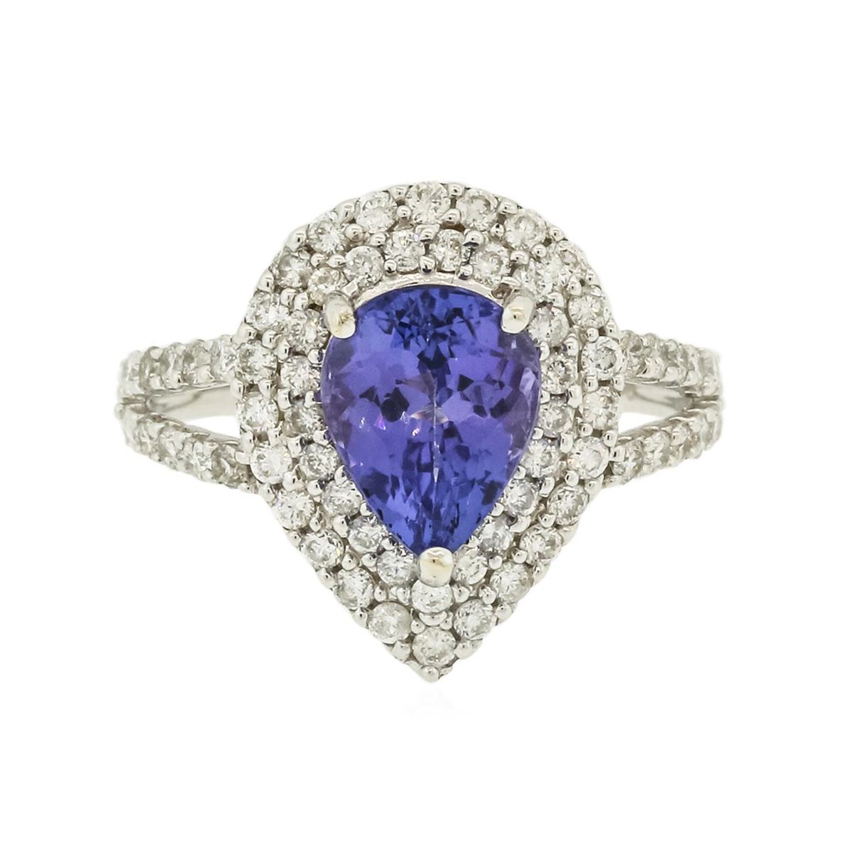 One electronically tested 14KT white gold ladies combination cast & assembled tanzanite and diamond ring with a split shank with a bright polish finish. Identified with markings of "14K". Condition is new. Containing: One prong set pear modified brilliant cut natural tanzanite, measuring 8.00 x 7.00 x 4.55mm, approximate weight of 1.71ct., clarity is eye clean, type I, medium, moderately strong, violet color, (GIA V 5/4), cut is good. Sixty-Eight prong set round brilliant cut diamonds, measuring 1.40 - 1.40 x 0.84mm (depth est.) approximate total weight of 68 Stones = 0.68ct. Clarity: SI-2 to I-2. Color: I - J, Cut is Good. Colored gemstones are presumed to have been subjected to commonly used enhancement processes. All diamonds and colored gemstones are graded in the mounting, unless otherwise stated. Total Weight of Colored Stones 1.71ct. Total Weight of Diamonds 0.68ct. Total Weight of Ring 4.20 grams. GGL Appraised at $5,080.00.
