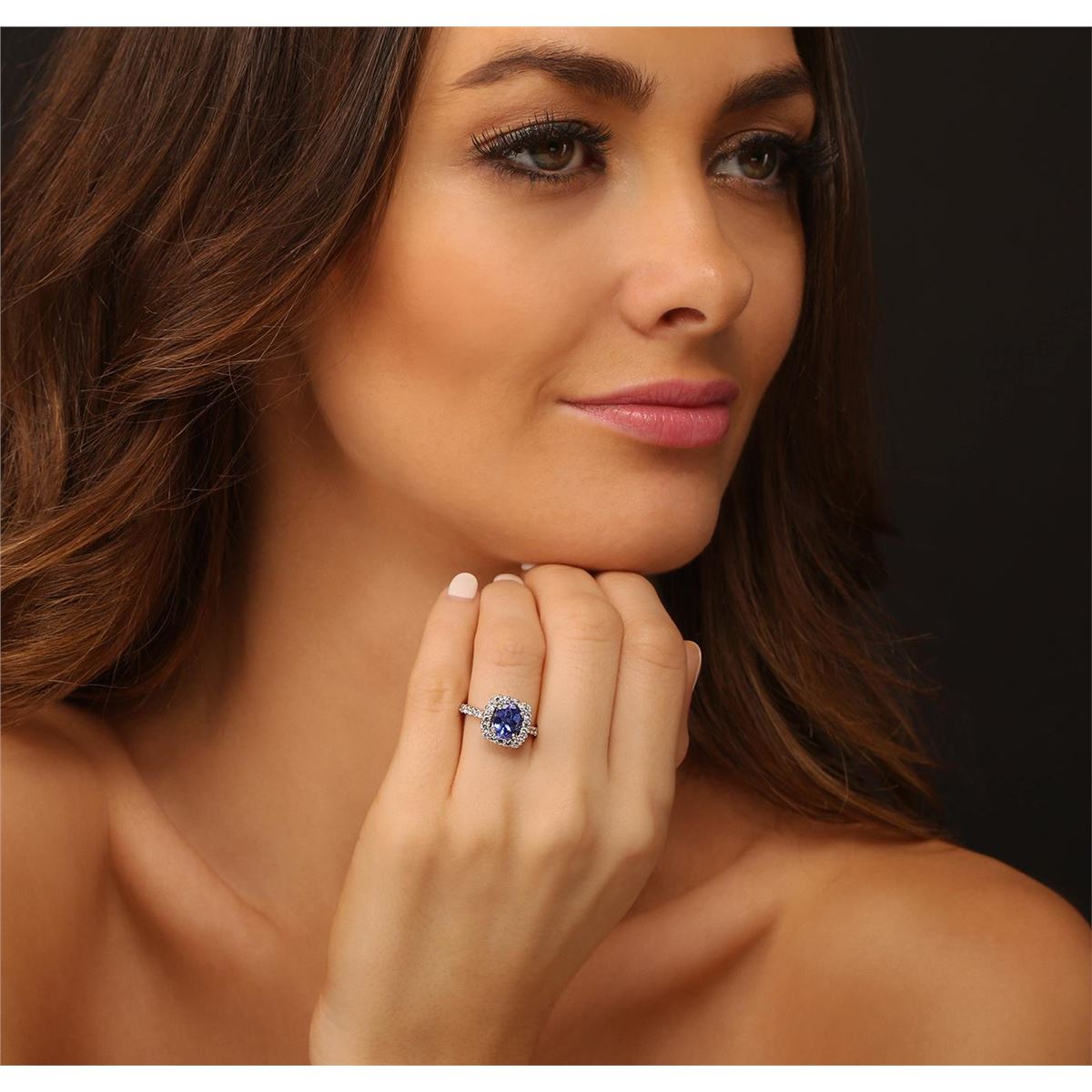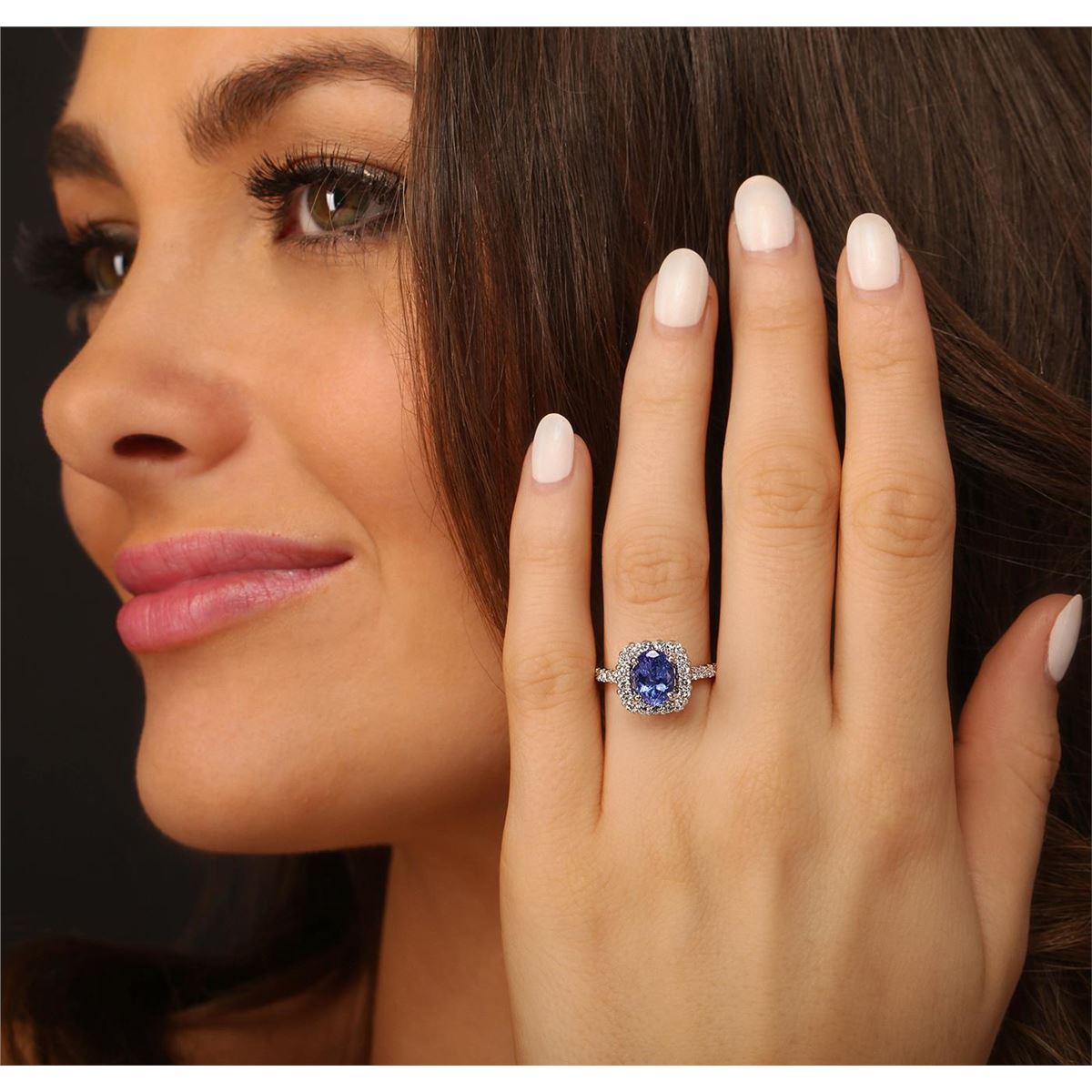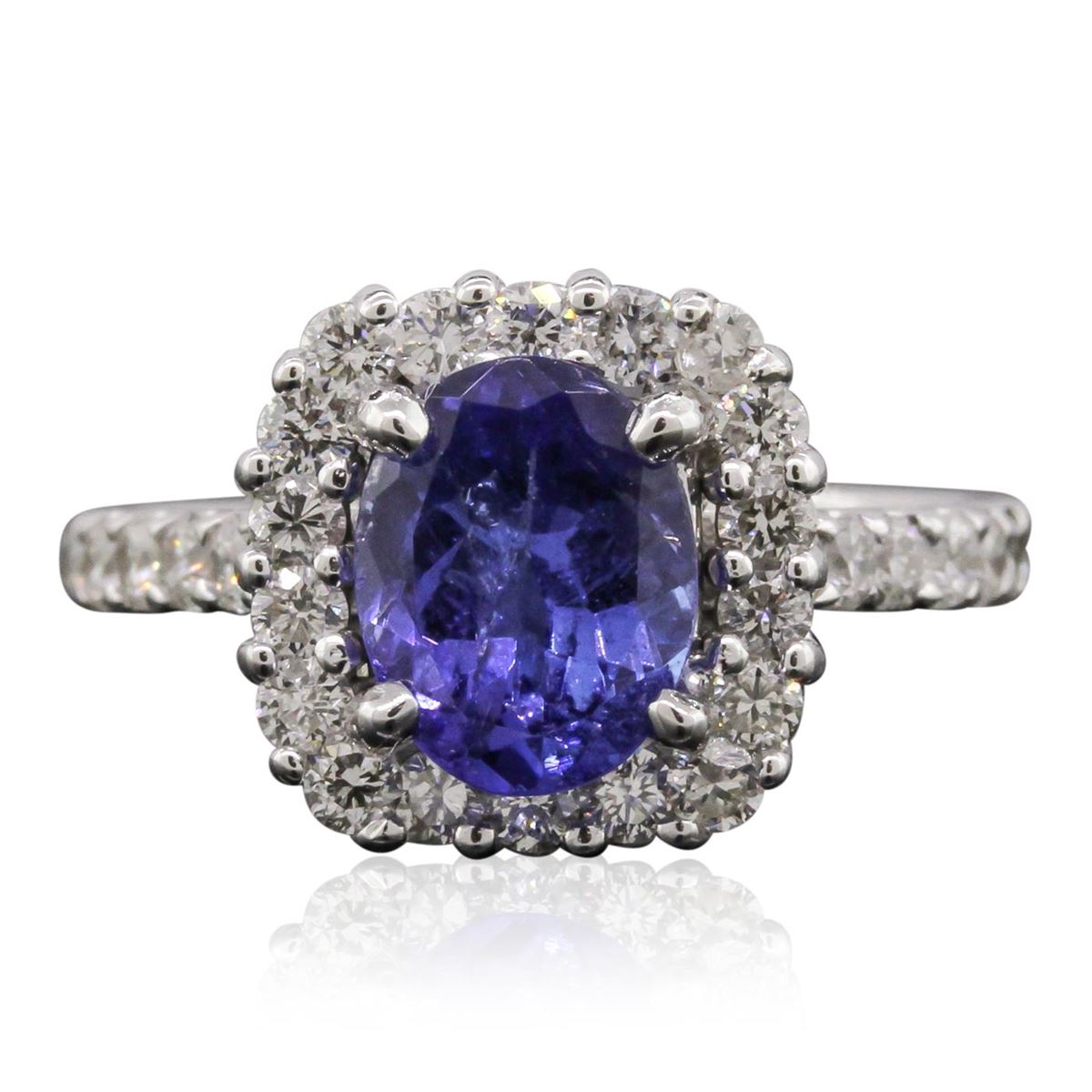 One electronically tested 14KT white gold Ladies combination cast & assembled ring with a bright polish finish. Condition is new. Identified with markings of "14K". Containing: One prong set oval modified mixed cut natural tanzanite, measuring 8.60 x 6.70 x 4.36mm, approximate weight of 1.71ct., clarity is eye clean, type I, medium, moderately strong, violetish blue color, (GIA vB 5/4), cut is very good. Colored gemstones are presumed to have been subjected to commonly used color/clarity enhancement processes. Thirty-Four bead set round brilliant cut diamonds, measuring 2.00. - 2.00. x 1.20mm (depth est.) approximate. Total Weight of 34 Stones = 1.00.ct. Clarity: SI-1 to SI-2. Color: H - I, Cut is Very Good. Total Weight of Colored Stones 1.71ct. Total Weight of Diamonds 1.00.ct. Total Weight of Ring 3.50 grams. GGL Appraised at $7,500.00.