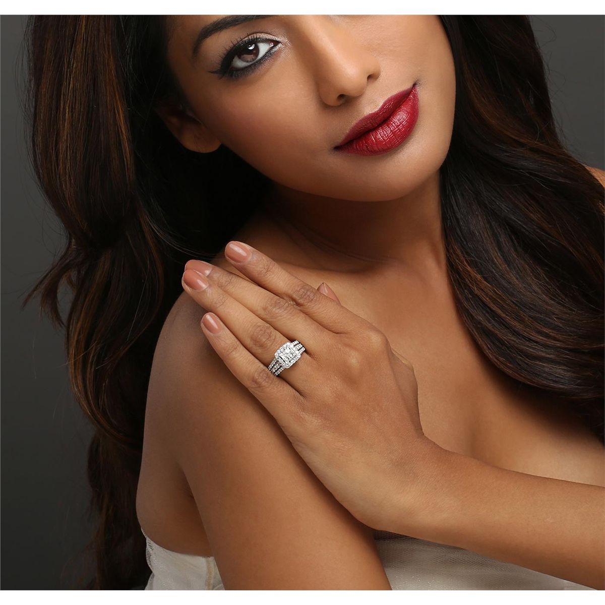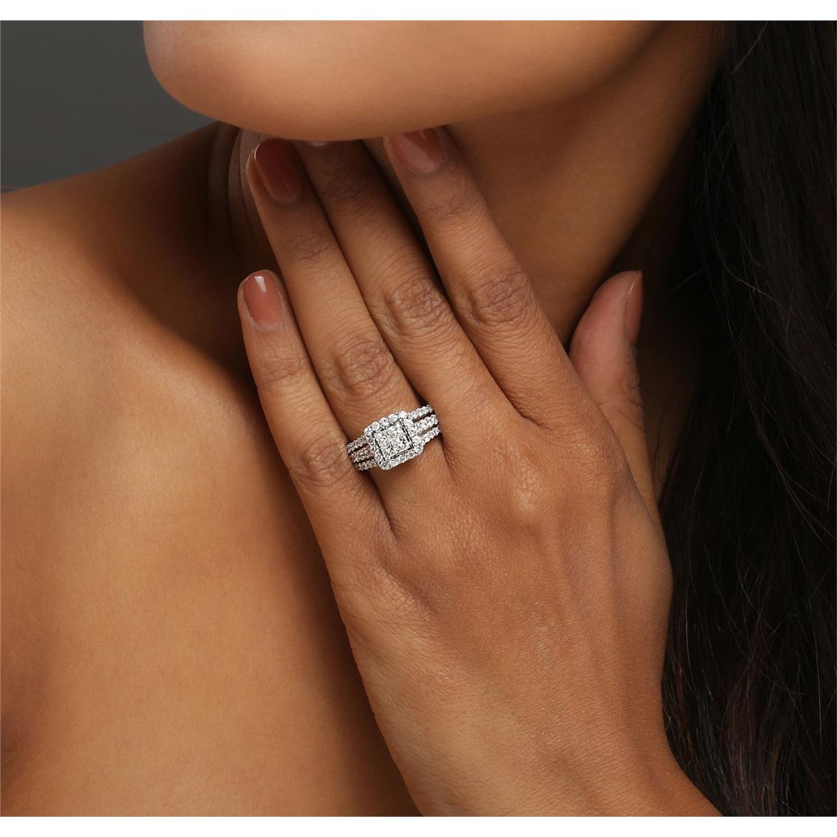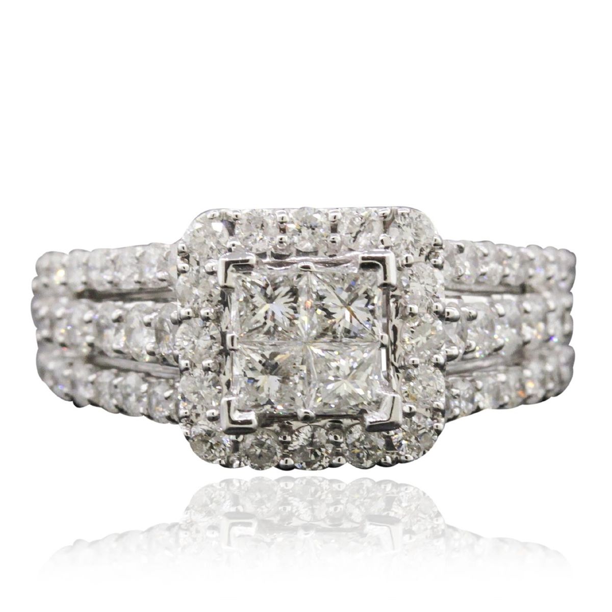 One electronically tested 14KT white gold ladies combination cast & assembled diamond engagement ring with a split shoulder shank with a bright polish finish. Identified with markings of "14K". Condition is new. Containing: Four invisible set princess cut diamonds, measuring 2.90 x 2.90 x 2.18mm (depth est.) approximate total weight of 4 Stones = 0.60ct. Clarity: SI-1 to SI-2. Color: I, Cut is Good. Twelve prong set round brilliant cut diamonds, measuring 2.20 - 2.20 x 1.32mm (depth est.) approximate total weight of 12 Stones = 0.47ct. Clarity: SI-1 to SI-2. Color: H - I, Cut is Good. Forty-Three prong set round brilliant cut diamonds, measuring 1.60 - 1.60 x 0.96mm (depth est.) approximate total weight of 43 Stones = 0.64ct. Clarity: SI-2 to I-1. Color: H - I, Cut is Good. All diamonds are graded in the mounting, unless otherwise stated. Total Weight of Diamonds 1.71ct. Total Weight of Ring 5.30 grams. GGL Appraised at $5,880.00.