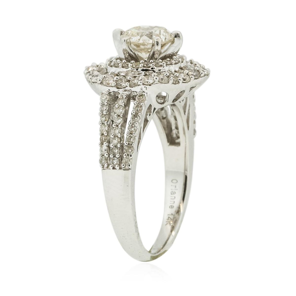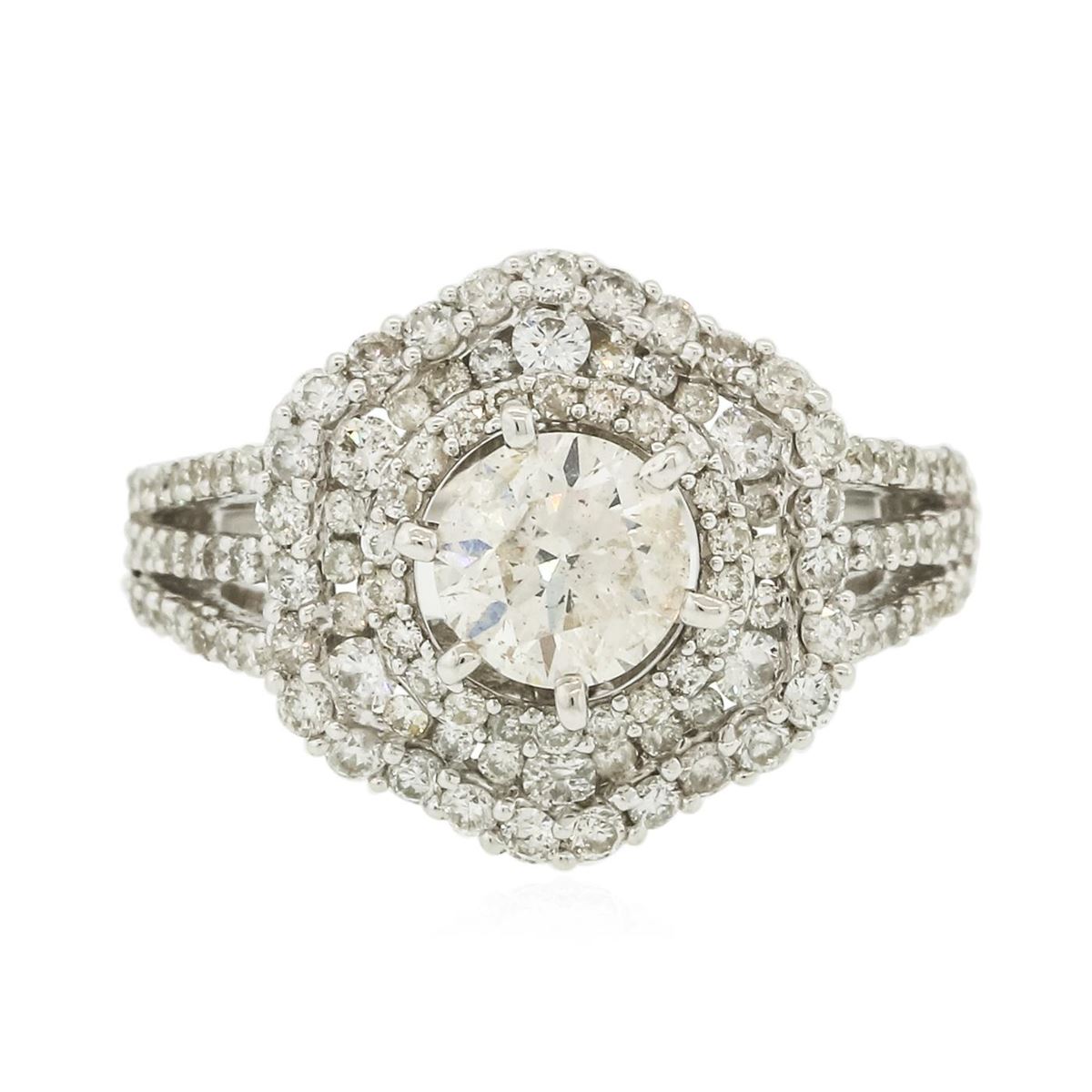 One electronically tested 14KT white gold ladies combination cast & assembled engagement ring with a split shank with a bright polish finish. Identified with markings of "14K". Condition is new. Containing: One prong set round brilliant cut diamond, measuring 6.33 - 6.32 x 3.70mm (depth est.) approximate weight of 0.90ct. Clarity: I-1. Color: K, Cut is Good. One Hundred Fifteen prong set round brilliant cut diamonds, measuring 1.50 - 1.00 x 0.75mm (depth est.) approximate total weight of 115 Stones = 0.82ct. Clarity: SI-2 to I-2. Color: I - J, Cut is Good. All diamonds are graded in the mounting, unless otherwise stated. Total Weight of Diamonds 1.72ct. Total Weight of Ring 6.10 grams. GGL Appraised at $11,100.00.