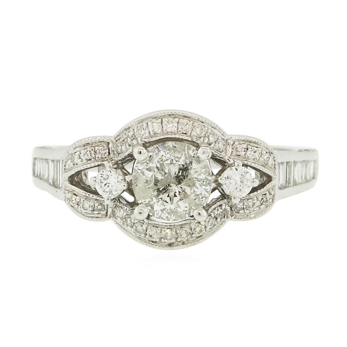 One electronically tested 14KT white gold ladies combination cast & assembled engagement ring with a flat shank with a bright polish finish. Identified with markings of "14K". Condition is new. Containing: One prong set round brilliant cut diamond, measuring 5.45 - 5.40 x 3.09mm (depth est.) approximate weight of 0.56ct. Clarity: I-2. Color: J, Cut is Good. Two prong set round brilliant cut diamonds, measuring 2.00 - 2.00 x 1.20mm (depth est.) approximate total weight of 2 Stones = 0.06ct. Clarity: I-1. Color: I, Cut is Good. Ninety-Eight prong set round brilliant cut diamonds, measuring 1.30 - 1.30 x 0.78mm (depth est.) approximate total weight of 98 Stones = 0.78ct. Clarity: SI-2 to I-2. Color: I - J, Cut is Good. Eighteen channel set baguette cut diamonds, measuring from 1.50 x 1.10 x 0.94mm (depth est.) to 2.00 x 1.20 x 1.02mm (depth est.) approximate total weight of 18 Stones = 0.32ct. Clarity: SI-1. Color: I - J, Cut is Good. All diamonds are graded in the mounting, unless otherwise stated. Total Weight of Diamonds 1.72ct. Total Weight of Ring 3.30 grams. GGL Appraised at $7,130.00.