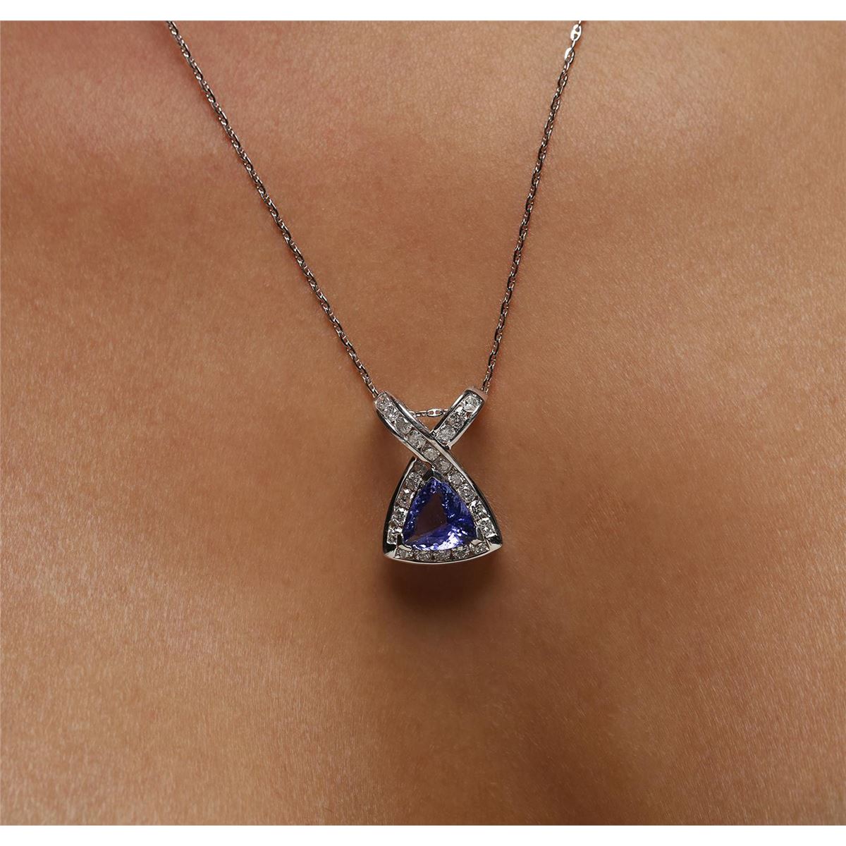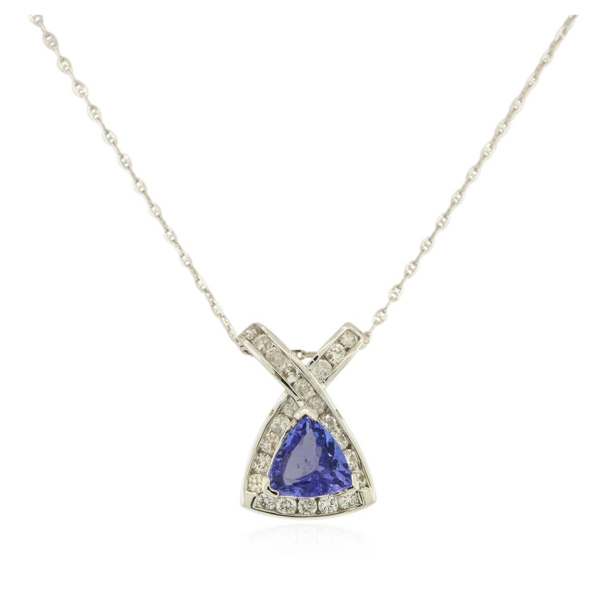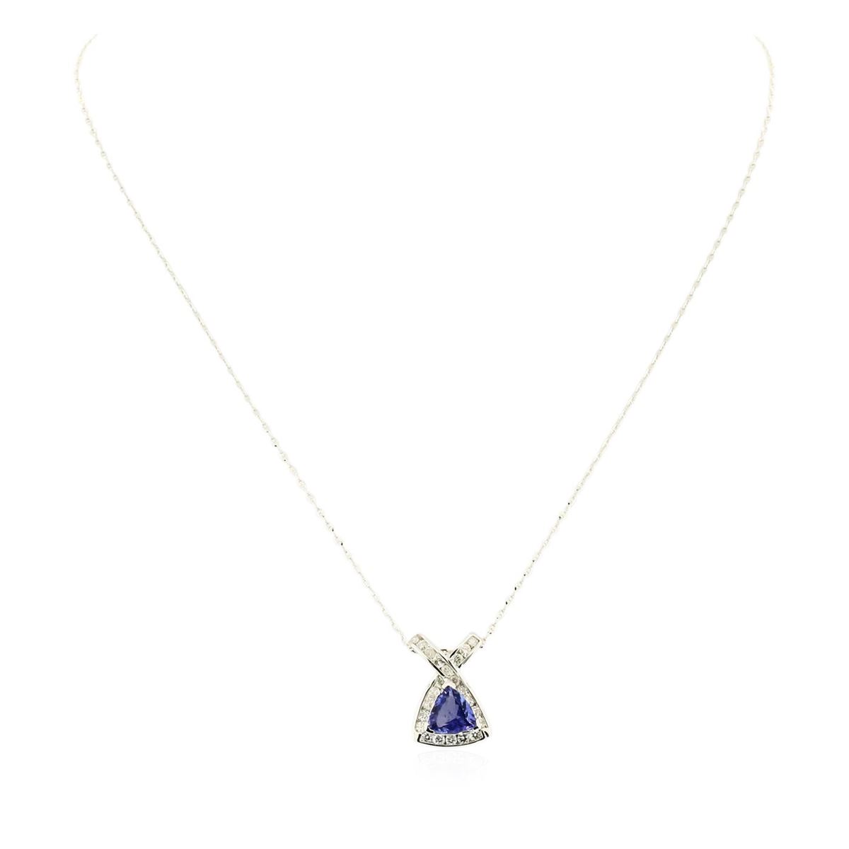 One electronically tested 14KT white gold ladies cast & assembled tanzanite and diamond pendant with chain. The pendant features a tanzanite set within a diamond bezel, completed by diamond set shoulders. The pendant is supported by an eighteen inch length 14KT white gold designer style chain, terminating in a lobster claw clasp. Bright polish finish. Trademark is Orianne. Identified with markings of "14K". Condition is new, good workmanship. Containing: One prong set triangle brilliant cut natural tanzanite, measuring 8.00 x 7.90 x 4.25mm, 6% bulge factor, approximate weight of 1.72ct., clarity is eye clean, type I, medium dark, very slightly grayish, violetish blue color, (GIA vB 6/3), cut is good. Transmitting light with no distortion, transparent. Graded in the setting. Tanzanite is a very rare gemstone that is only found in the country of Tanzania. Originally discovered in 1967. Tiffany & Company, named the stone Tanzanite. It is found in the Usumburu Mountains that border the Umba Valley of northern Tanzania. Tanzanite occurs in gray, brown, violet, blue, reddish-purple, & green. The gem is interesting because of its exceptional pleochroism. Rotated in different directions a tanzanite will exhibit multiple changes of color. Tanzanite has a low tolerance to ultrasonic cleaning, and should not be cleaned using this method. Twenty-Three channel set round brilliant cut diamonds, measuring 2.20 - 2.10 x 1.29mm (depth est.) approximate total weight of 23 Stones = 0.93ct. Graded in the setting. Clarity: I-1 to I-2. Color: H - J. Total Weight of Colored Stones 1.72ct. Total Weight of Diamonds 0.93ct. Total Weight of Pendant With Chain 4.13 grams. AIG Appraised at $5,990.00.