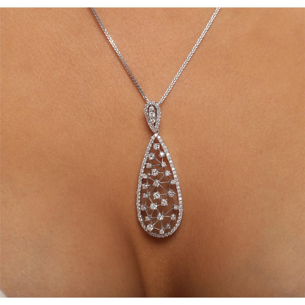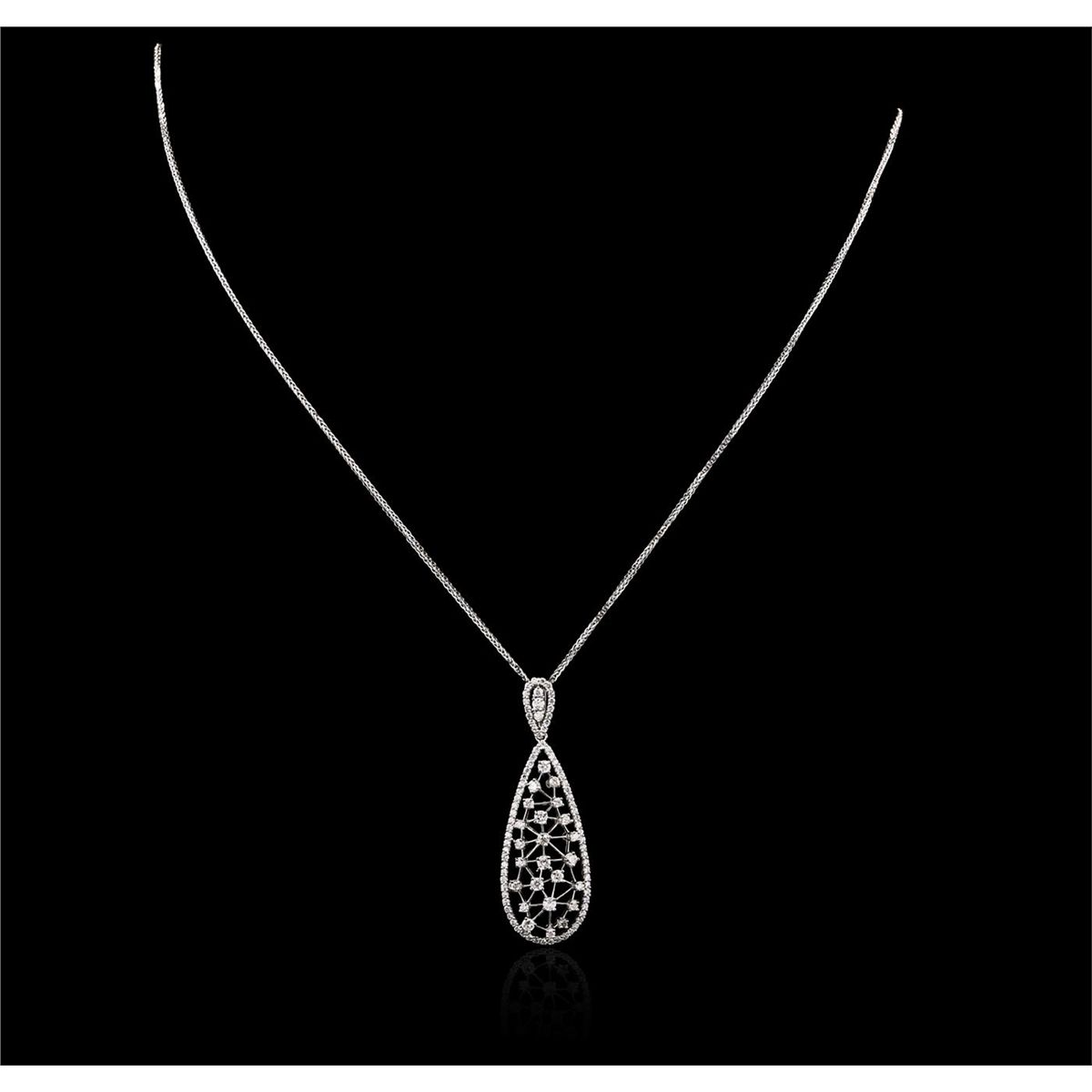 One electronically tested 14KT white gold ladies combination cast & assembled diamond pendant & chain 18.0 long, medium cable link with a lobster claw clasp with a bright polish finish. Identified with markings of 14K. Condition is new. Containing: One Hundred Five prong set round brilliant cut diamonds, measuring 2.20 - 1.10 x 0.99mm (depth est.) approximate total weight of 105 Stones = 1.72ct. Clarity: SI-2 to I-2. Color: I - J, Cut is Good. All diamonds are graded in the mounting, unless otherwise stated. Total Weight of Diamonds 1.72ct. Total Weight of Pendant & Chain 8.30 grams. GGL Appraised at $4,885.00.