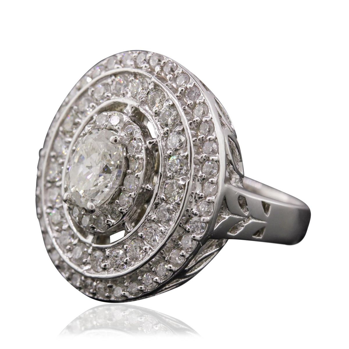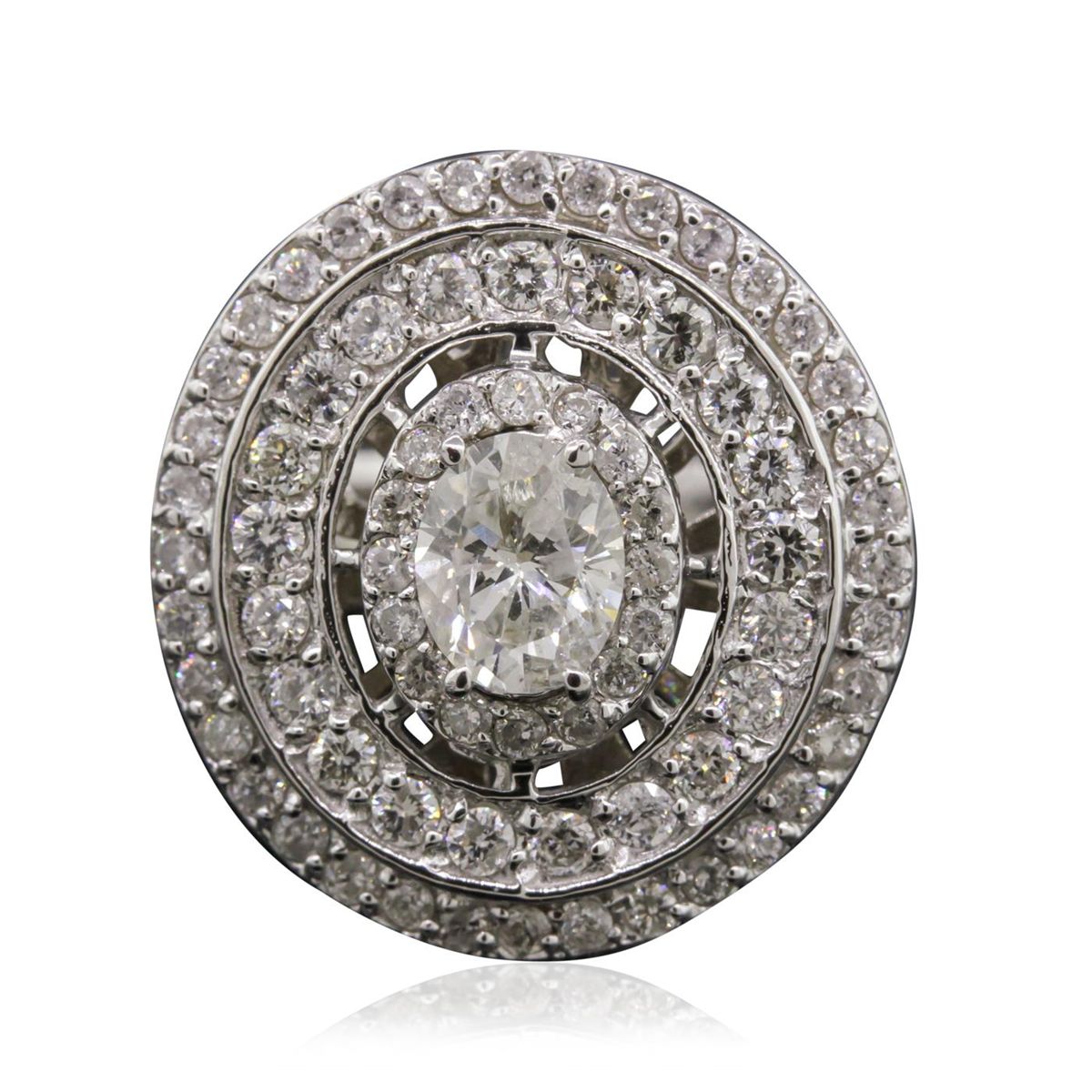 One electronically tested 14KT white gold Ladies engagement ring with a bright polish finish. Condition is new. Identified with markings of "14K". Containing: One prong set oval shaped cut diamond, measuring 6.30 x 5.10 x 3.21mm (depth est.) approximate weight of 0.65ct. Clarity: I-1. Color: J, Cut is Good. Seventy-Two prong set round brilliant cut diamonds, measuring 1.70 - 1.50 x 0.96mm (depth est.) approximate. Total Weight of 72 Stones = 1.07ct. Clarity: I-1 to I-2. Color: H - I, Cut is Good. Total Weight of Diamonds 1.72ct. Total Weight of Ring 6.40 grams. GGL Appraised at $7,050.00.