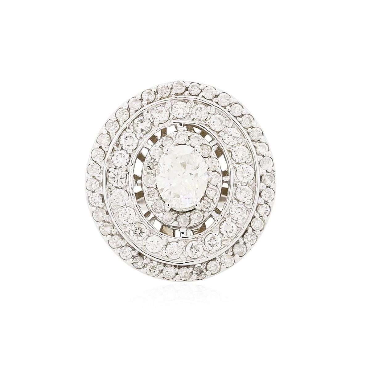 One electronically tested 14KT white gold Ladies engagement ring with a bright polish finish. Condition is new. Identified with markings of "14K". Containing: One prong set oval shaped cut diamond, measuring 6.30 x 5.10 x 3.21mm (depth est.) approximate weight of 0.65ct. Clarity: I-1. Color: J, Cut is Good. Seventy-Two prong set round brilliant cut diamonds, measuring 1.70 - 1.50 x 0.96mm (depth est.) approximate. Total Weight of 72 Stones = 1.07ct. Clarity: I-1 to I-2. Color: H - I, Cut is Good. Total Weight of Diamonds 1.72ct. Total Weight of Ring 6.40 grams. GGL Appraised at $7,050.00.