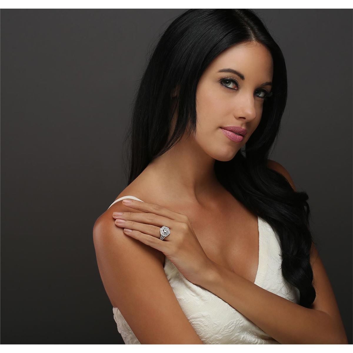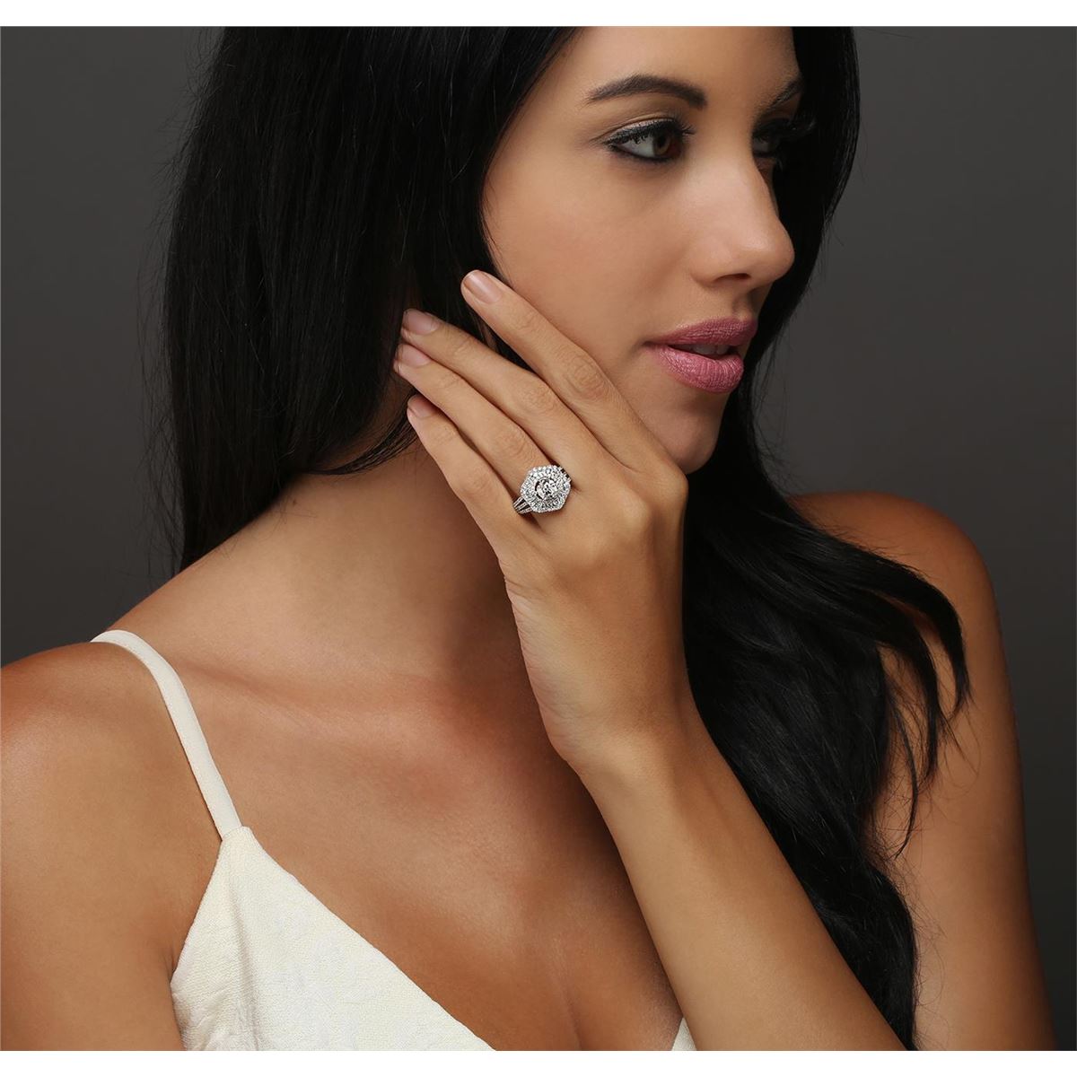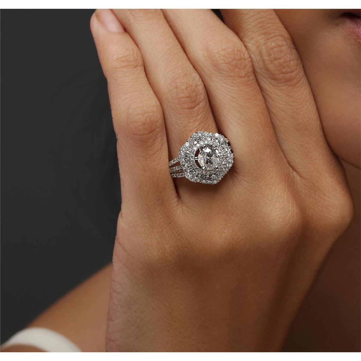 One electronically tested 14KT white gold ladies combination cast & assembled engagement ring with a split shank with a bright polish finish. Identified with markings of "14K". Condition is new. Containing: One prong set round brilliant cut diamond, measuring 6.33 - 6.32 x 3.70mm (depth est.) approximate weight of 0.90ct. Clarity: I-1. Color: K, Cut is Good. One Hundred Fifteen prong set round brilliant cut diamonds, measuring 1.50 - 1.00 x 0.75mm (depth est.) approximate total weight of 115 Stones = 0.82ct. Clarity: SI-2 to I-2. Color: I - J, Cut is Good. All diamonds are graded in the mounting, unless otherwise stated. Total Weight of Diamonds 1.72ct. Total Weight of Ring 6.10 grams. GGL Appraised at $11,100.00.
