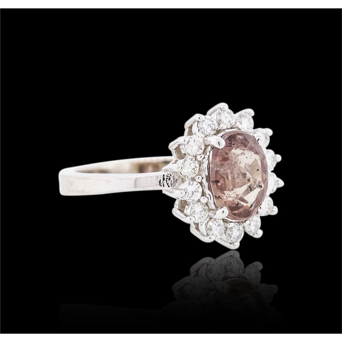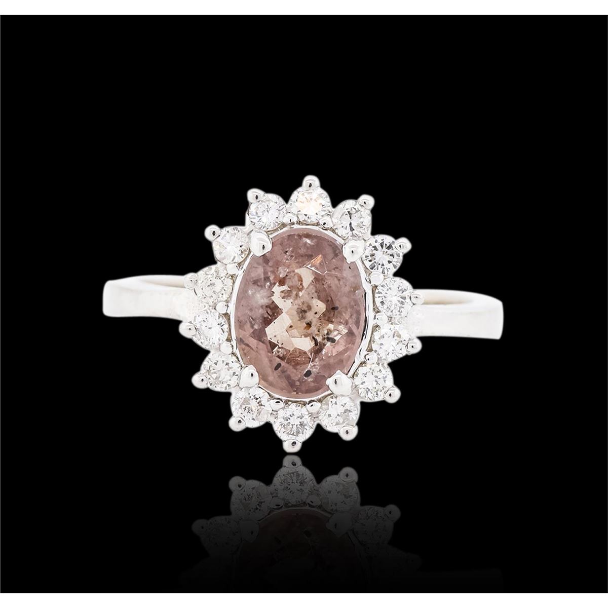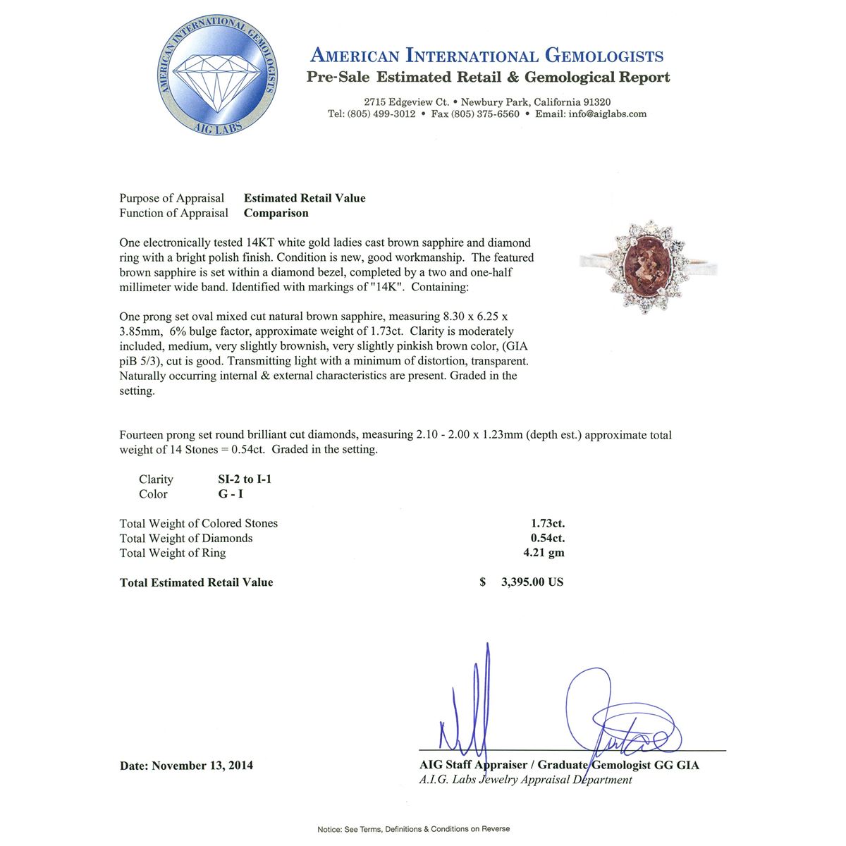 One electronically tested 14KT white gold ladies cast brown sapphire and diamond ring with a bright polish finish. The featured brown sapphire is set within a diamond bezel, completed by a two and one-half millimeter wide band. Identified with markings of "14K". Condition is new, good workmanship. Containing: One prong set oval mixed cut natural brown sapphire, measuring 8.30 x 6.25 x 3.85mm, 6% bulge factor, approximate weight of 1.73ct. Clarity is moderately included, medium, very slightly brownish, very slightly pinkish brown color, (GIA piB 5/3), cut is good. Transmitting light with a minimum of distortion, transparent. Naturally occurring internal & external characteristics are present. Graded in the setting. Fourteen prong set round brilliant cut diamonds, measuring 2.10 - 2.00 x 1.23mm (depth est.) approximate total weight of 14 Stones = 0.54ct. Graded in the setting. Clarity SI-2 to I-1. Color G - I. Total Weight of Colored Stones 1.73ct. Total Weight of Diamonds 0.54ct. Total Weight of Ring 4.21 grams. AIG Appraised at $3,395.00.