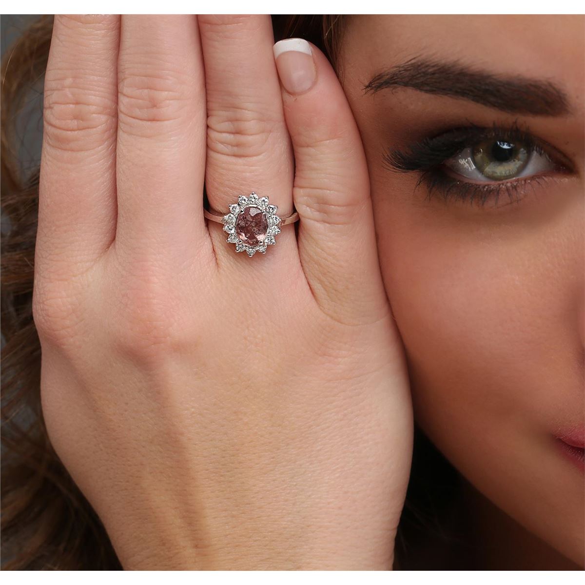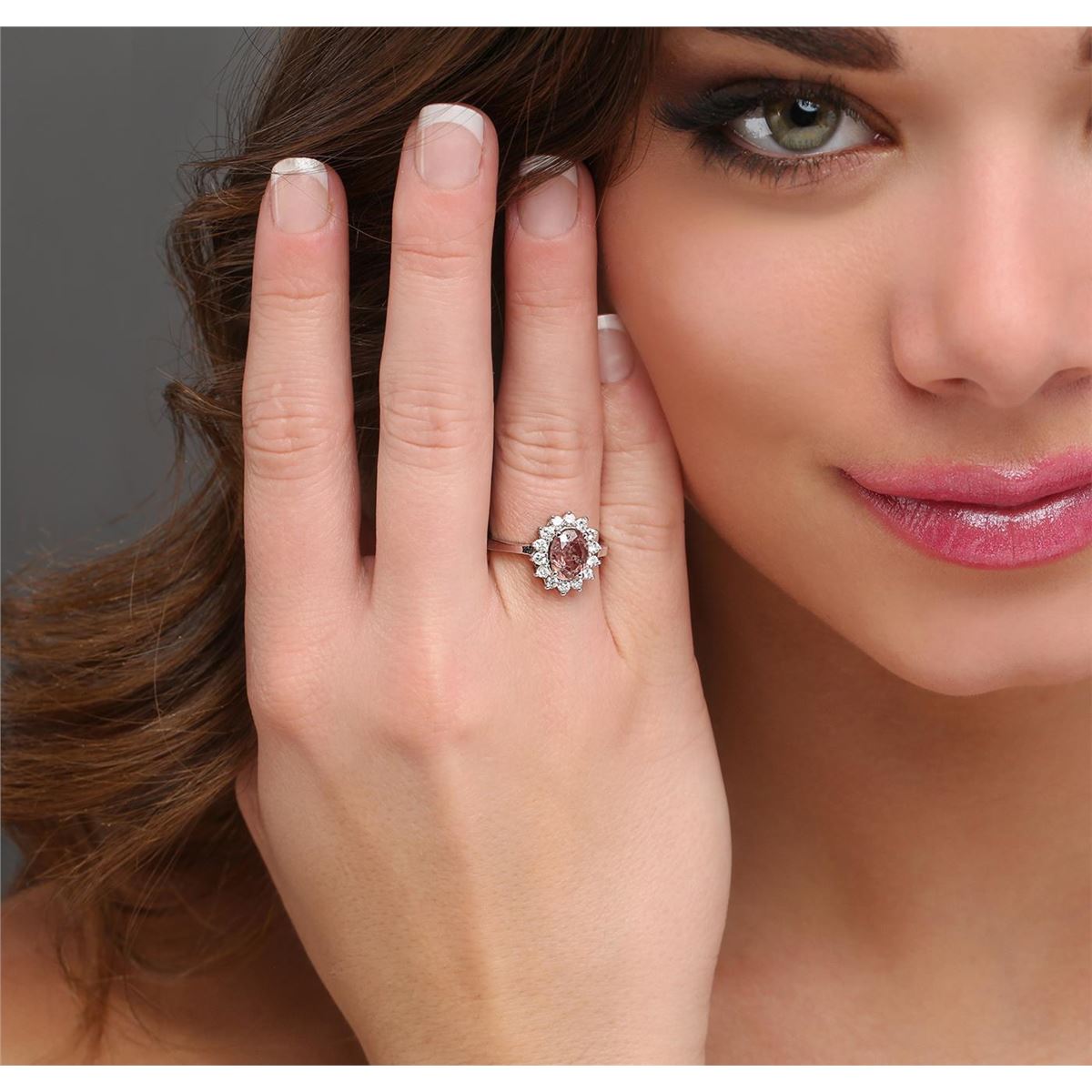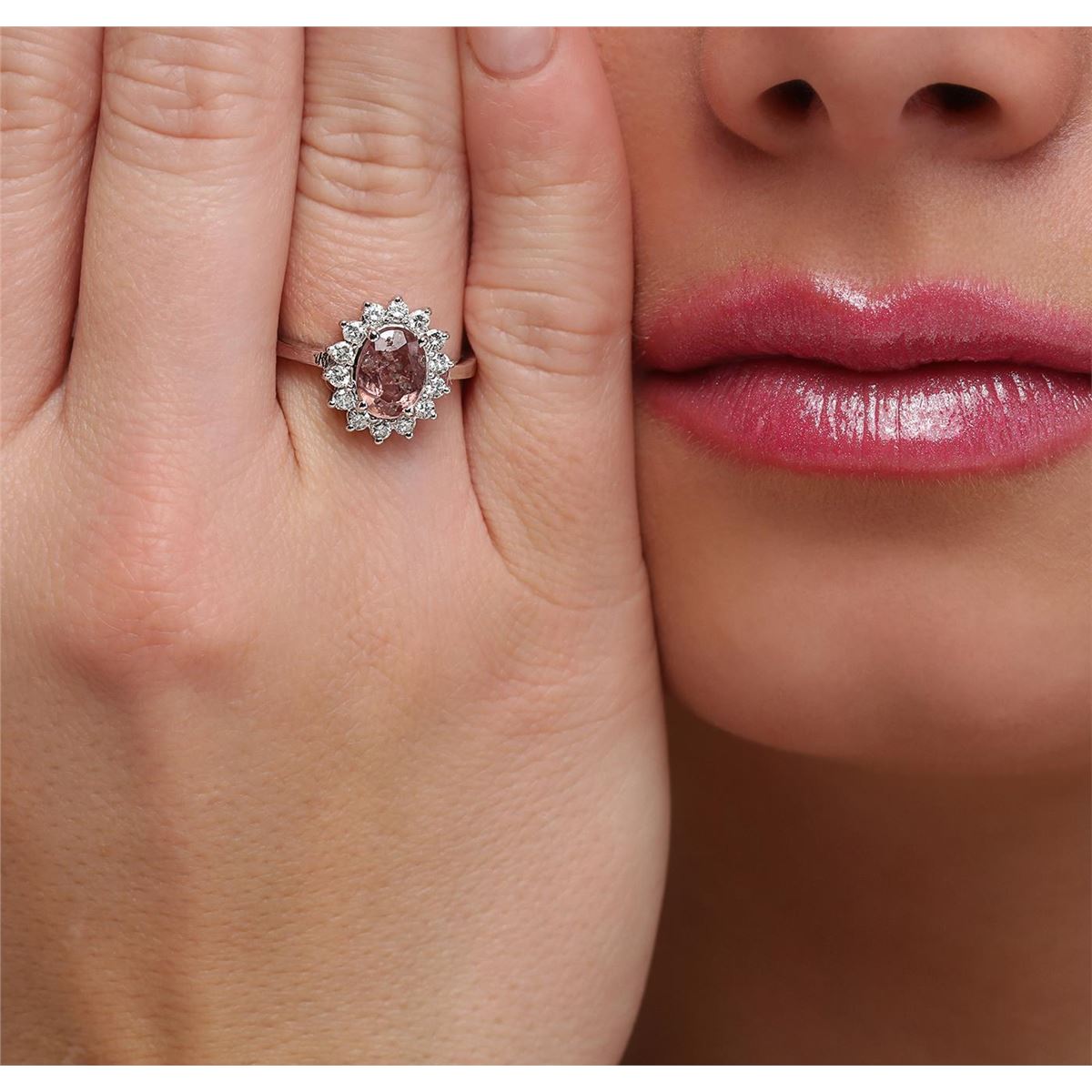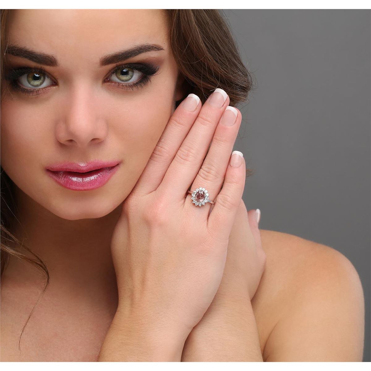 One electronically tested 14KT white gold ladies cast brown sapphire and diamond ring with a bright polish finish. The featured brown sapphire is set within a diamond bezel, completed by a two and one-half millimeter wide band. Identified with markings of "14K". Condition is new, good workmanship. Containing: One prong set oval mixed cut natural brown sapphire, measuring 8.30 x 6.25 x 3.85mm, 6% bulge factor, approximate weight of 1.73ct. Clarity is moderately included, medium, very slightly brownish, very slightly pinkish brown color, (GIA piB 5/3), cut is good. Transmitting light with a minimum of distortion, transparent. Naturally occurring internal & external characteristics are present. Graded in the setting. Fourteen prong set round brilliant cut diamonds, measuring 2.10 - 2.00 x 1.23mm (depth est.) approximate total weight of 14 Stones = 0.54ct. Graded in the setting. Clarity SI-2 to I-1. Color G - I. Total Weight of Colored Stones 1.73ct. Total Weight of Diamonds 0.54ct. Total Weight of Ring 4.21 grams. AIG Appraised at $3,395.00.