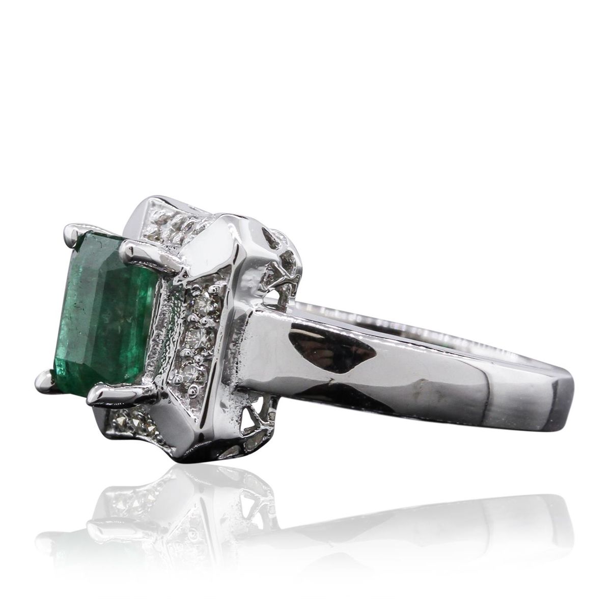 One electronically tested 14KT white gold ladies cast emerald and diamond ring with a bright polish finish. Condition is new, good workmanship. The featured emerald is set within a diamond lattice gallery, completed by a two and one-half millimeter wide band. Identified with markings of "14K". Containing: One prong set rectangular step cut natural emerald, measuring 7.80 x 5.85 x 4.30mm, 8% bulge factor, approximate weight of 1.73ct, clarity is heavily included, type III, dark, moderately strong, very slightly bluish green color, (GIA vslbG 7/4), cut is good. Transmitting light somewhat diffusely, translucent. Naturally occurring internal & external characteristics are present. Indications of oil residue. Graded in the setting. Twelve prong set round brilliant cut diamonds, measuring 1.60 - 1.40 x 0.90mm (depth est.) approximate total weight of 12 Stones = 0.24ct. Graded in the setting. Clarity SI-2 to I-1 Color J - L Total Weight of Colored Stones 1.73ct. Total Weight of Diamonds 0.24ct. Total Weight of Ring 5.90 grams. AIG Appraised at $3,000.00.