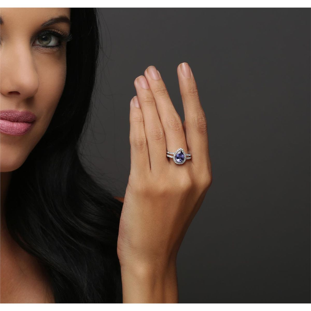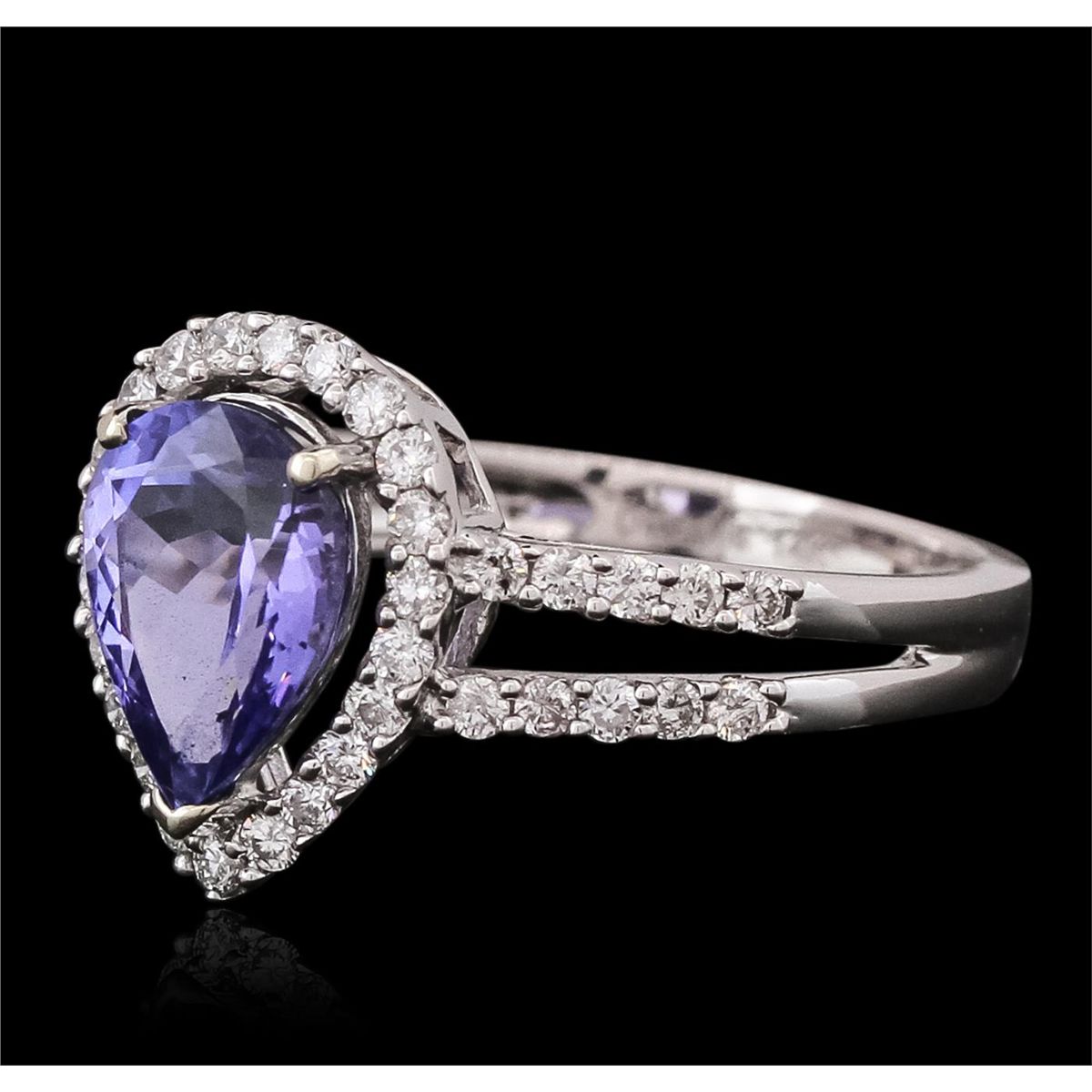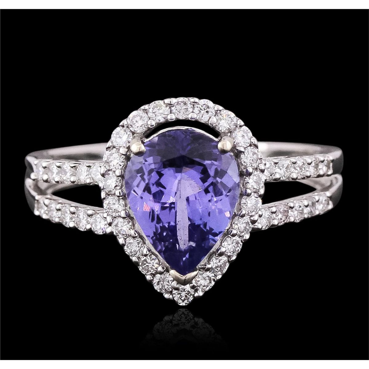 One electronically tested 14KT white gold ladies combination cast & assembled tanzanite and diamond ring with a split shank with a bright polish finish. Identified with markings of "14K". Condition is new. Containing: One prong set pear modified brilliant cut natural tanzanite, measuring 8.00 x 7.12 x 4.54mm, approximate weight of 1.73ct., clarity is eye clean, type I, medium, moderately strong, violet color, (GIA V 5/4), cut is good. Forty-Four prong set round brilliant cut diamonds, measuring 1.30 - 1.30 x 0.78mm (depth est.) approximate total weight of 44 Stones = 0.35ct. Clarity: SI-2 to I-2. Color: I - J, Cut is Good. Colored gemstones are presumed to have been subjected to commonly used enhancement processes. All diamonds and colored gemstones are graded in the mounting, unless otherwise stated. Total Weight of Colored Stones 1.73ct. Total Weight of Diamonds 0.35ct. Total Weight of Ring 3.10 grams. GGL Appraised at $4,330.00.
