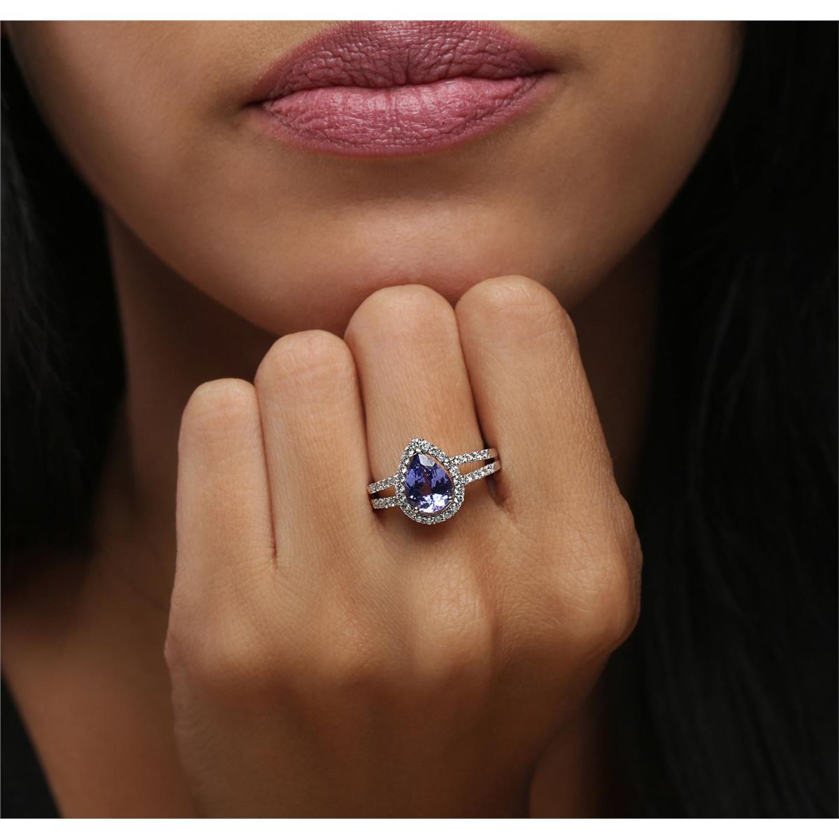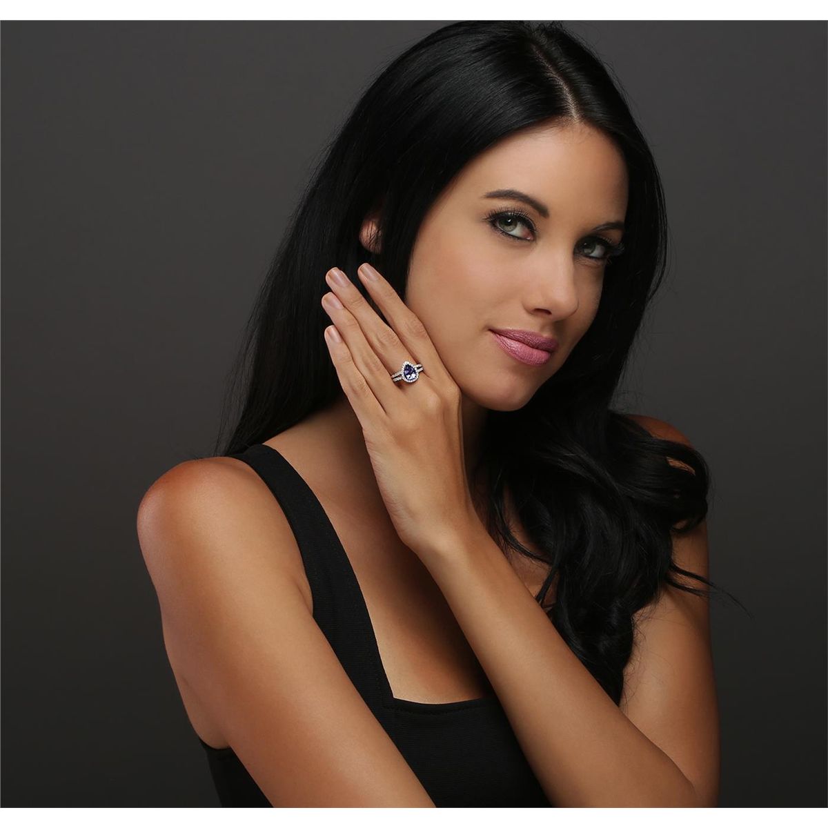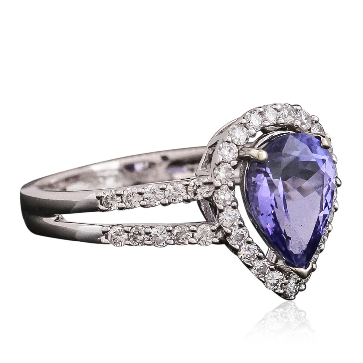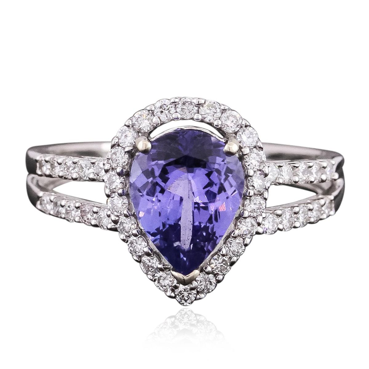 One electronically tested 14KT white gold ladies combination cast & assembled tanzanite and diamond ring with a split shank with a bright polish finish. Identified with markings of "14K". Condition is new. Containing: One prong set pear modified brilliant cut natural tanzanite, measuring 8.00 x 7.12 x 4.54mm, approximate weight of 1.73ct., clarity is eye clean, type I, medium, moderately strong, violet color, (GIA V 5/4), cut is good. Forty-Four prong set round brilliant cut diamonds, measuring 1.30 - 1.30 x 0.78mm (depth est.) approximate total weight of 44 Stones = 0.35ct. Clarity: SI-2 to I-2. Color: I - J, Cut is Good. Colored gemstones are presumed to have been subjected to commonly used enhancement processes. All diamonds and colored gemstones are graded in the mounting, unless otherwise stated. Total Weight of Colored Stones 1.73ct. Total Weight of Diamonds 0.35ct. Total Weight of Ring 3.10 grams. GGL Appraised at $4,330.00.