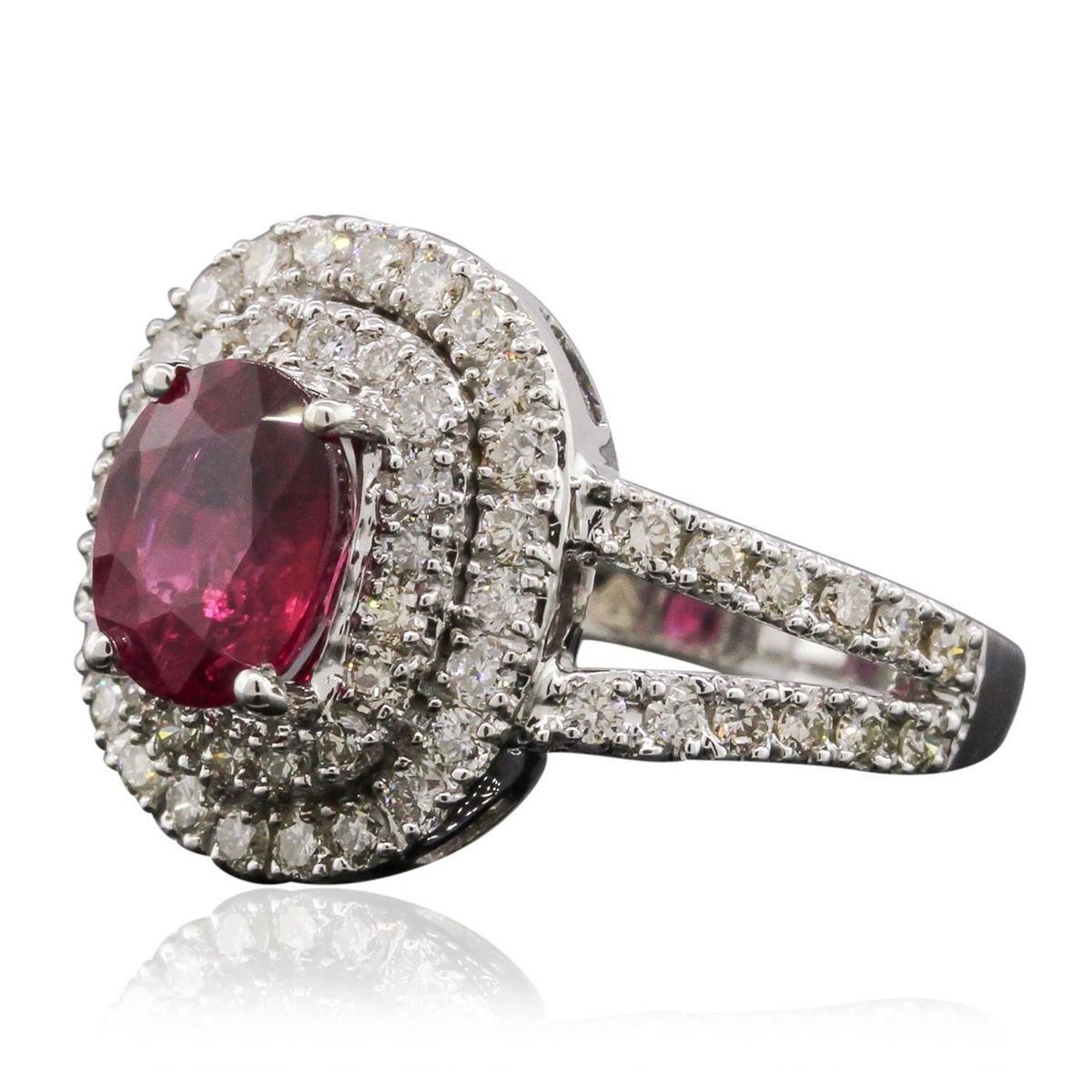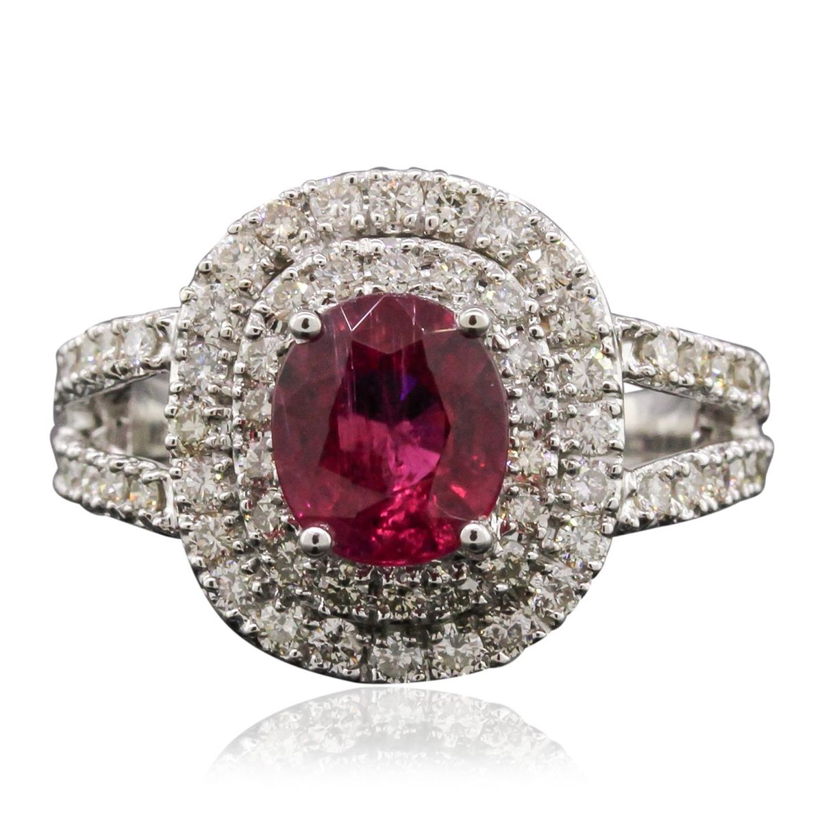 One electronically tested 14KT white gold Ladies combination cast & assembled ring with a bright polish finish. Condition is new. Identified with markings of "14K". Containing: Sixty-Six prong set round brilliant cut diamonds, measuring 1.40 - 1.40 x 0.84mm (depth est.) approximate. Total Weight of 66 Stones = 1.01ct. Clarity: I-1 to I-3. Color: K - L, Cut is Good. One prong set oval modified brilliant cut natural pink tourmaline, measuring 8.00 x 7.00 x 4.70mm, exact weight 1.73ct., clarity is eye clean, type II, medium, moderately strong, reddish purple color, (GIA rP 5/4), cut is very good. Colored gemstones are presumed to have been subjected to commonly used color/clarity enhancement processes. Total Weight of Colored Stones 1.73ct. Total Weight of Diamonds 1.01ct. Total Weight of Ring 5.50 grams. GGL Appraised at $4,580.00.