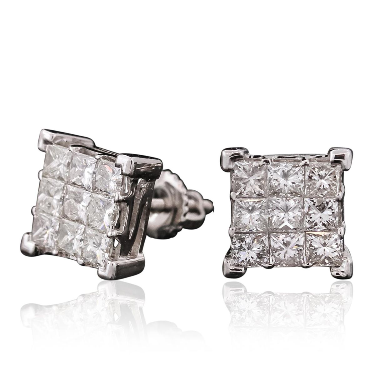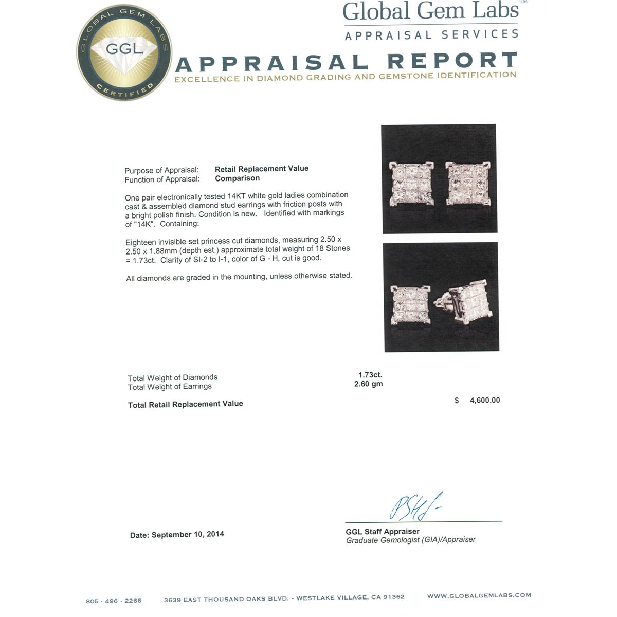 One pair electronically tested 14KT white gold ladies combination cast & assembled diamond stud earrings with friction posts with a bright polish finish. Identified with markings of "14K". Condition is new. Containing: Eighteen invisible set princess cut diamonds, measuring 2.50 x 2.50 x 1.88mm (depth est.) approximate total weight of 18 Stones = 1.73ct. Clarity: SI-2 to I-1. Color: G - H, Cut is Good. All diamonds are graded in the mounting, unless otherwise stated. Total Weight of Diamonds 1.73ct. Total Weight of Earrings 2.60 grams. GGL Appraised at $4,600.00.