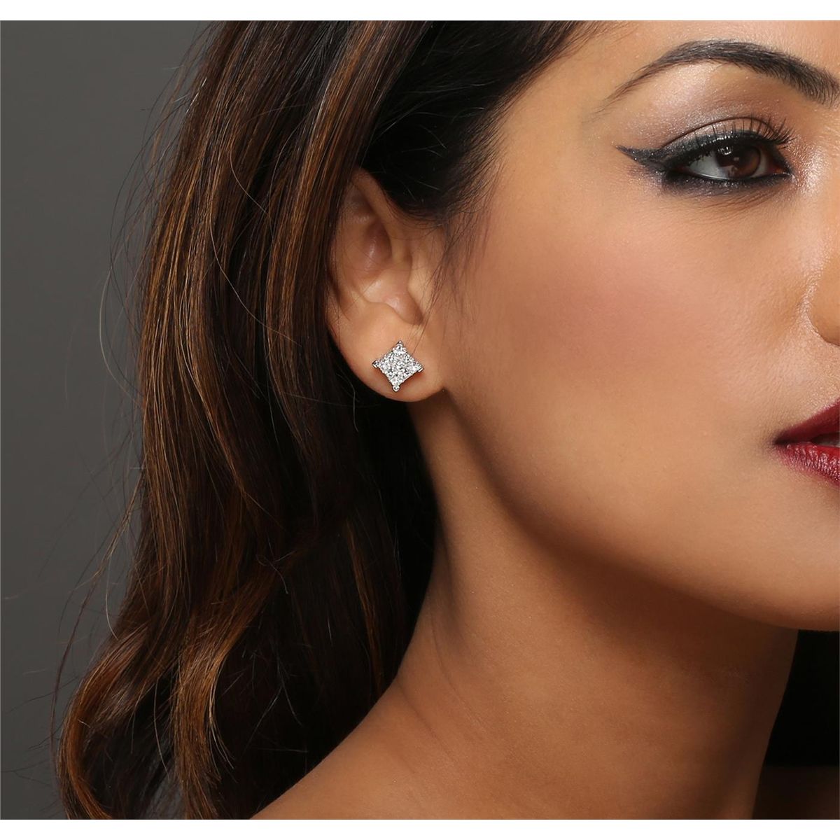 One pair electronically tested 14KT white gold ladies combination cast & assembled diamond stud earrings with friction posts with a bright polish finish. Identified with markings of "14K". Condition is new. Containing: Eighteen invisible set princess cut diamonds, measuring 2.50 x 2.50 x 1.88mm (depth est.) approximate total weight of 18 Stones = 1.73ct. Clarity: SI-2 to I-1. Color: G - H, Cut is Good. All diamonds are graded in the mounting, unless otherwise stated. Total Weight of Diamonds 1.73ct. Total Weight of Earrings 2.60 grams. GGL Appraised at $4,600.00.