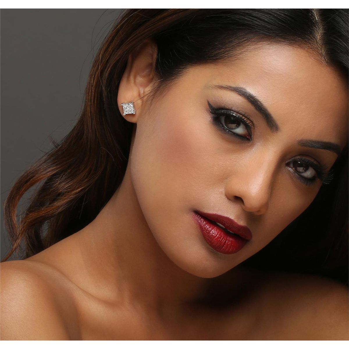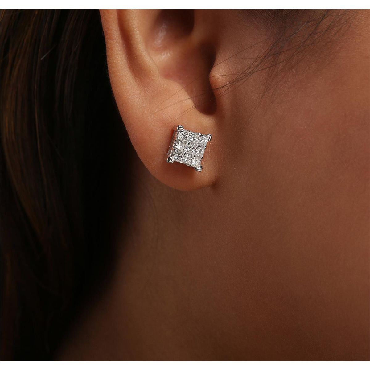One pair electronically tested 14KT white gold ladies combination cast & assembled diamond stud earrings with friction posts with a bright polish finish. Identified with markings of "14K". Condition is new. Containing: Eighteen invisible set princess cut diamonds, measuring 2.50 x 2.50 x 1.88mm (depth est.) approximate total weight of 18 Stones = 1.73ct. Clarity: SI-2 to I-1. Color: G - H, Cut is Good. All diamonds are graded in the mounting, unless otherwise stated. Total Weight of Diamonds 1.73ct. Total Weight of Earrings 2.60 grams. GGL Appraised at $4,600.00.