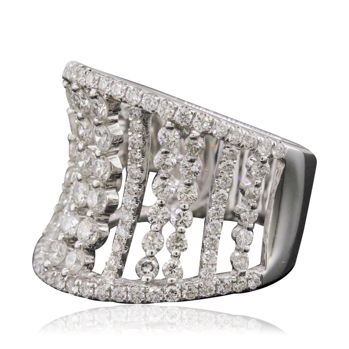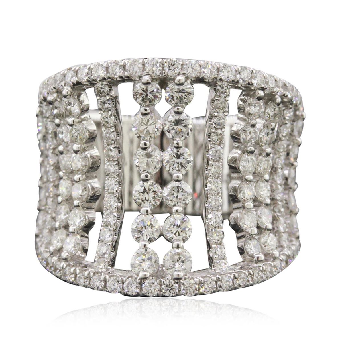 One electronically tested 14KT white gold ladies combination cast & assembled diamond ring with a tapered shank with a bright polish finish. Identified with markings of "14K". Condition is new. Containing: Thirty-Six prong set round brilliant cut diamonds, measuring 2.20 - 1.60 x 1.14mm (depth est.) approximate total weight of 36 Stones = 0.90ct. Clarity: SI-1 to SI-2. Color: I - J, Cut is Good. One Hundred Three prong set round brilliant cut diamonds, measuring 1.30 - 1.30 x 0.78mm (depth est.) approximate total weight of 103 Stones = 0.82ct. Clarity: SI-2 to I-1. Color: I - J, Cut is Good. All diamonds are graded in the mounting, unless otherwise stated. Total Weight of Diamonds 1.73ct. Total Weight of Ring 9.10 grams. GGL Appraised at $8,090.00.