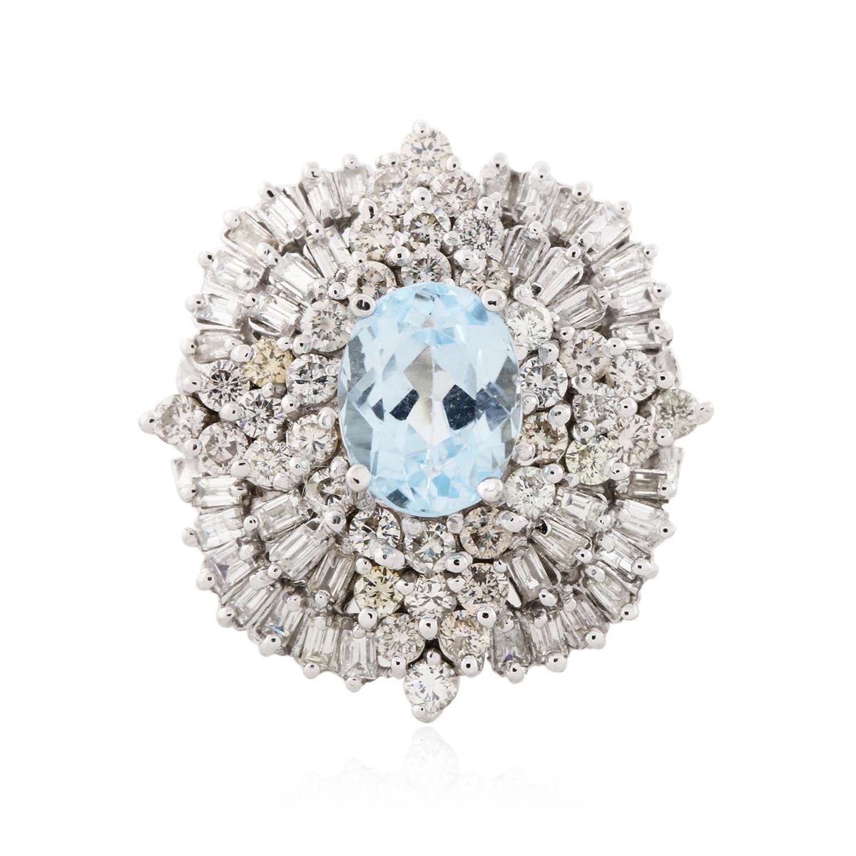 One electronically tested 14KT white gold ladies cast aquamarine and diamond ring with a bright polish finish. Condition is good. The featured aquamarine is set within a floral diamond bezel, supported by split shoulders and completed by a three millimeter wide band. Identified with markings of "14K". Containing: One prong set oval mixed cut natural aquamarine, measuring 9.00 x 7.00 x 4.55mm, 10% bulge factor, approximate weight of 1.74ct., clarity is eye clean, type I, medium, very slightly grayish, very slightly greenish blue color, (GIA vs1gB 5/3), cut is good. Transmitting light with no distortion, transparent. Graded in the setting. Thirty-eight prong set round brilliant cut diamonds, measuring 2.00 - 1.90 x 1.17mm (depth est.) approximate total weight of 38 Stones = 1.13ct. Graded in the setting. Clarity SI-1 to I-1. Color H - J. Forty prong set baguette cut diamonds, measuring from 2.10 x 1.10 x 0.77mm (depth est.) to 2.20 x 1.20 x 0.84mm (depth est.) approximate total weight of 40 Stones = 0.77ct. Graded in the setting. Clarity VS-1 to SI-1. Color G - I. Total Weight of Colored Stones 1.74ct. Total Weight of Diamonds 1.90ct. Total Weight of Ring 10.10gm. AIG Appraised at $9,100.00.
