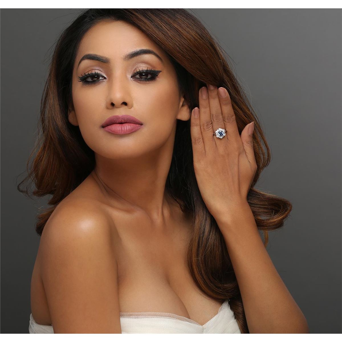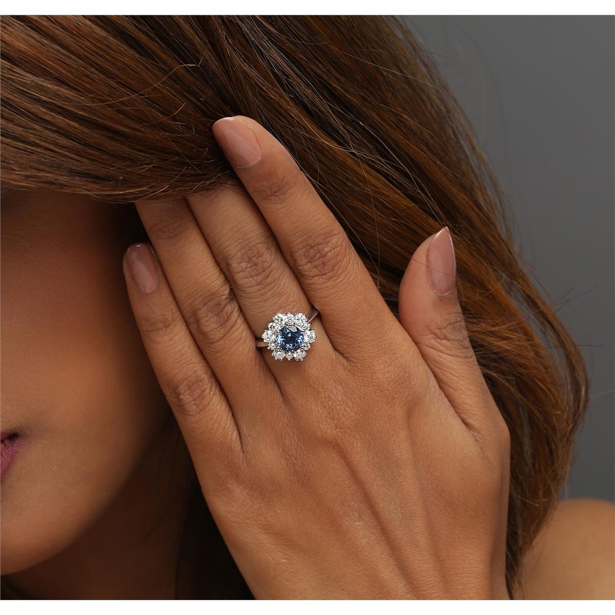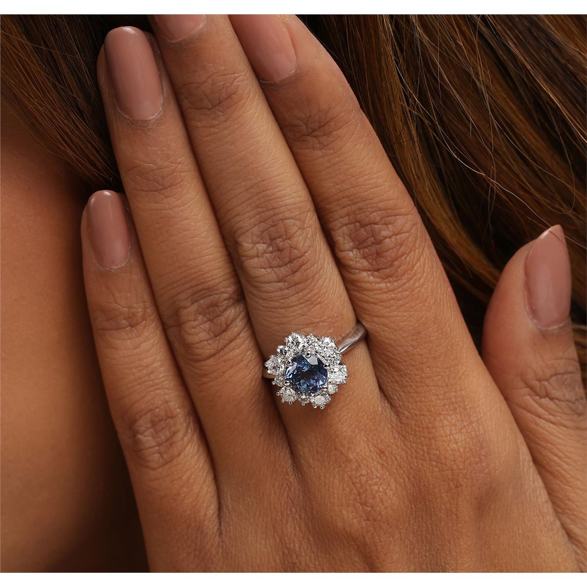 One electronically tested 14KT white gold ladies combination cast & assembled tanzanite and diamond ring with a flat shank with a bright polish finish. Identified with markings of "K14". Condition is new. Containing: One prong set round modified brilliant cut natural tanzanite, measuring 6.99 - 6.95 x 5.33 mm, approximate weight of 1.74ct., clarity is eye clean, type I, medium light, very slightly grayish, violet color, (GIA V 4/3), cut is good. Six prong set round brilliant cut diamonds, measuring 3.00 - 3.00 x 1.80mm (depth est.) approximate total weight of 6 Stones = 0.59ct. Clarity: SI-2 to I-1. Color: I - J, Cut is Good. Six prong set round brilliant cut diamonds, measuring 2.20 - 2.20 x 1.32mm (depth est.) approximate total weight of 6 Stones = 0.23ct. Clarity: SI-1 to SI-2. Color: I - J, Cut is Good. Colored gemstones are presumed to have been subjected to commonly used enhancement processes. All diamonds and colored gemstones are graded in the mounting, unless otherwise stated. Total Weight of Colored Stones 1.74ct. Total Weight of Diamonds 0.83ct. Total Weight of Ring 4.60 grams. GGL Appraised at $6,075.00.